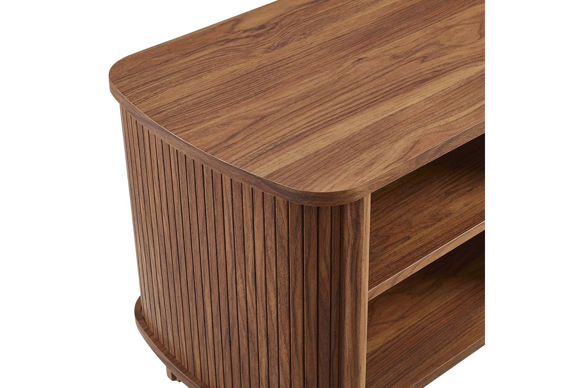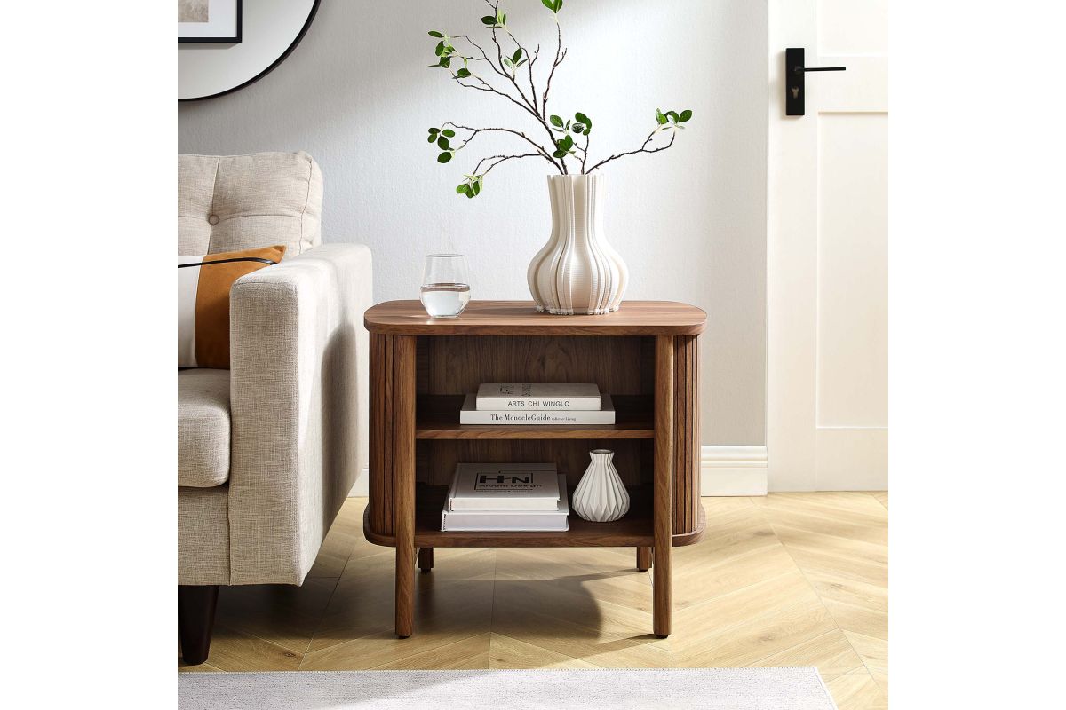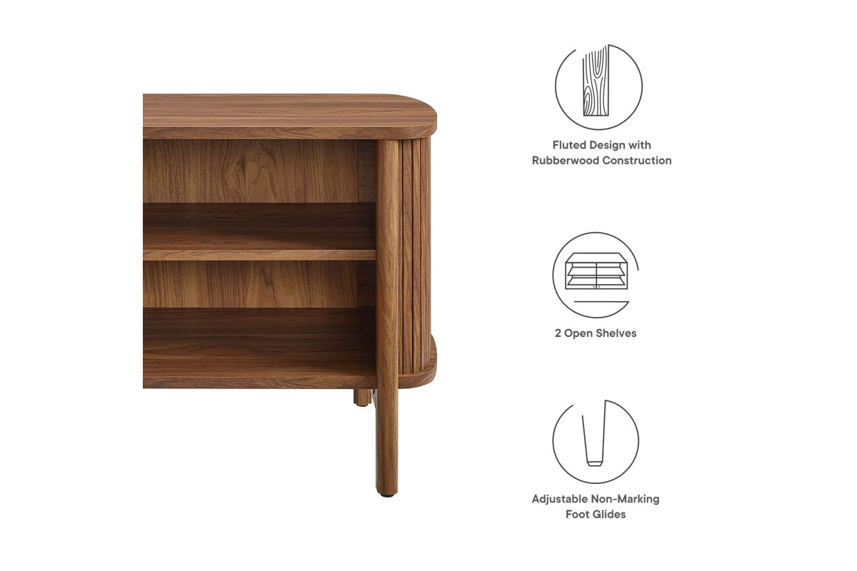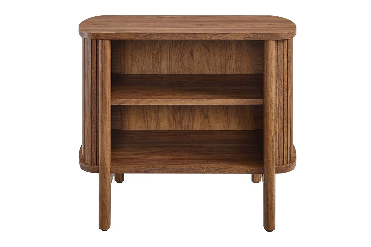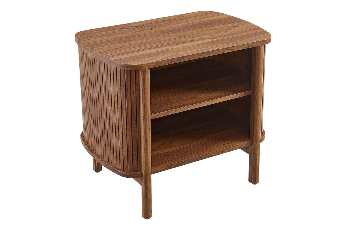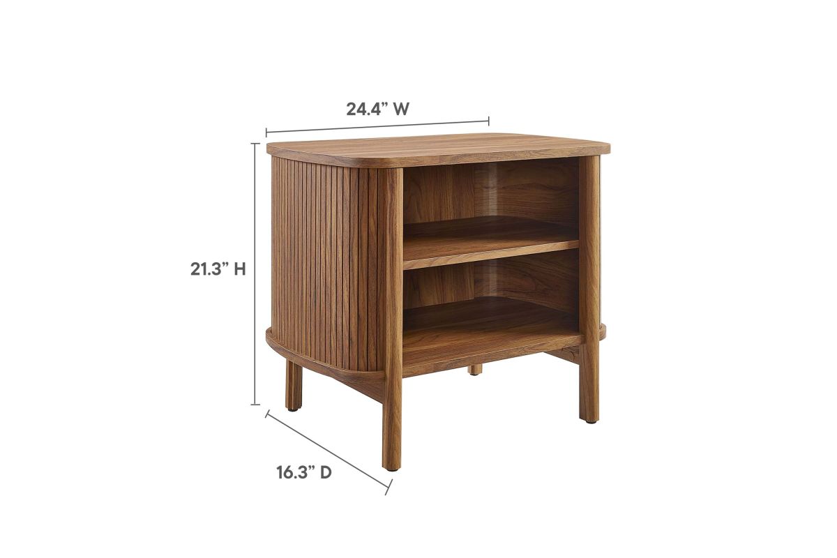 Revolutionize your bedroom or apartment decor with the Cadence Open Storage Nightstand. This modern nightstand is perfect at your bedside, offering both style and functionality. The unique design features rounded corners and fluted details, adding a stylish flair to any space. Crafted from high-quality materials such as rubberwood, particleboard, and MDF, the Cadence boho nightstand is designed for longevity and showcases a beautiful wood grain laminate, enhancing the organic aesthetics of your bedroom or living space. This open shelf nightstand has two storage compartments to comfortably support books, decorative items, or nighttime essentials. It includes non-marking foot glides for added stability. The Cadence fluted nightstand is a multi-functional piece that elegantly combines practicality with elegance and is versatile enough to serve as an open shelf side table, living room end table, or small accent table. Assembly required. Tabletop Weight Capacity: 79 lbs. Each Shelf Weight Capacity: 57 lbs.