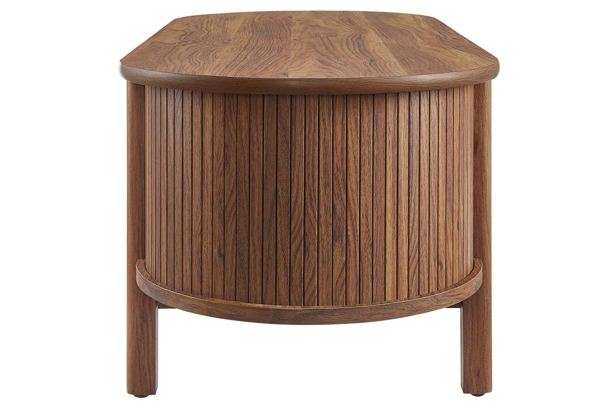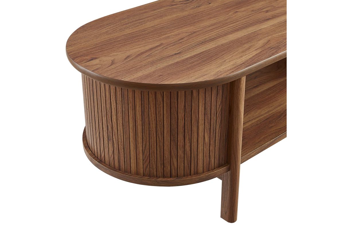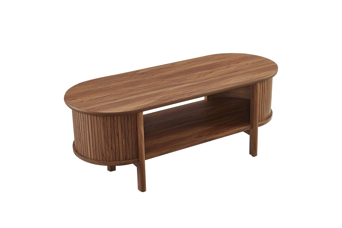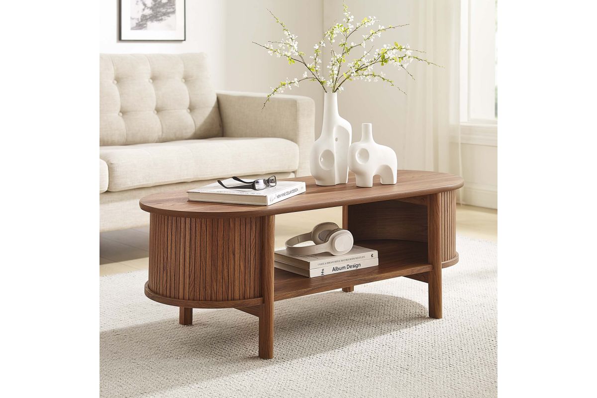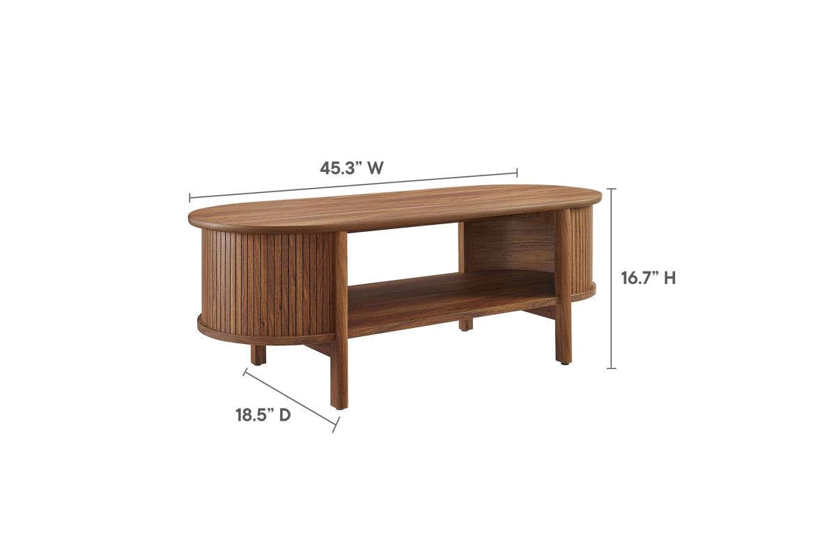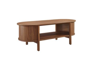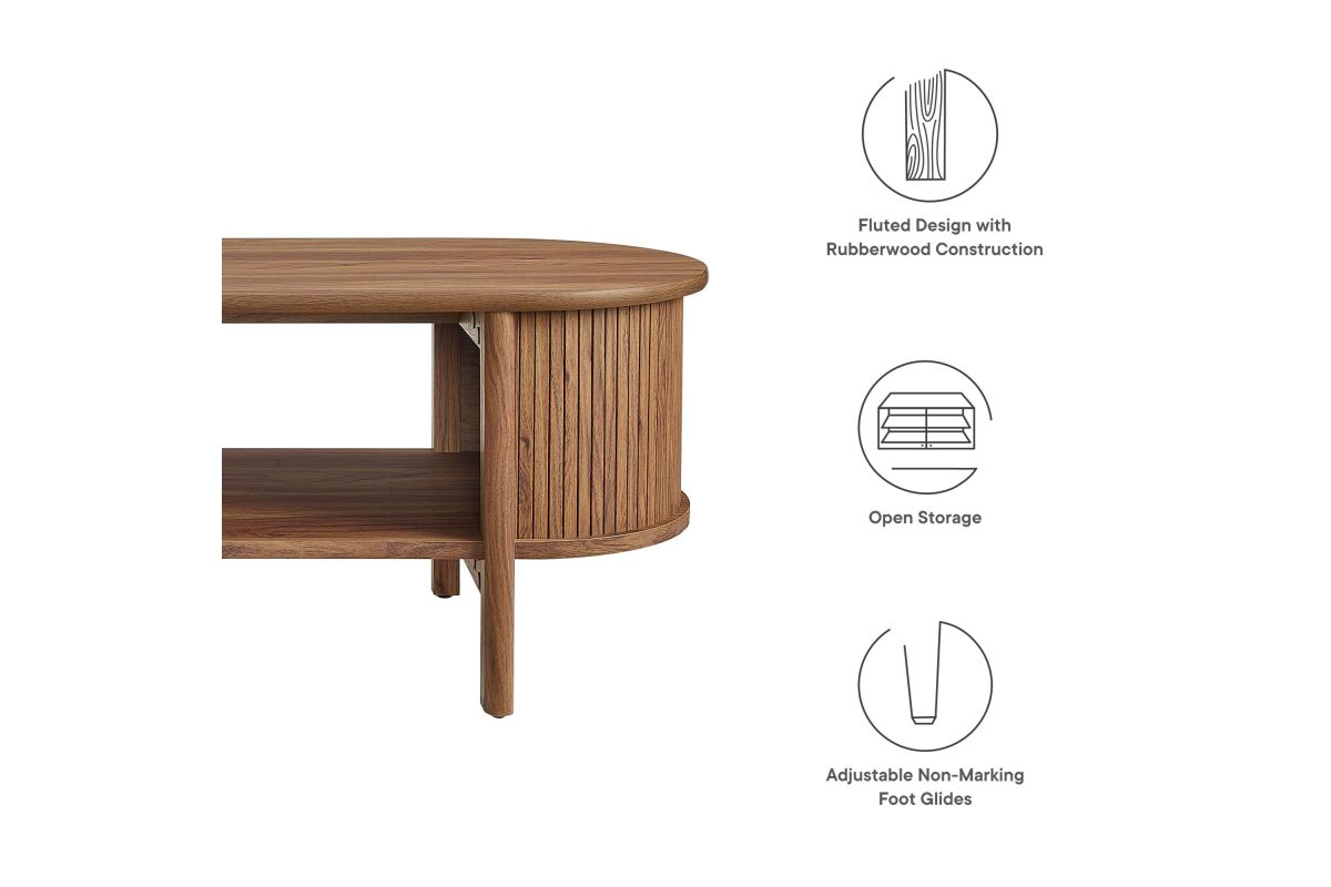 Revolutionize your home or apartment decor with the Cadence Coffee Table. This mid-century modern piece is perfect as a central table in your living room, offering both style and functionality. The unique design features curved edges and fluted details, adding a stylish flair to any space. Crafted from high-quality materials such as rubberwood, particleboard, and MDF, the Cadence coffee table is designed for longevity and showcases a beautiful wood grain laminate, enhancing the organic aesthetics of your living or lounge area. This oval coffee table is perfect for various uses, comfortably supporting books, decorative items, or beverages. It includes an open shelf underneath for displaying or organizing home decor, making it an excellent open storage coffee table as well as a modern accent table. Adjustable non-marking foot glides provide added stability. With an oval shape and chic silhouette, the Cadence fluted coffee table is a great living room essential that complements a variety of decors. Assembly required. Tabletop Weight Capacity: 169 lbs.
