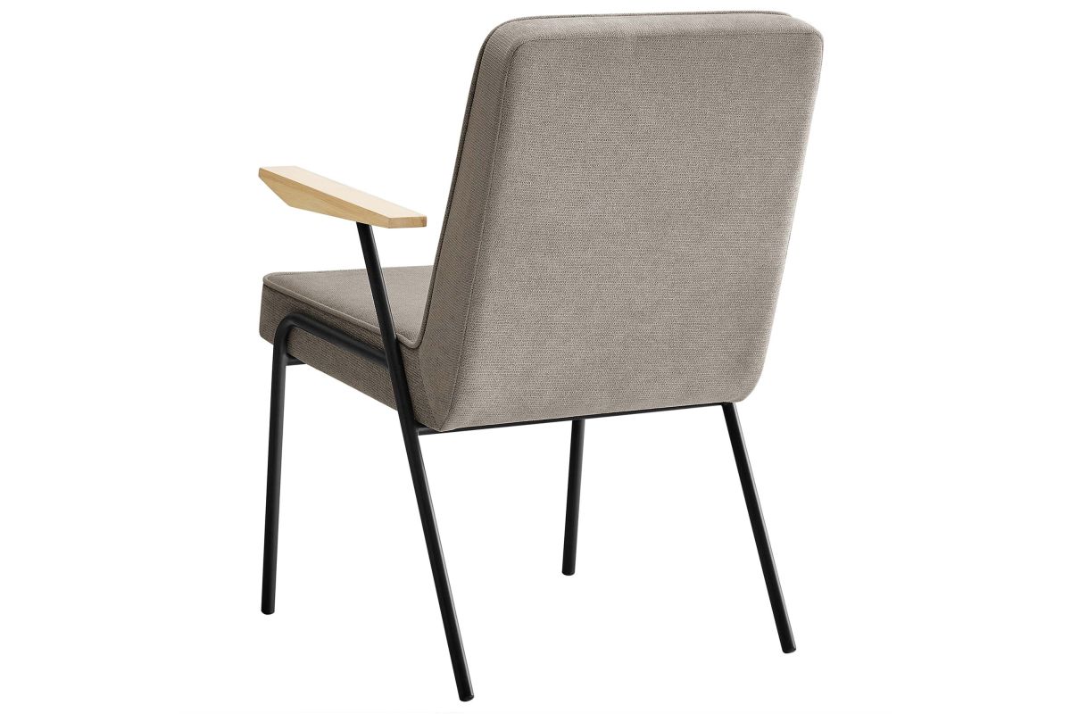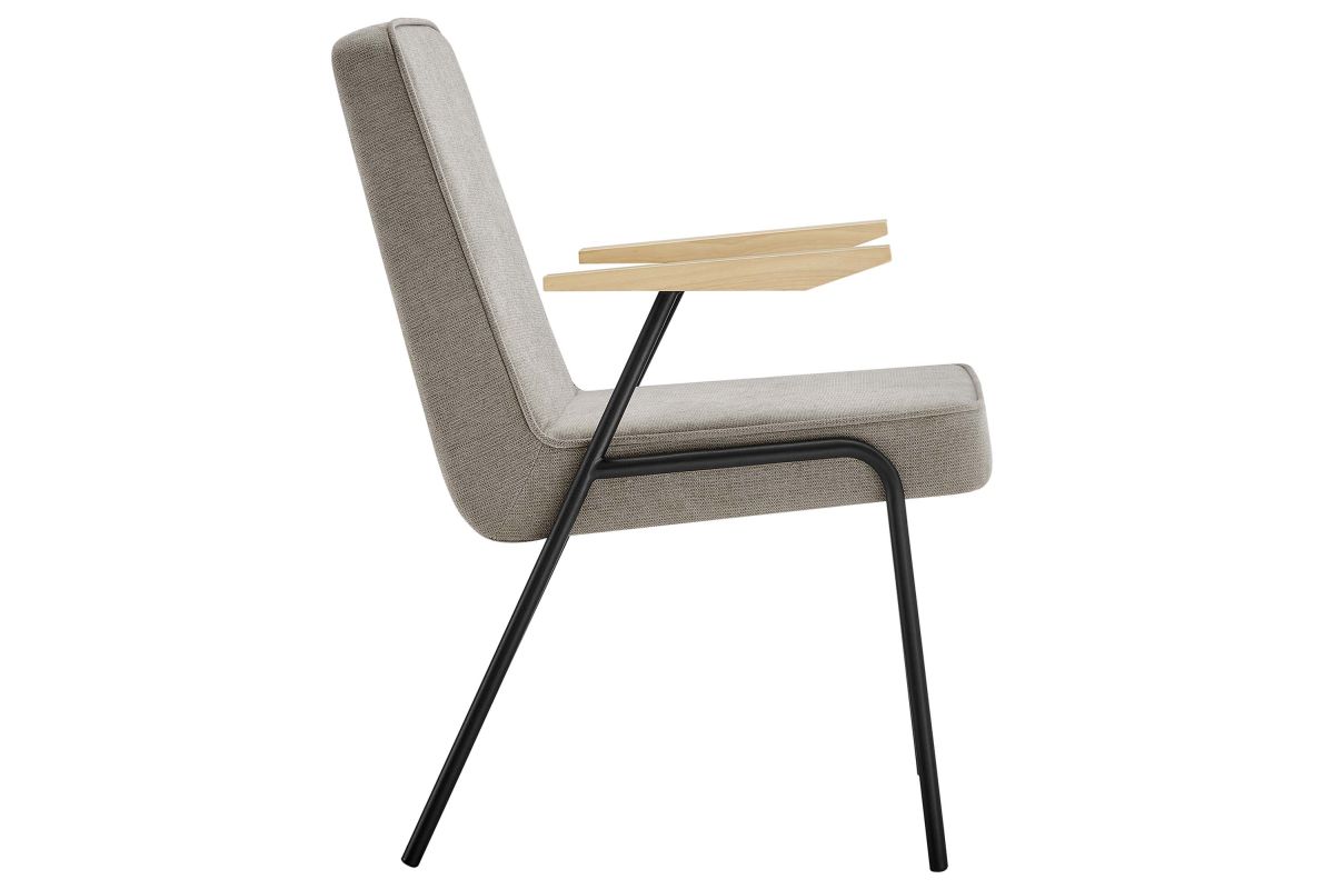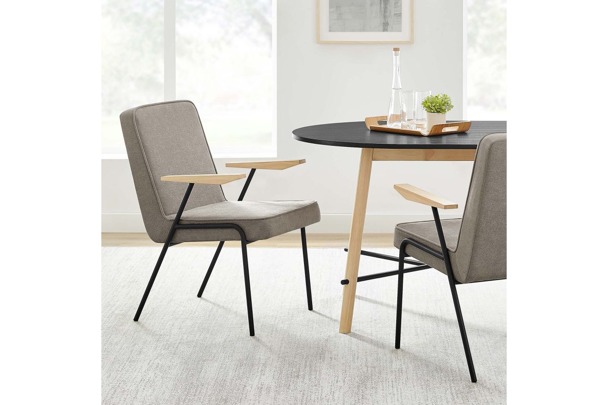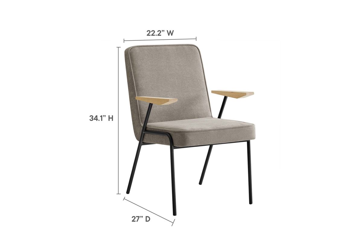 Perfect for various settings in the dining room or living room, the Vista Dining Chair offers a seamless blend of functionality and style. Its powder-coated metal frame grants durability, while the wooden arms add a touch of warmth, epitomizing mid-century modern flair. This metal and wood armchair has an upholstered fabric seat, complete with dense foam padding, French piping trim, and a comfortable recline, inviting you to sit back and relax. Equipped with non-marking foot glides, the Vista upholstered dining chair with arms protects your floors from scratches. Whether used as a dining armchair, an accent chair in the living room, or a waiting room chair, Vista stands out for its comfort and versatility, making it an essential modern addition to any space. Assembly required. Weight Capacity: 500 lbs.
