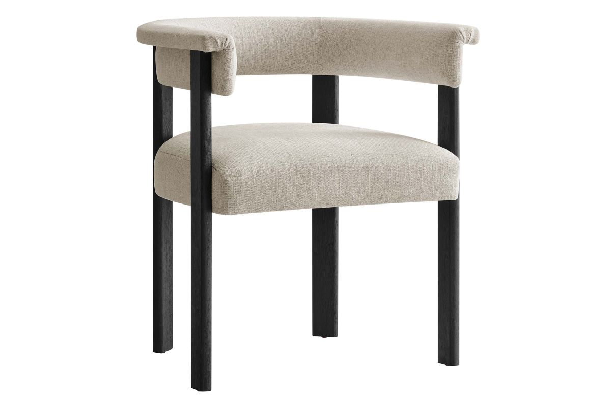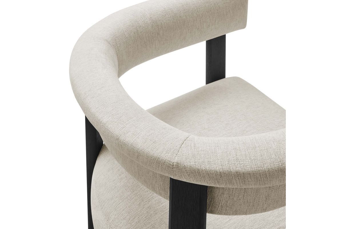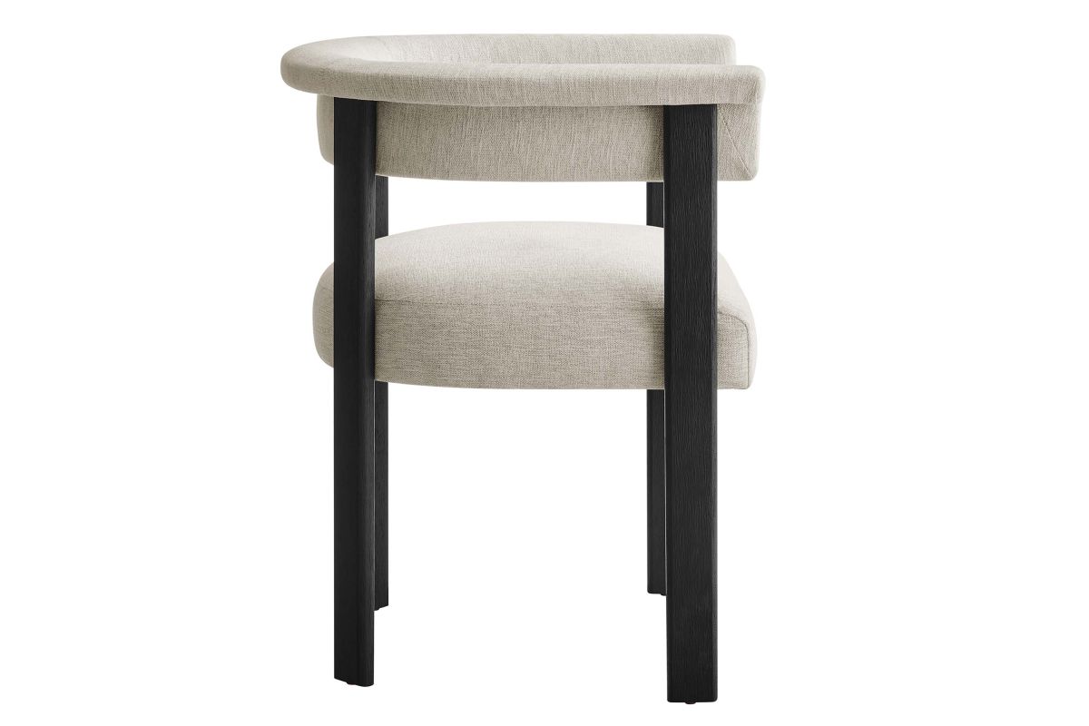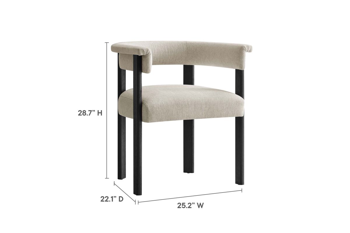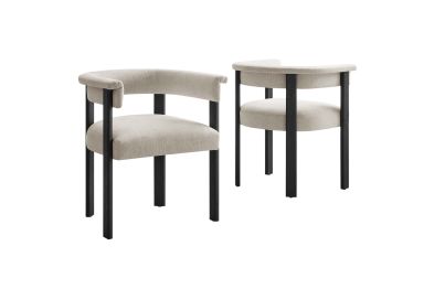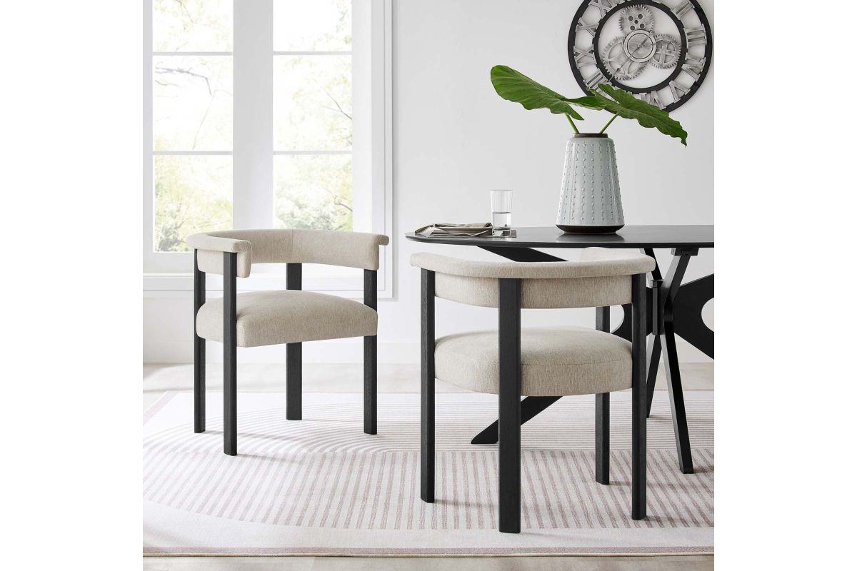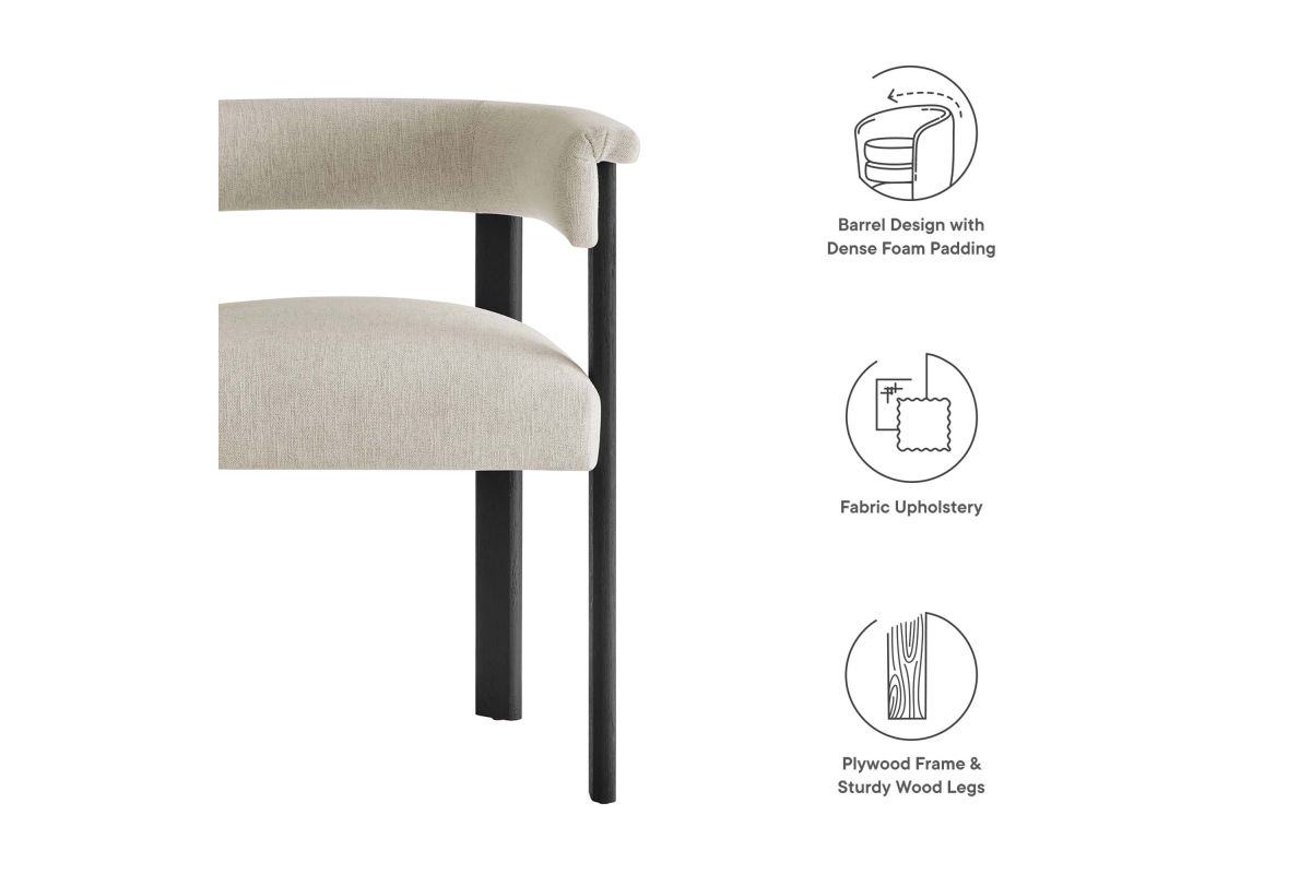 Feel the exquisite combination of modern chic and ultimate comfort with the Imogen Fabric Dining Chair Set of 2. These contemporary dining chairs feature a unique barrel back silhouette that cradles you in luxury with its curved backrest and open design, offering both support and style. The foundation of each dining room armchair is built on sturdy wood legs, for durability and strength to accompany its aesthetic appeal. The seats and backrests, constructed from high-quality plywood, are enveloped in a dense layer of foam and fabric upholstery, creating an inviting look that beckons you to sit and relax well after you've finished eating. The fixed seat and cushion design provide a seamless, clean look that complements any dining table with grace. These curved back dining chairs are equipped with non-marking plastic foot pins, protecting your flooring. Perfectly suited as an accent chair or part of your kitchen & dining room ensemble, this set of two rounded back dining chairs seamlessly integrates with a variety of decor themes, from modern farmhouse to contemporary and minimalist aesthetics. Easy to assemble and designed with the modern home in mind, the Imogen barrel chair set is not only a practical addition to your home but also a reflection of sophisticated taste. Dining Side Chair Weight Capacity: 331 lbs