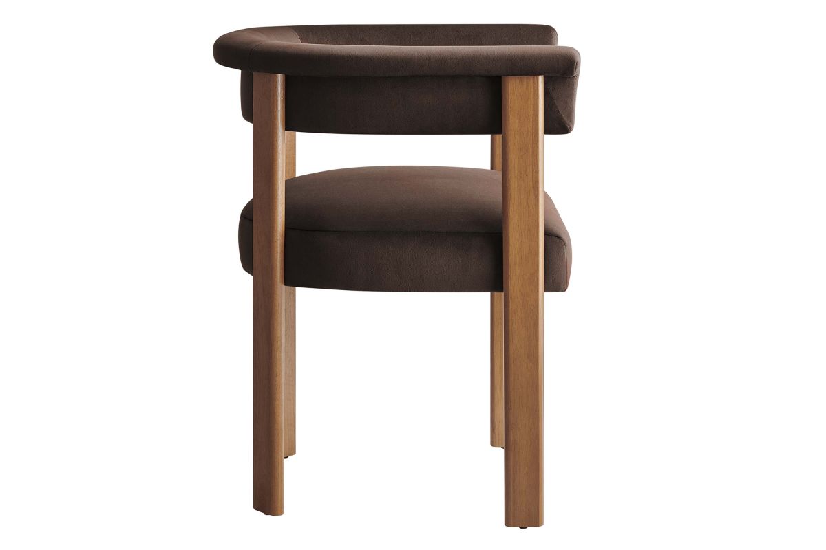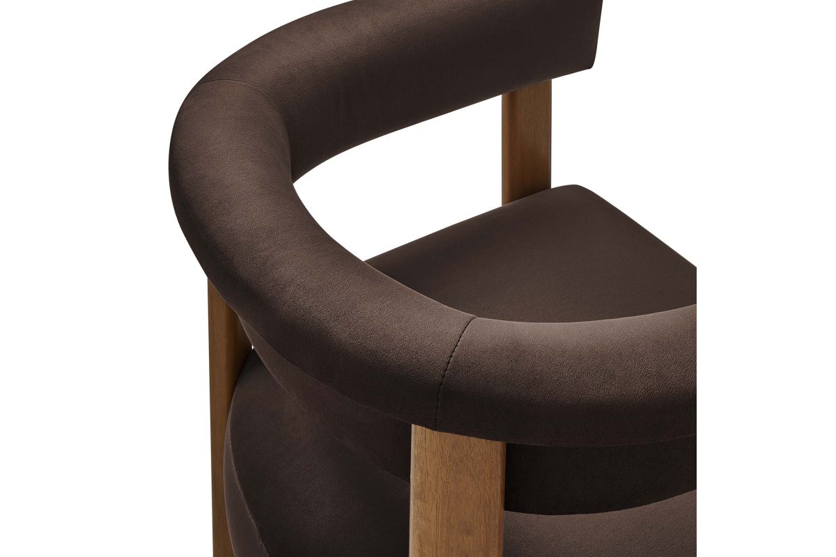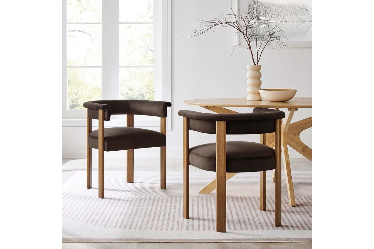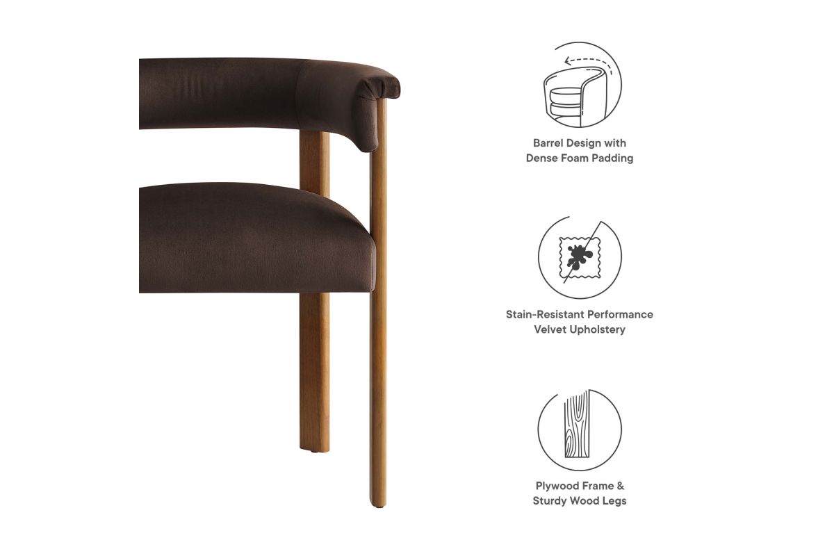 Feel the exquisite combination of modern chic and ultimate comfort with the Imogen Performance Velvet Dining Chair Set of 2. These contemporary dining chairs feature a unique barrel back silhouette that cradles you in luxury with its curved backrest and open design, offering both support and style. The foundation of each dining room armchair is built on sturdy wood legs, for durability and strength to accompany its aesthetic appeal. The seats and backrests, constructed from high-quality plywood, are enveloped in a dense layer of foam and stain-resistant performance velvet upholstery, creating an inviting look that beckons you to sit and relax well after you've finished eating. The fixed seat and cushion provide a seamless, clean look that complements any dining table with grace. These curved back dining chairs are equipped with non-marking plastic foot pins, protecting your flooring. Perfectly suited as a velvet accent chair or part of your kitchen & dining room ensemble, this set of two rounded back dining chairs seamlessly integrates with a variety of decor themes, from modern farmhouse to contemporary and minimalist aesthetics. Easy to assemble and designed with the modern home in mind, the Imogen barrel chair set is not only a practical addition to your home, but also a reflection of sophisticated taste. Dining Side Chair Weight Capacity: 331 lbs.