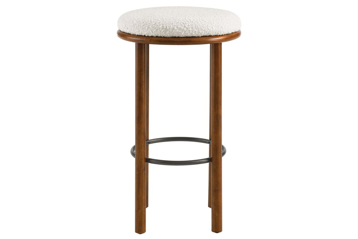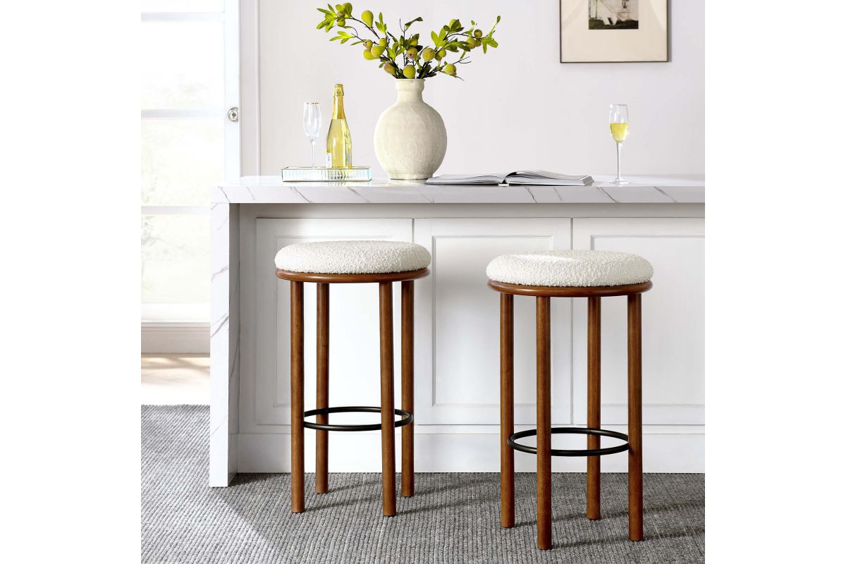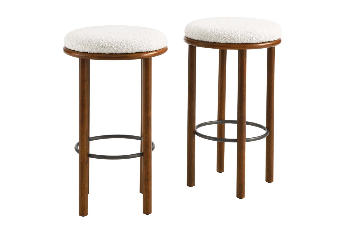 The Fable Bar Stools Set of Two embodies a streamlined design with a dash of modern flair, effortlessly fitting for the stylish, contemporary bar area or any part of the home. These 30 inch backless bar stools showcase a sleek profile that enhances everything from minimalist decors to eclectic spaces. Adorned with a plush, round boucle fabric seat with foam padding for comfort, the Fable padded bar stools provide a sensory experience as you enjoy a cocktail or relax with an evening drink. The solid rubberwood frame and legs of these bar-height stools extend down to form a sturdy foundation, showcasing the beauty of natural wood grains, while the integrated metal footrest invites a relaxed posture, perfect for prolonged seating. Each boucle stool comes with non-marking foot glides, a thoughtful addition that preserves your flooring and enhances stability. Assembly is straightforward, allowing these accent furniture pieces to blend into your entertainment space with ease. Whether used at a bar counter or as island stools, the Fable accent stools are a testament to timeless design, harmonizing purpose with style. Weight Capacity: 500 lbs.