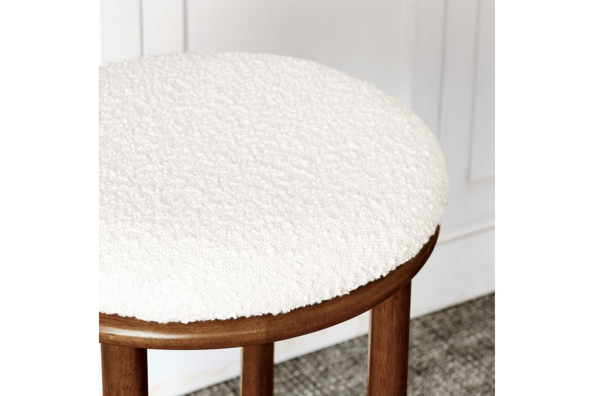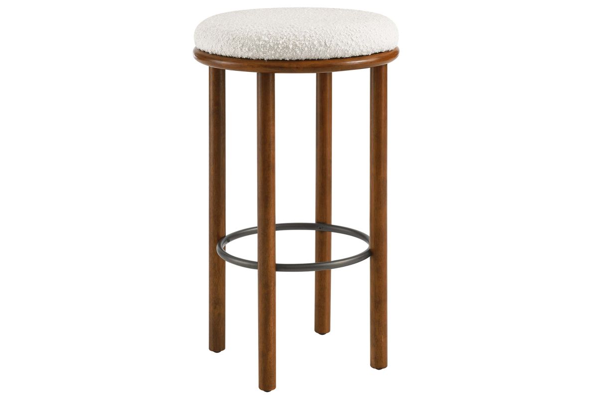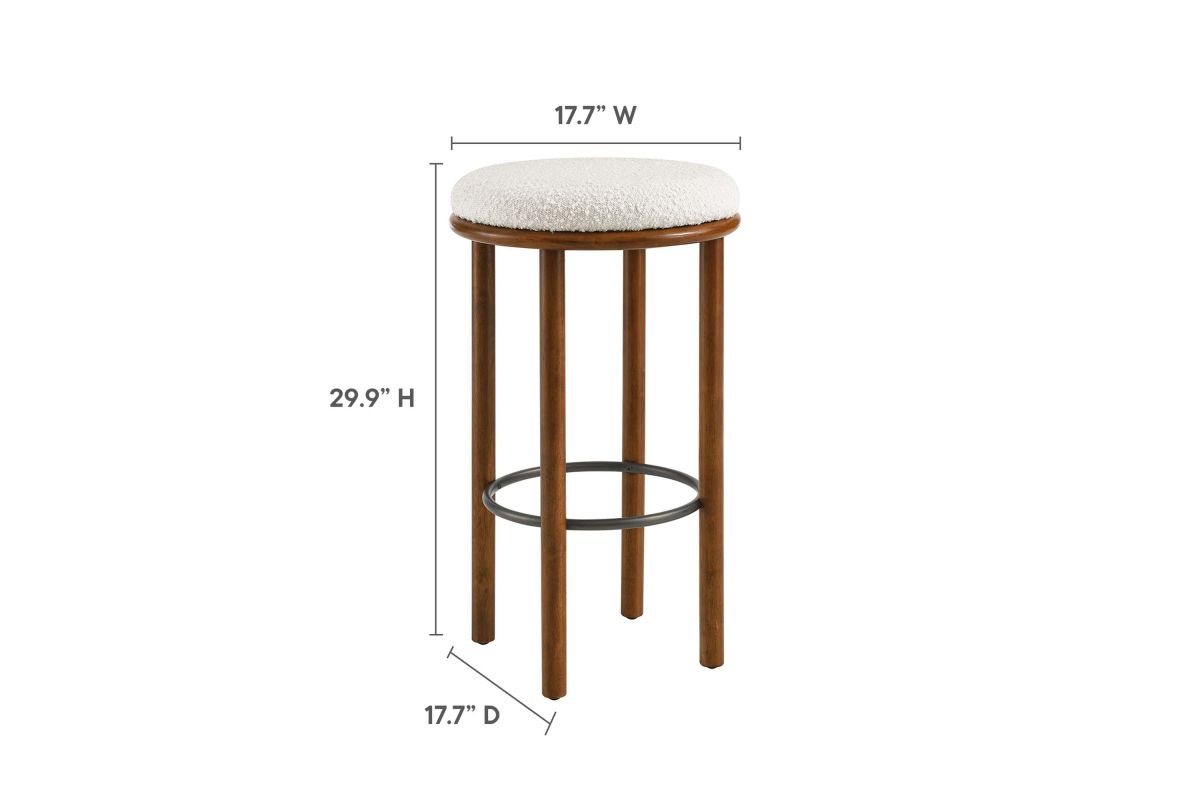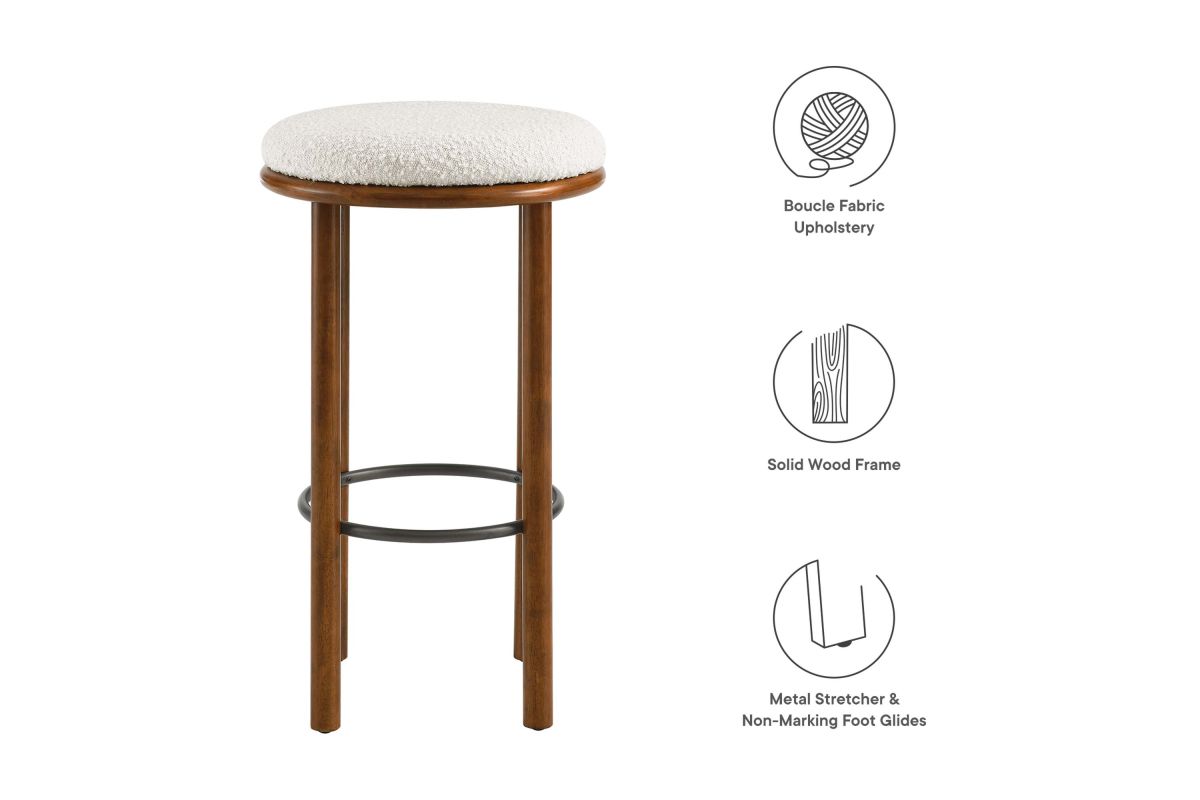 The Fable Bar Stools Set of Two embodies a streamlined design with a dash of modern flair, effortlessly fitting for the stylish, contemporary bar area or any part of the home. These 30 inch backless bar stools showcase a sleek profile that enhances everything from minimalist decors to eclectic spaces. Adorned with a plush, round boucle fabric seat with foam padding for comfort, the Fable padded bar stools provide a sensory experience as you enjoy a cocktail or relax with an evening drink. The solid rubberwood frame and legs of these bar-height stools extend down to form a sturdy foundation, showcasing the beauty of natural wood grains, while the integrated metal footrest invites a relaxed posture, perfect for prolonged seating. Each boucle stool comes with non-marking foot glides, a thoughtful addition that preserves your flooring and enhances stability. Assembly is straightforward, allowing these accent furniture pieces to blend into your entertainment space with ease. Whether used at a bar counter or as island stools, the Fable accent stools are a testament to timeless design, harmonizing purpose with style. Weight Capacity: 500 lbs.