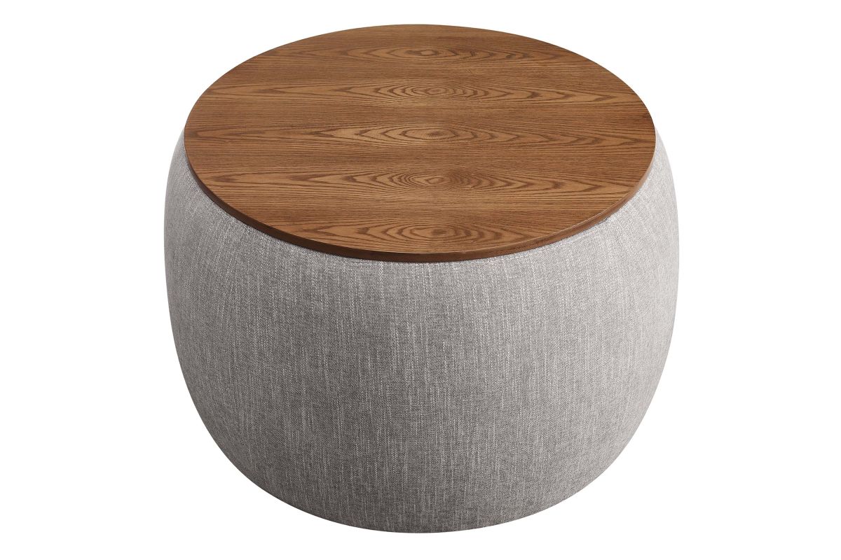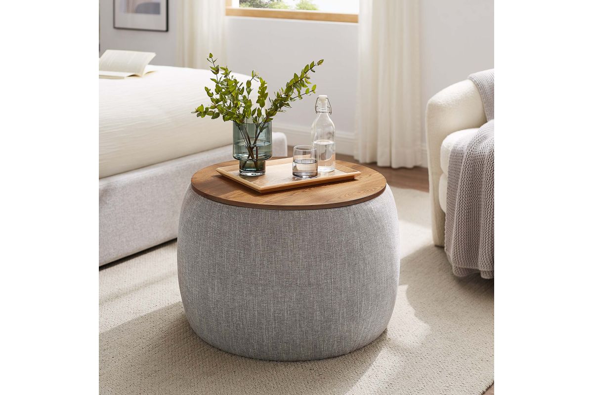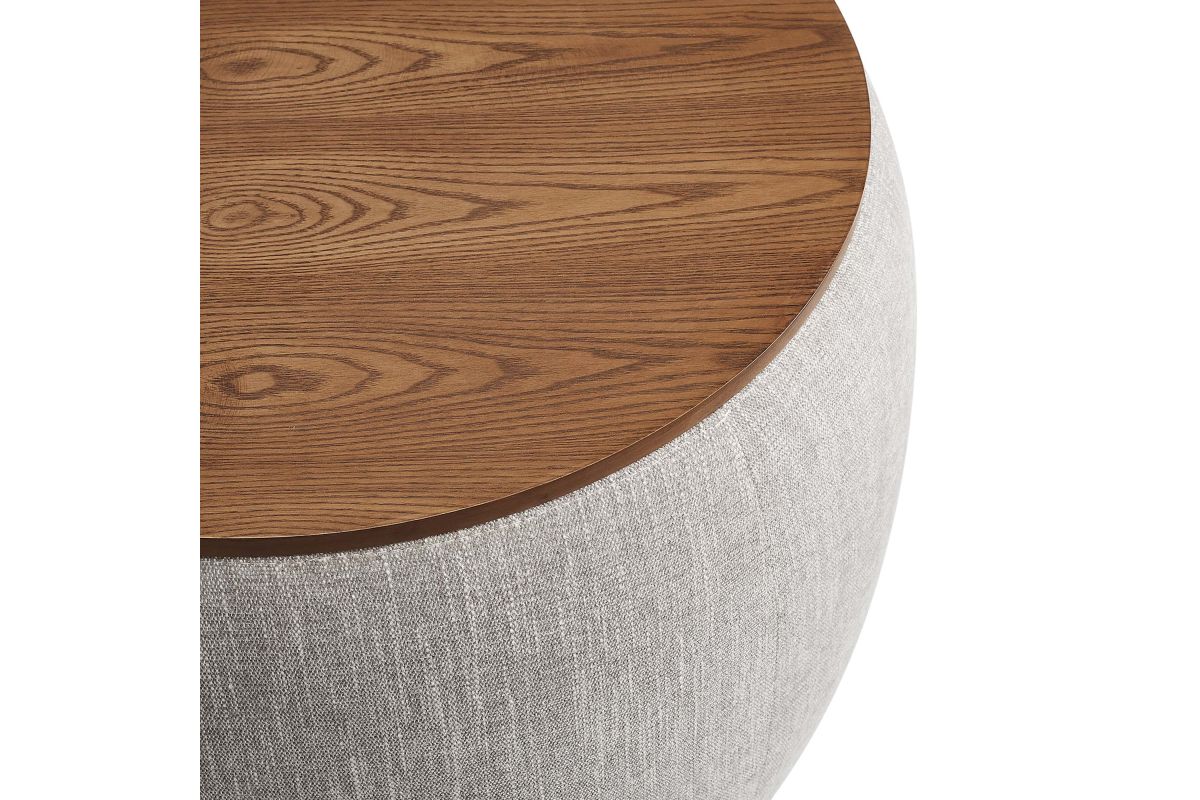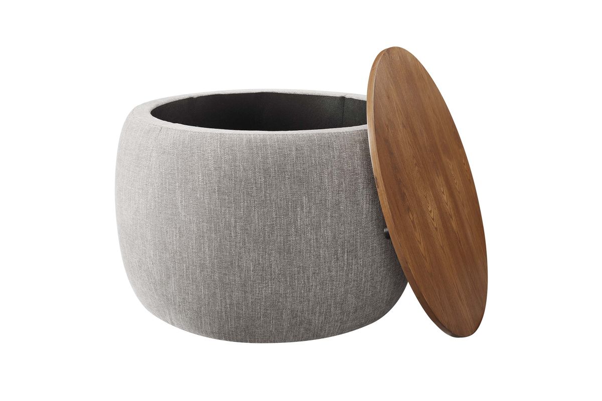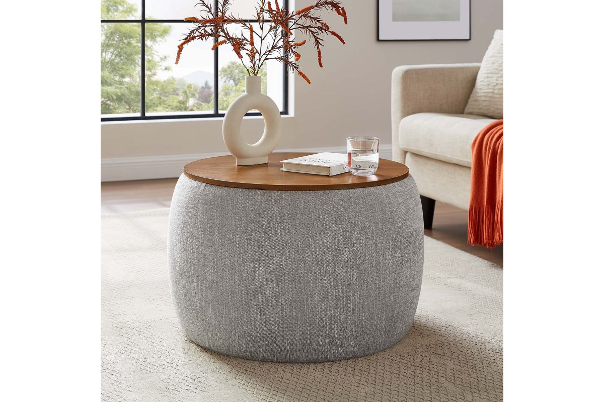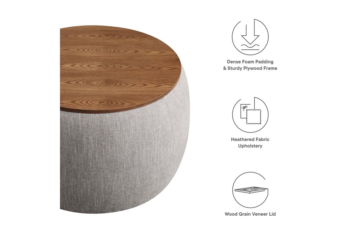 Refine your decor with the Perla Fabric Upholstered Storage Ottoman. Its sturdy plywood frame is wrapped in cushioning foam and upholstered in woven heathered fabric, while a sleek wood grain veneer lid adds clean functionality and aesthetic appeal. The Perla storage ottoman stands out with its polished silhouette, serving both as a chic round coffee table and a storage table. Its hidden concealed compartment is a discreet haven for your essentials, easily accessible beneath its tray-like lid. Whether you're stashing away linens or keeping your reading materials at hand, the Perla woven ottoman makes organization look good. Designed with modern living in mind, this round storage ottoman stool with lid features non-marking foot glides to protect your flooring, allowing you to rearrange without a second thought. Ready to use right out of the box, this storage stool awaits its role in your home's narrative, adding a touch of sophistication and practicality to your everyday. Weight Capacity: 264 lbs