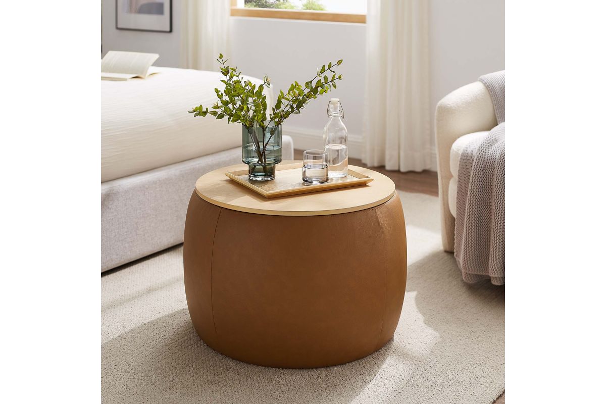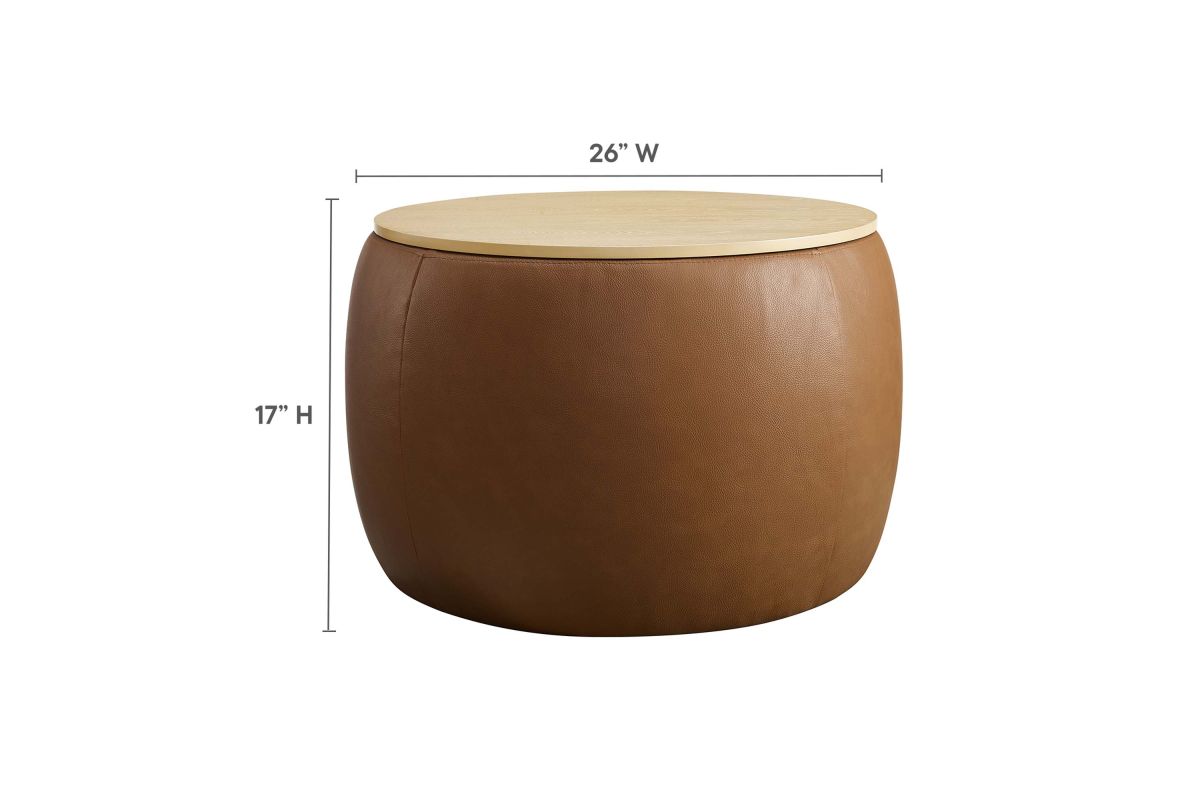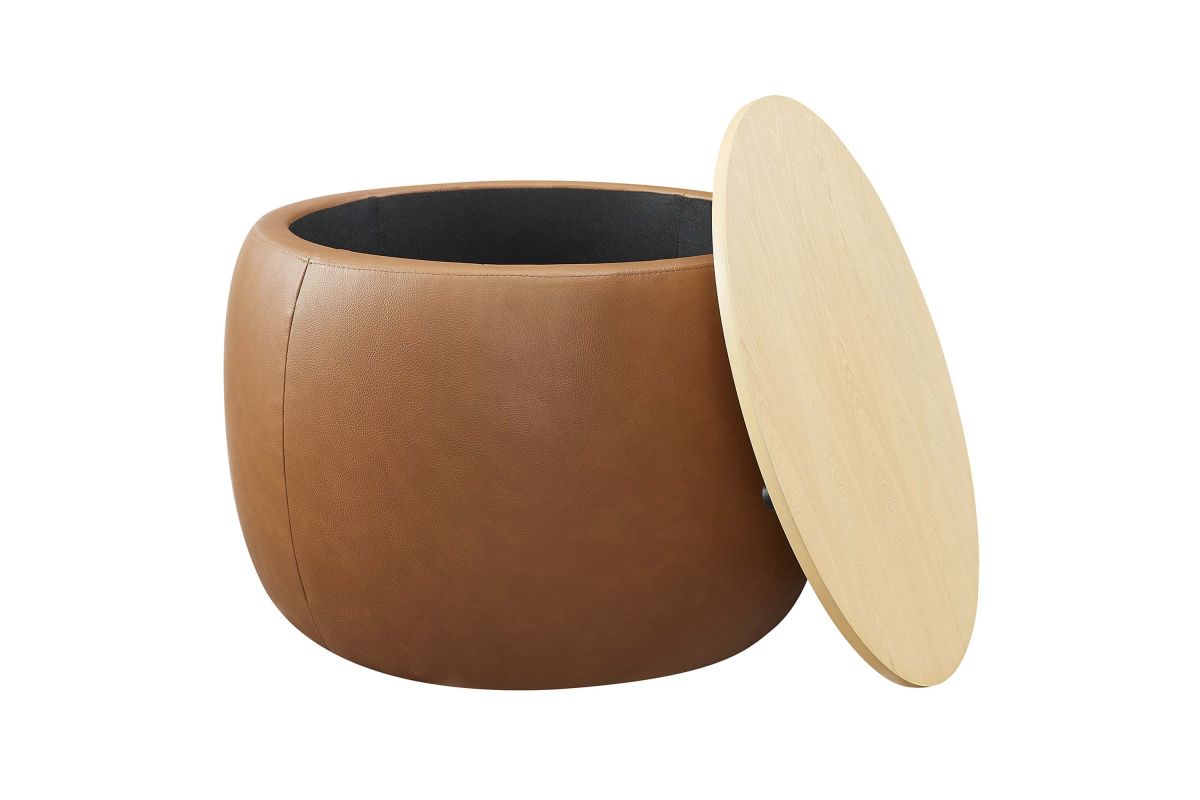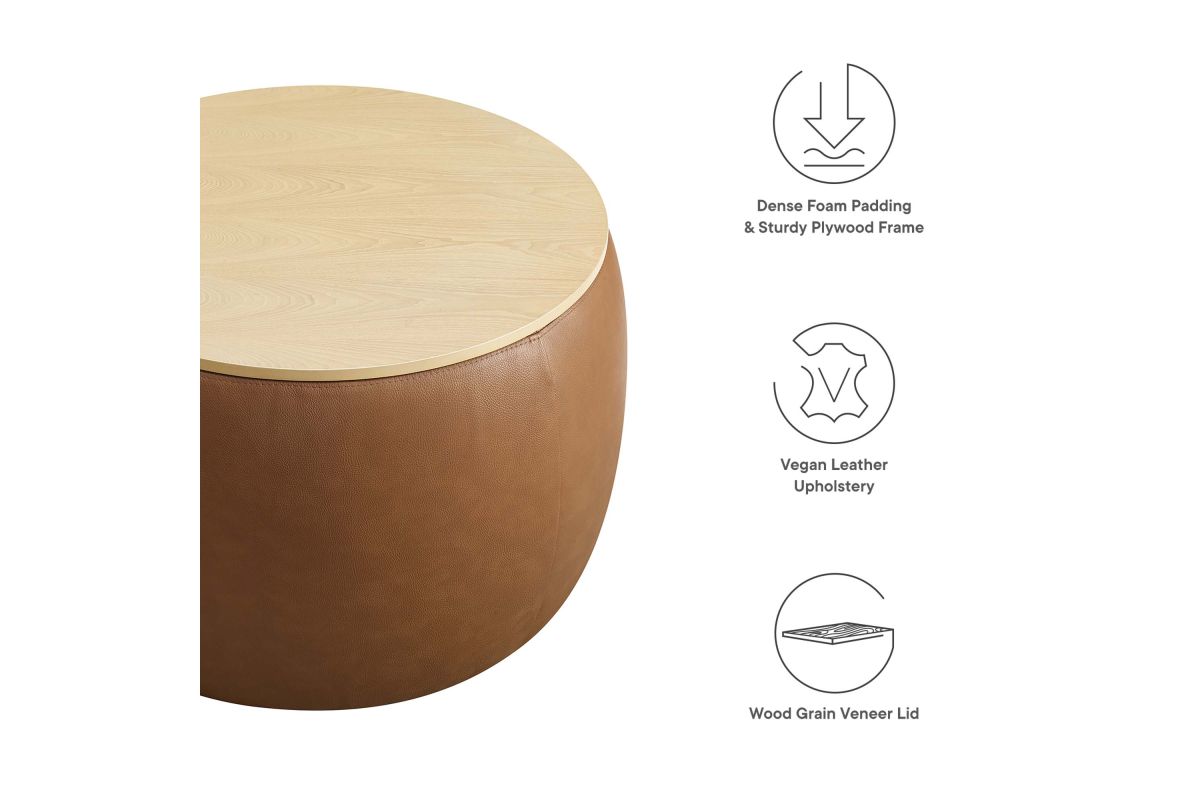 Refine your decor with the Perla Vegan Leather Storage Ottoman. Its sturdy plywood frame is wrapped in cushioning foam and upholstered in durable faux leather, while a sleek wood grain veneer lid adds clean functionality and aesthetic appeal. The Perla storage ottoman stands out with its polished silhouette, serving both as a chic round coffee table and a storage table. Its hidden concealed compartment is a discreet haven for your essentials, easily accessible beneath its tray-like lid. Whether you're stashing away linens or keeping your reading materials at hand, the Perla ottoman with storage makes organization look good. Designed with modern living in mind, this round storage ottoman stool with lid features non-marking foot glides to protect your flooring, allowing you to rearrange without a second thought. Ready to use right out of the box, this storage stool awaits its role in your home's narrative, adding a touch of sophistication and practicality to your everyday. Weight Capacity: 264 lbs.