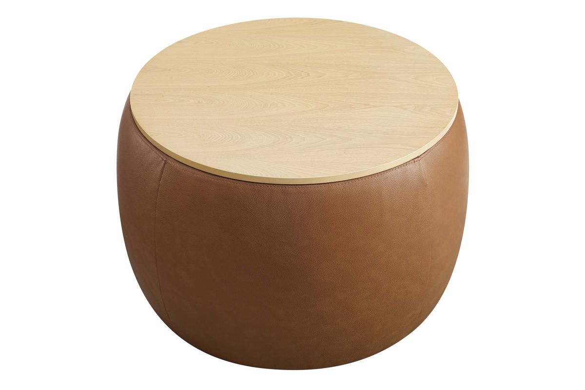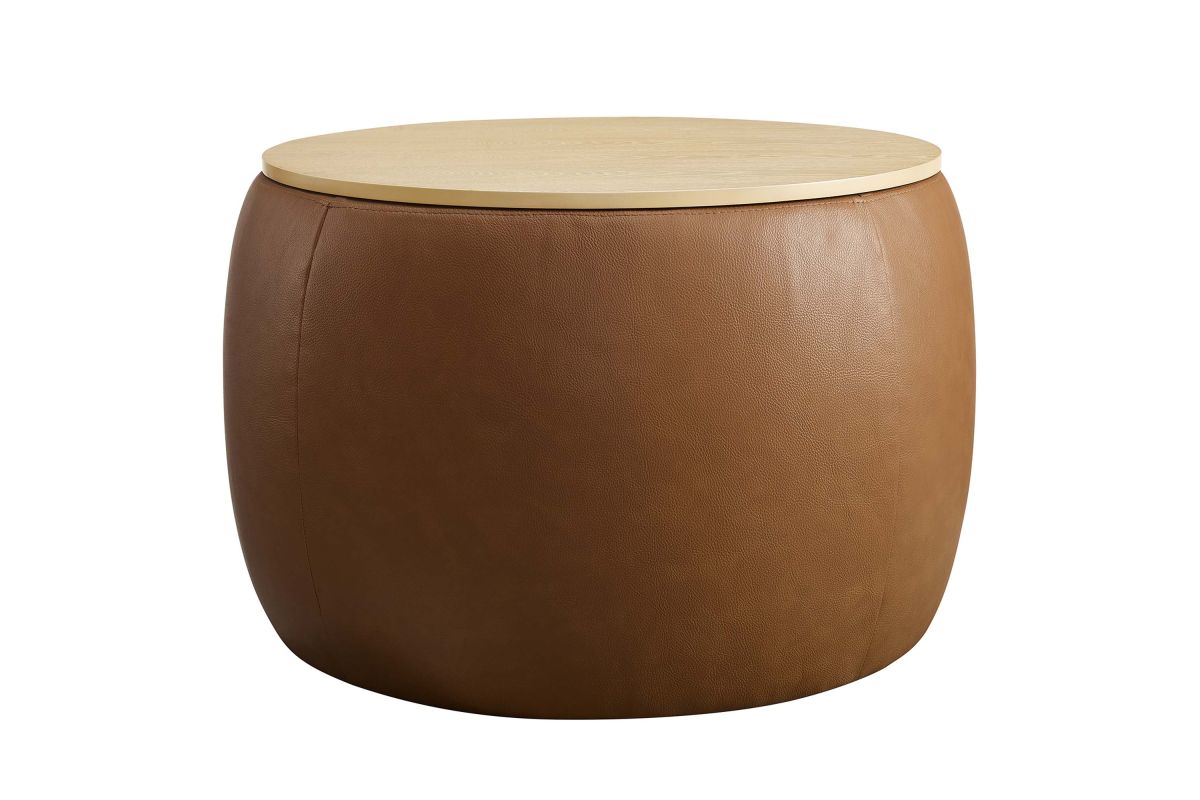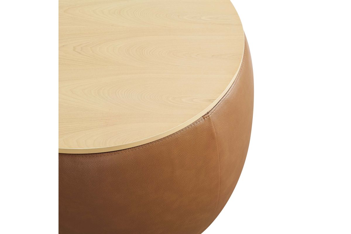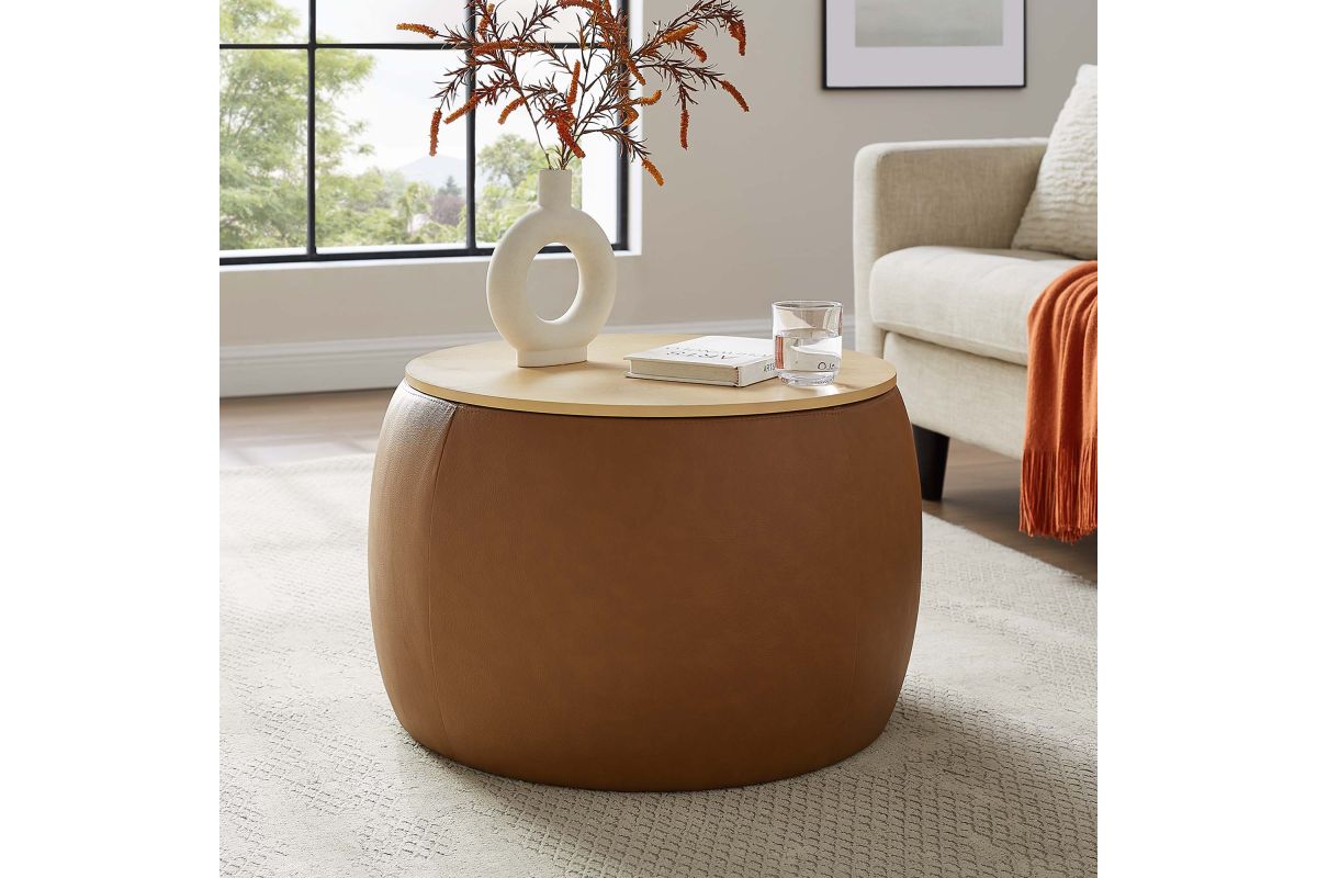 Refine your decor with the Perla Vegan Leather Storage Ottoman. Its sturdy plywood frame is wrapped in cushioning foam and upholstered in durable faux leather, while a sleek wood grain veneer lid adds clean functionality and aesthetic appeal. The Perla storage ottoman stands out with its polished silhouette, serving both as a chic round coffee table and a storage table. Its hidden concealed compartment is a discreet haven for your essentials, easily accessible beneath its tray-like lid. Whether you're stashing away linens or keeping your reading materials at hand, the Perla ottoman with storage makes organization look good. Designed with modern living in mind, this round storage ottoman stool with lid features non-marking foot glides to protect your flooring, allowing you to rearrange without a second thought. Ready to use right out of the box, this storage stool awaits its role in your home's narrative, adding a touch of sophistication and practicality to your everyday. Weight Capacity: 264 lbs.