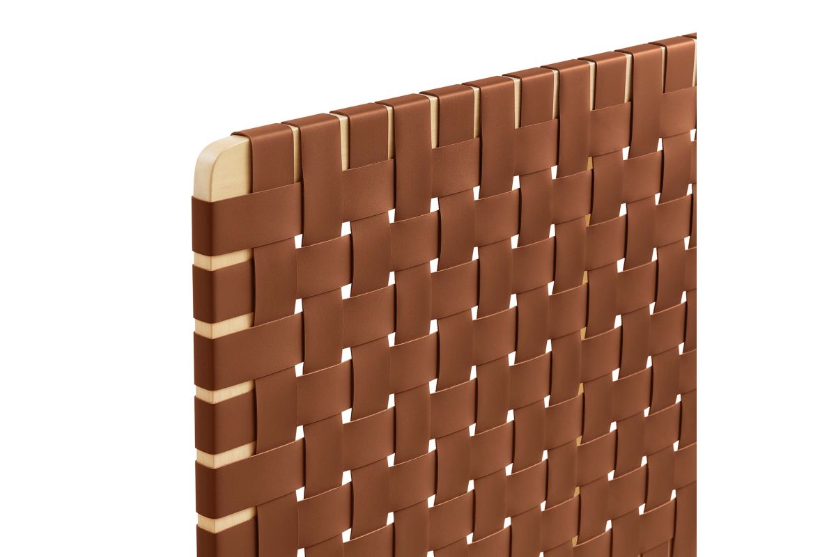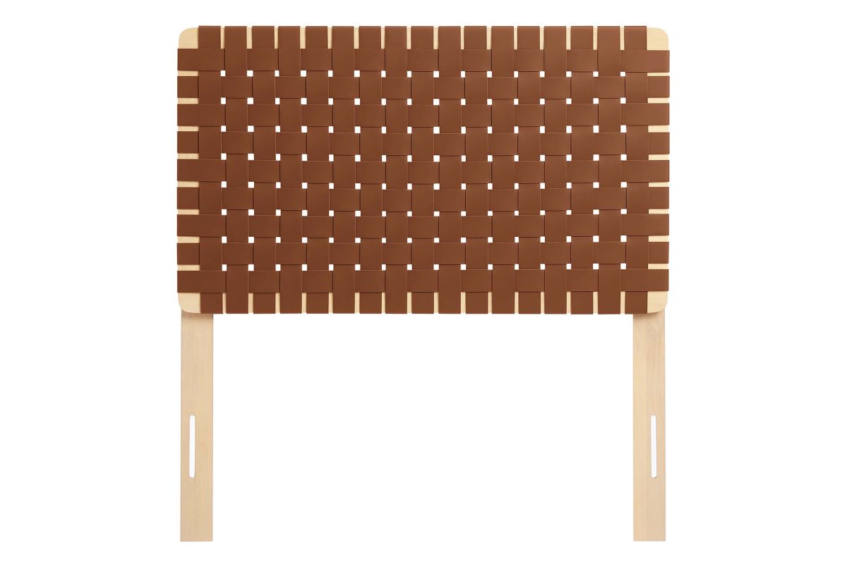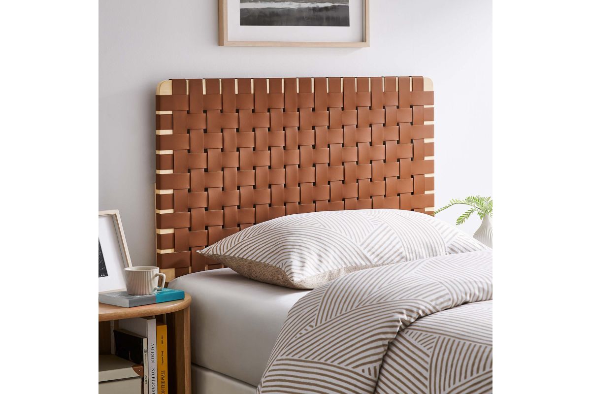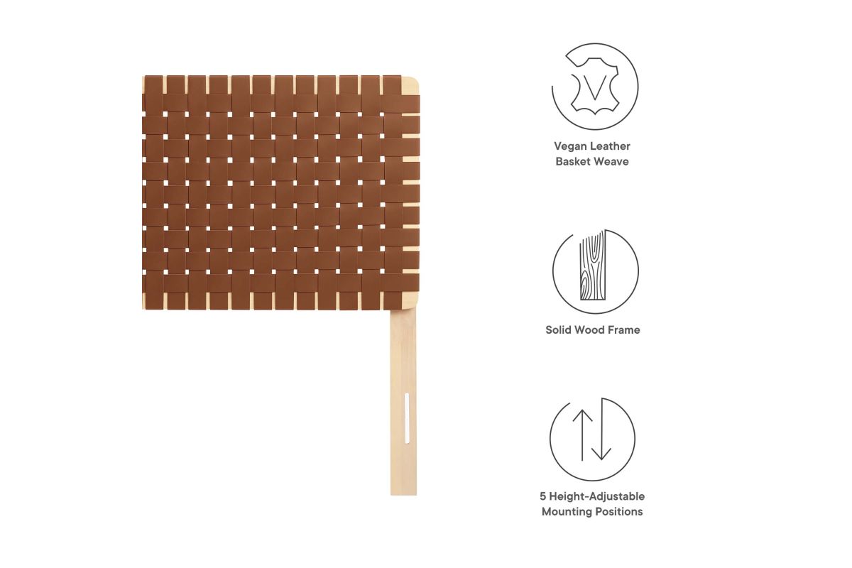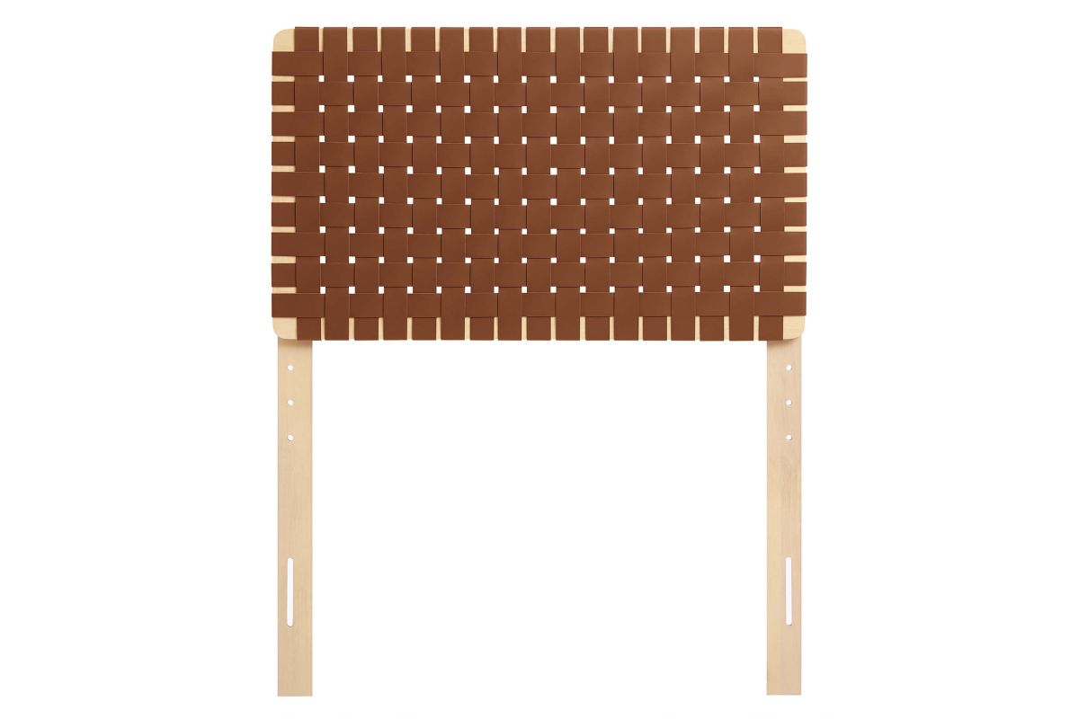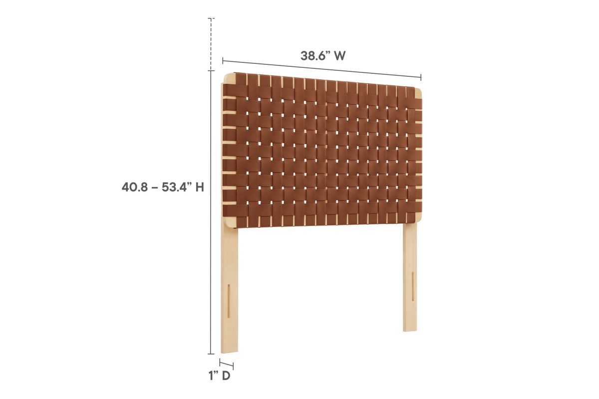 Elevate your bedroom's ambiance with the Sparta Vegan Leather Weave Twin Headboard, a perfect blend of robustness and artistic flair. Constructed meticulously with a solid wood frame, this twin size headboard introduces enduring stability and a touch of organic aesthetics. The standout feature is its basket woven vegan leather craft, adding a unique dimension and a tactile texture that captivates the eye. Perfect for a children's bedroom, small guest room, college dorm room, or shared bedroom, the Sparta Headboard offers a standing design with 5 mounting positions. This adaptability makes the twin bed headboard an ideal fit for any bedroom space. The fusion of durability, style, and versatility makes this twin bed headboard a distinguished choice for those seeking to infuse their sleeping space with sophistication and elegance. Assembly Required.