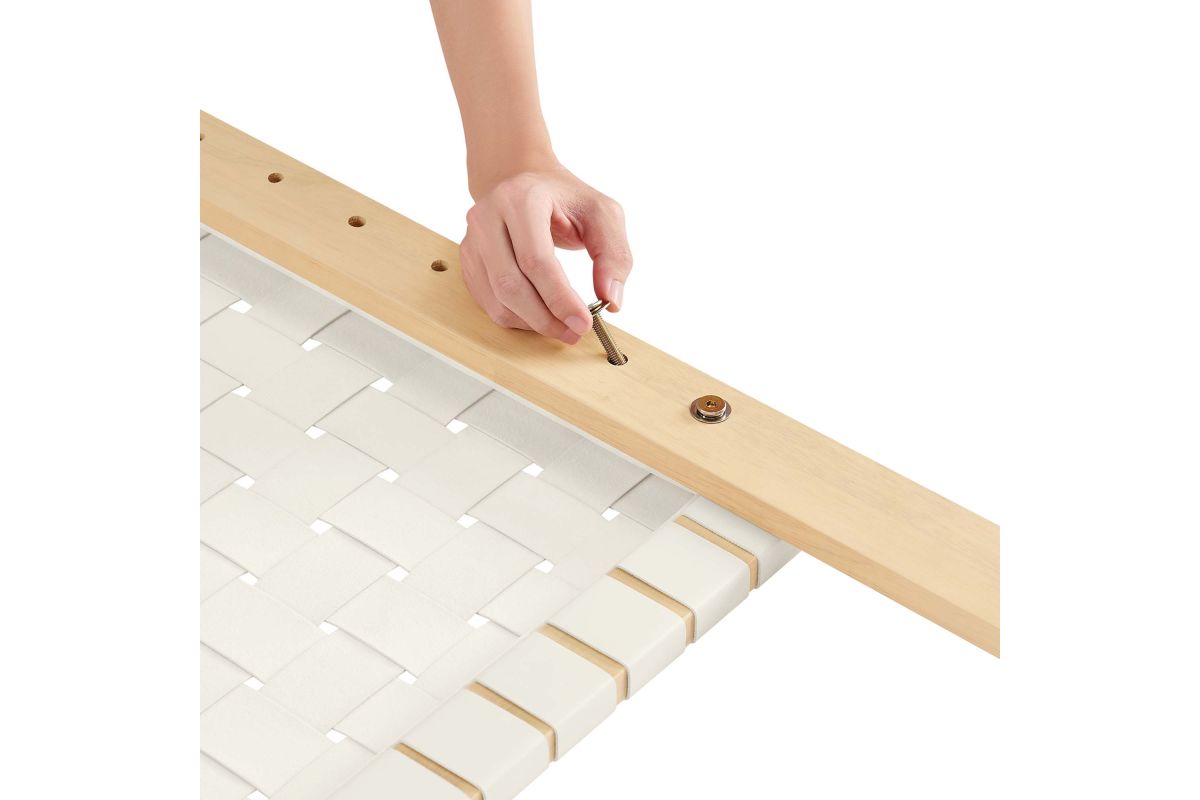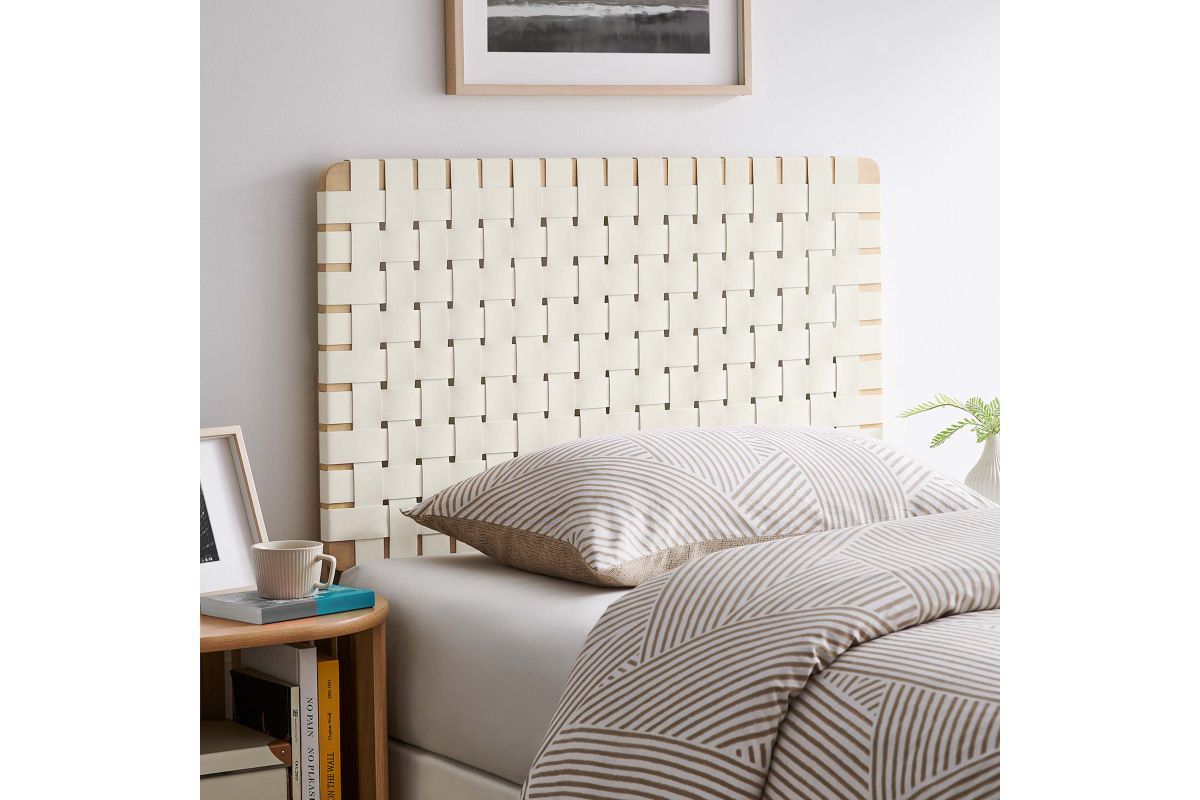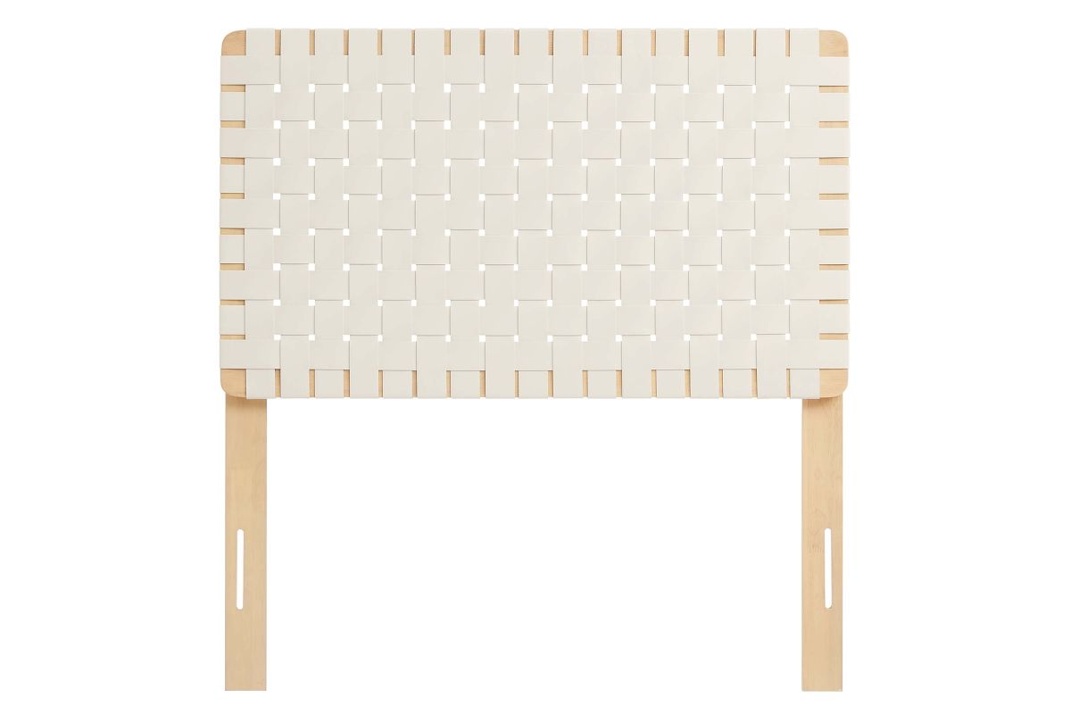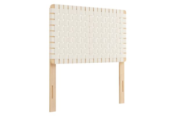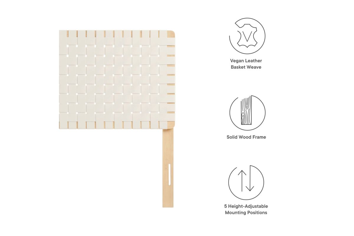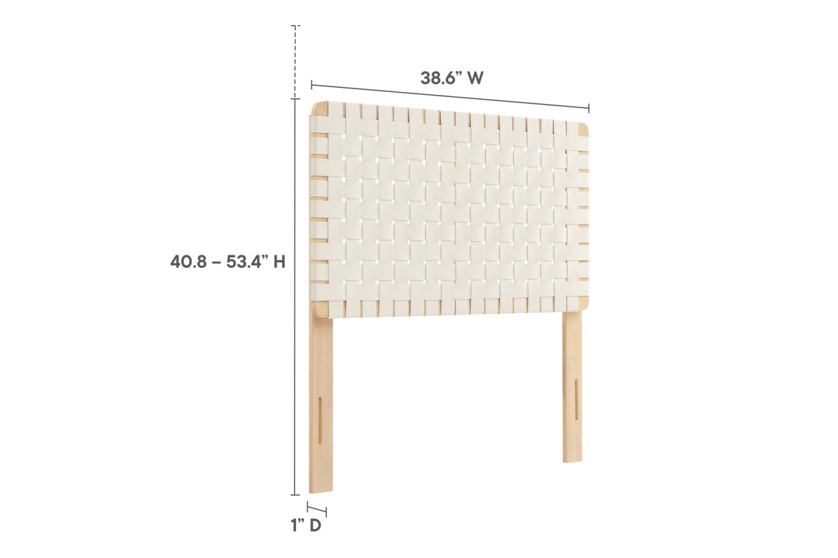 Elevate your bedroom's ambiance with the Sparta Vegan Leather Weave Twin Headboard, a perfect blend of robustness and artistic flair. Constructed meticulously with a solid wood frame, this twin size headboard introduces enduring stability and a touch of organic aesthetics. The standout feature is its basket woven vegan leather craft, adding a unique dimension and a tactile texture that captivates the eye. Perfect for a children's bedroom, small guest room, college dorm room, or shared bedroom, the Sparta Headboard offers a standing design with 5 mounting positions. This adaptability makes the twin bed headboard an ideal fit for any bedroom space. The fusion of durability, style, and versatility makes this twin bed headboard a distinguished choice for those seeking to infuse their sleeping space with sophistication and elegance. Assembly Required.