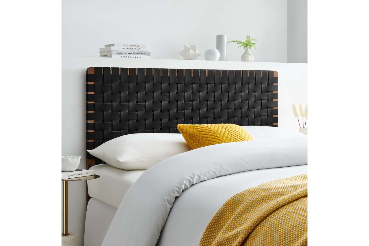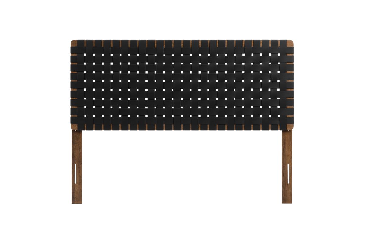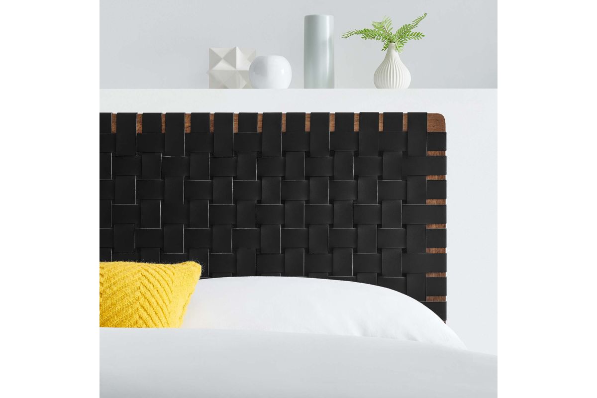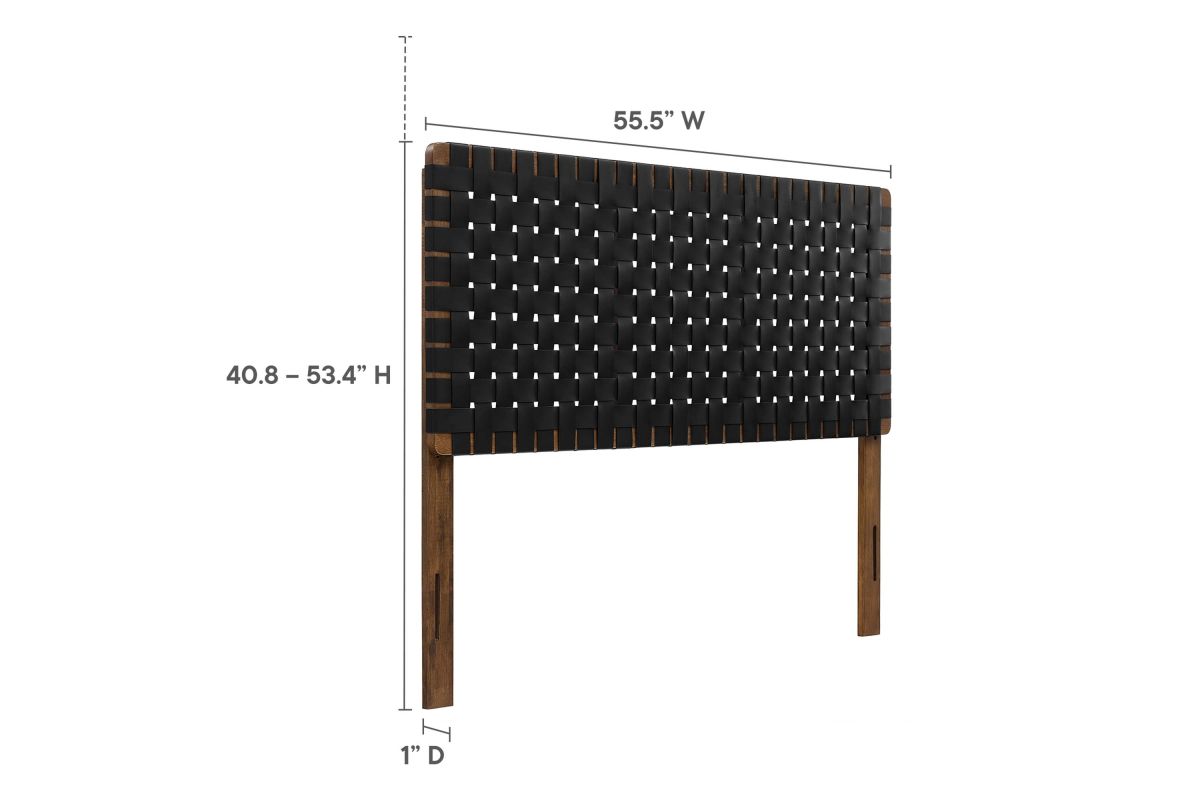 Elevate your bedroom's ambiance with the Sparta Vegan Leather Weave Full Headboard, a perfect blend of robustness and artistic flair. Constructed meticulously with a solid wood frame, this full size headboard introduces enduring stability and a touch of organic aesthetics. The standout feature is its basket woven vegan leather craft, adding a unique dimension and a tactile texture that captivates the eye. Perfect for a teenager's bedroom, guest room, or small primary bedroom, the Sparta Headboard offers a standing design with 5 mounting positions. This adaptability makes the full bed headboard an ideal fit for any bedroom space. The fusion of durability, style, and versatility makes this full bed headboard a distinguished choice for those seeking to infuse their sleeping space with sophistication and elegance. Assembly Required.