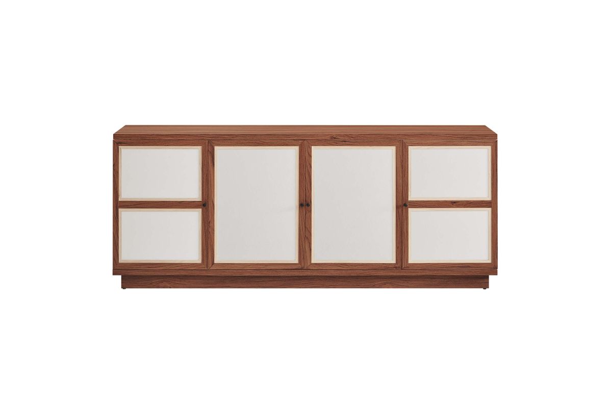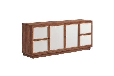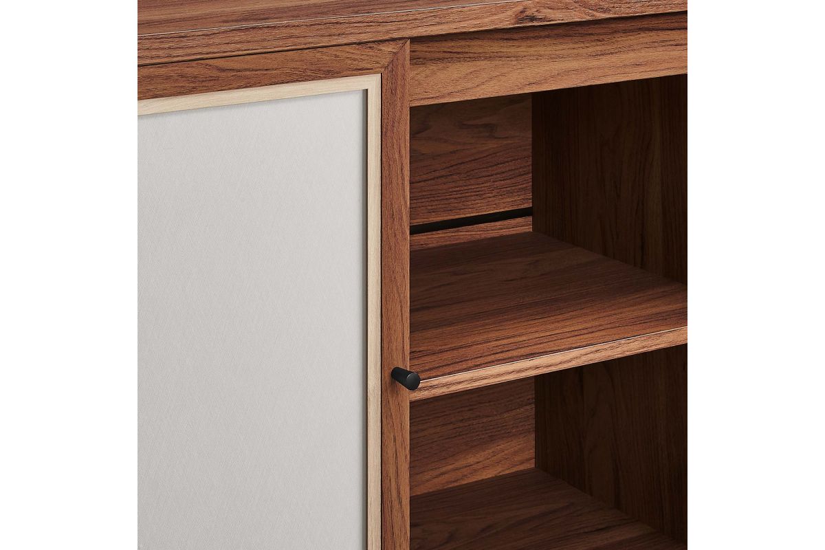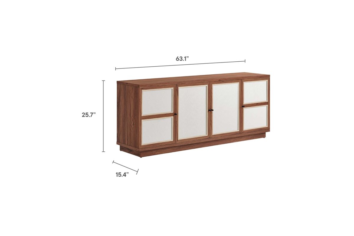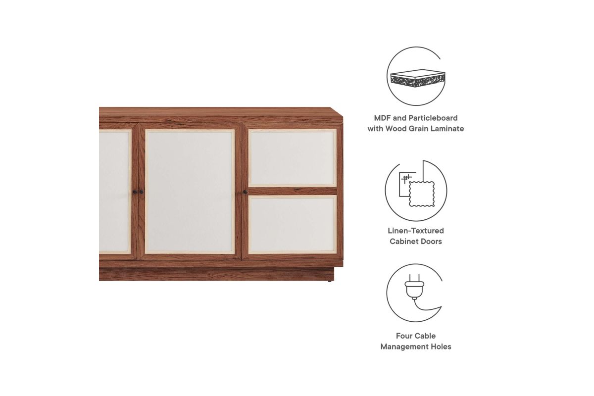 Elevate your decor with the modern Capri 63 Inch TV Console, a large and spacious console that opens up to versatile media storage options. Crafted with durable particleboard and MDF, then finished with a wood grain laminate, this elegant media console brings a natural, organic aesthetic to your space. Its linen-textured doors, equipped with soft-close hinges, reveal spacious compartments for all your storage cabinet needs. Ideal as a TV console with storage in your living room, it also functions seamlessly as an entertainment center, or as a buffet cabinet or sideboard in your dining room. With non-marking glides to protect your flooring and four cable management holes to keep things tidy, this media console supports TVs up to 70 inches. Designed provide a sophisticated solution for keeping your home organized and stylish, this mid century modern TV stand requires easy assembly and is a quintessential addition to any living space. Tabletop Weight Capacity: 198 lbs.; Shelf Weight Capacity: 154 lbs.