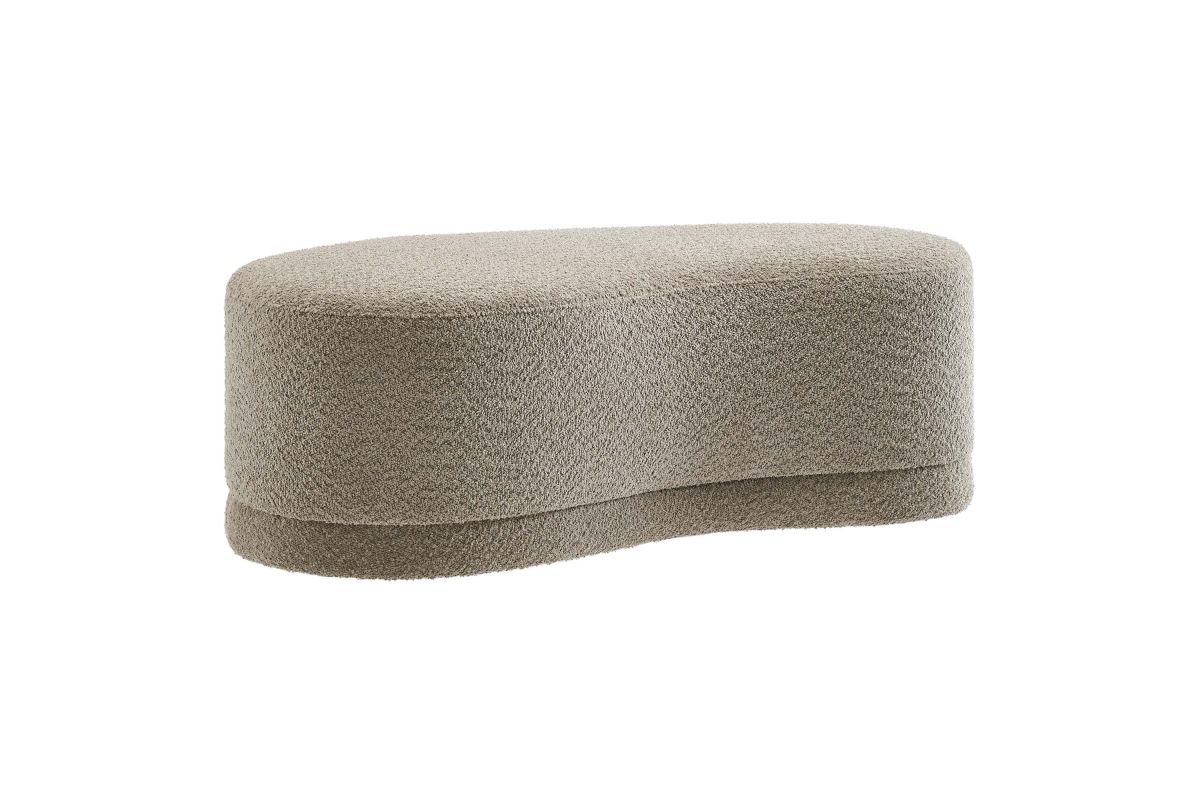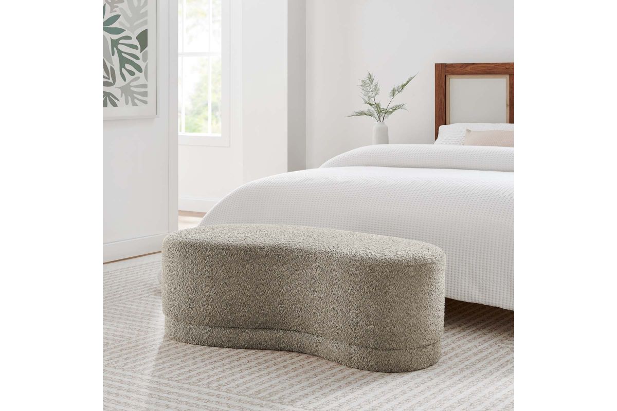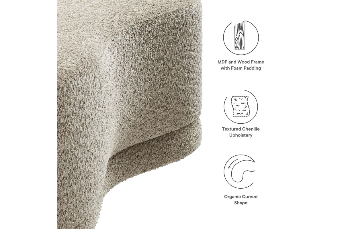 The Nimbus Ottoman, with its organic contours and curved lines, brings a touch of modernity to any living room or bedroom. Wrapped in a soft chenille fabric with a texture similar to boucle, this upholstered ottoman elevates comfort as both a bedroom ottoman and a modern living room furniture piece. The solid frame and dense foam padding of this bed ottoman provide a stable base, rendering it a sturdy footstool perfect for propping up your feet. The Nimbus upholstered curved bench includes non-marking plastic floor glides to safeguard your floors. Whether it's used as a bedroom bench or an innovative upholstered coffee table, this soft fabric ottoman marries style with multipurpose appeal. The Nimbus accent ottoman arrives fully assembled and ready to use. Weight Capacity: 804 lbs.
