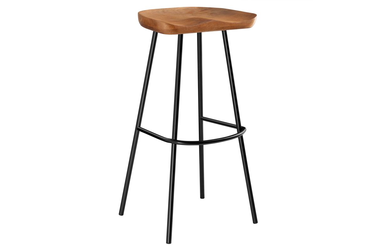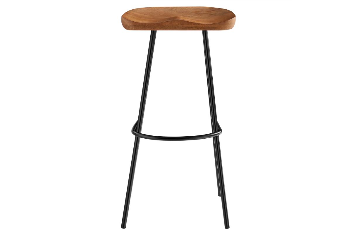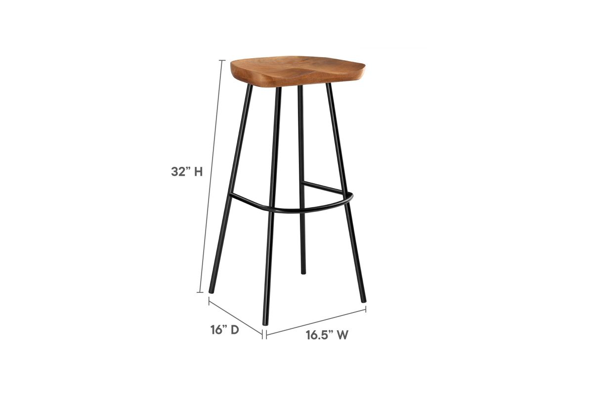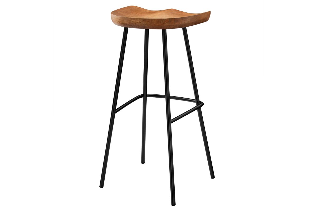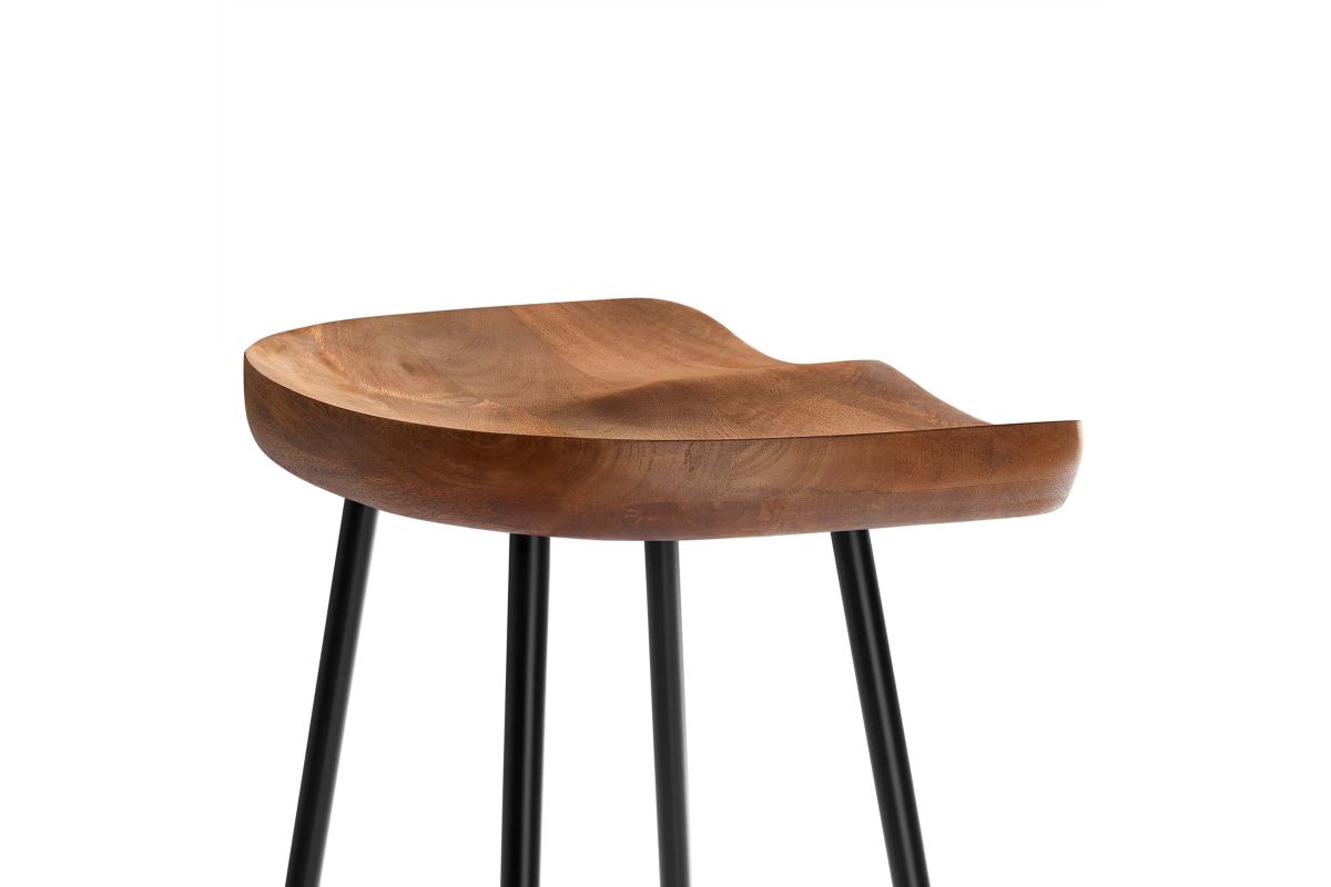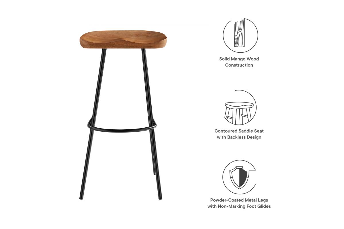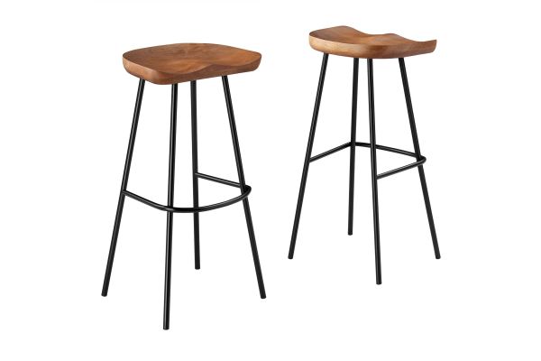 The Concord Bar Stools Set of Two blends minimalist design and chic style, ideal for contemporary homes and kitchens. These stools are made from durable mango wood, which not only ensures longevity but also adds a natural, rustic charm to your home furniture collection. These bar stools are fitted with ergonomically contoured saddle seats, making them not just visually appealing but also comfortable for sitting. The legs of these wood bar stools are crafted from powder-coated metal and are distinctively splayed with a rounded stretcher. This design not only enhances their style and stability but also gives them a trendy, modern bar stool appearance. Featuring adjustable, non-marking foot glides, the Concord Bar Stools not only safeguard your floors but also maintain balance. Perfect for contemporary interiors, these wood stools add natural elegance to your home bar or kitchen counter area. Arriving fully assembled, this set is ready for immediate use. Weight Capacity: 200 lbs.