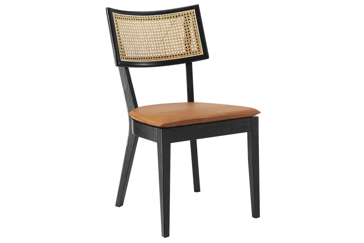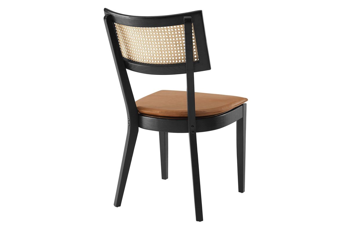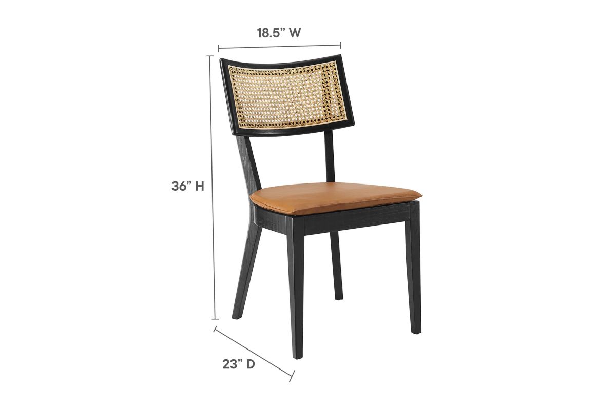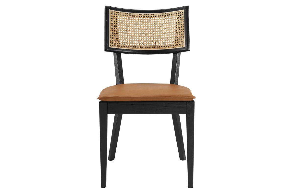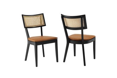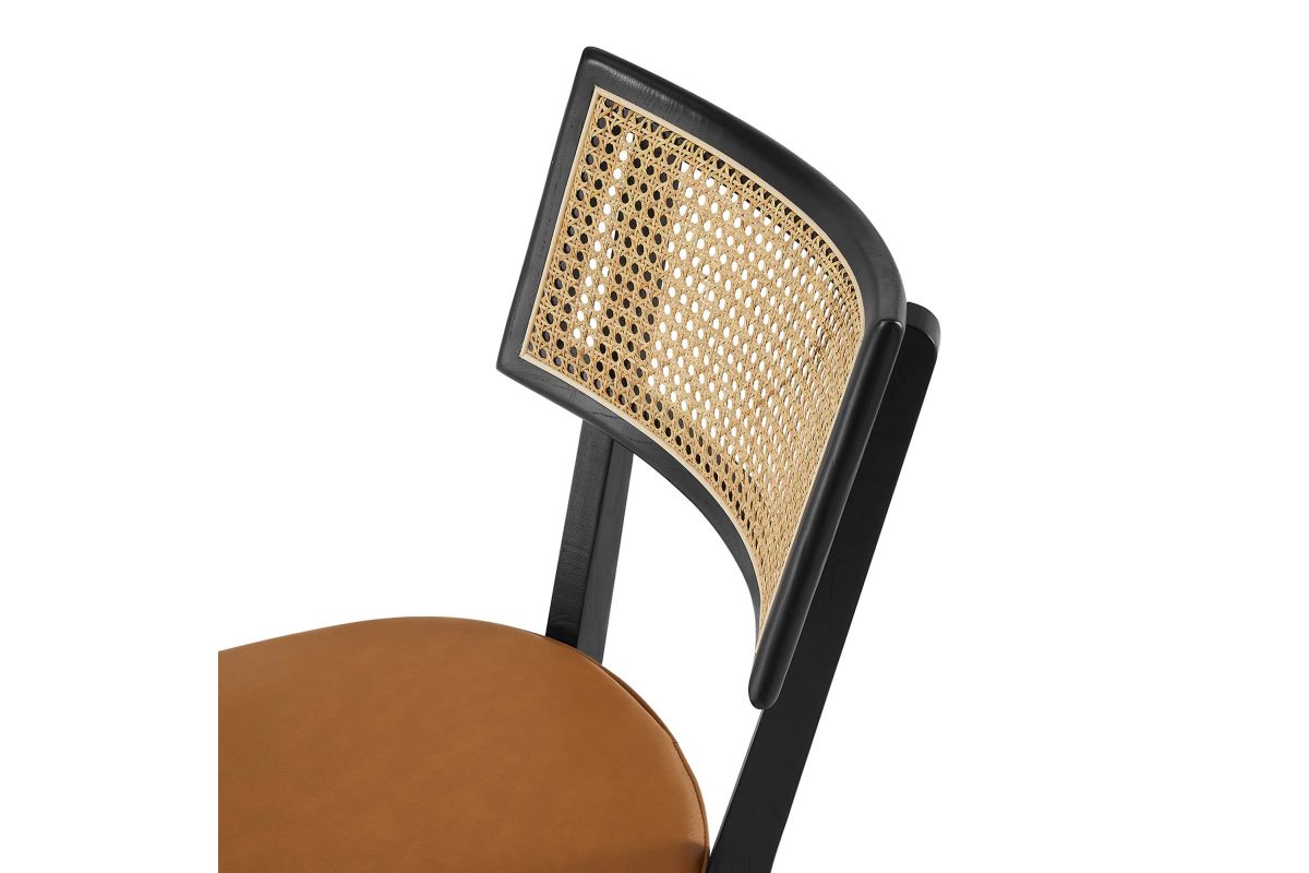 Charming cottage style blends with farmhouse whimsy on the Caledonia Wood Dining Chair Set of Two. Serving as an accent chair or a kitchen chair, this pair adds a touch of retro elegance to dining or living room. Featuring a curved backrest and airy design thanks to its open weave rattan detail, this dining chair set is crafted with solid elm wood and boasts upholstered seats with foam padding for comfort and support. The vegan leather seat covers, featuring a hidden zipper for easy removal, are elegantly accentuated with a French seam, adding a refined detail that echoes the artistic vibe of boho dining chairs. A versatile addition to the modern home, these vegan leather chairs make a statement in the dining room or as accent chairs in the living room, office, entryway, or other seating area. Whether you're looking for a dining chair set for your home bistro or a simple chair to complete your dining area, the Caledonia collection has a unique aesthetic that fuses classic comfort with sleek, modern lines. This set includes two elm wood and rattan dining chairs, with non-marking foot caps to protect floors. Assembly required. Weight Capacity: 330 lbs.