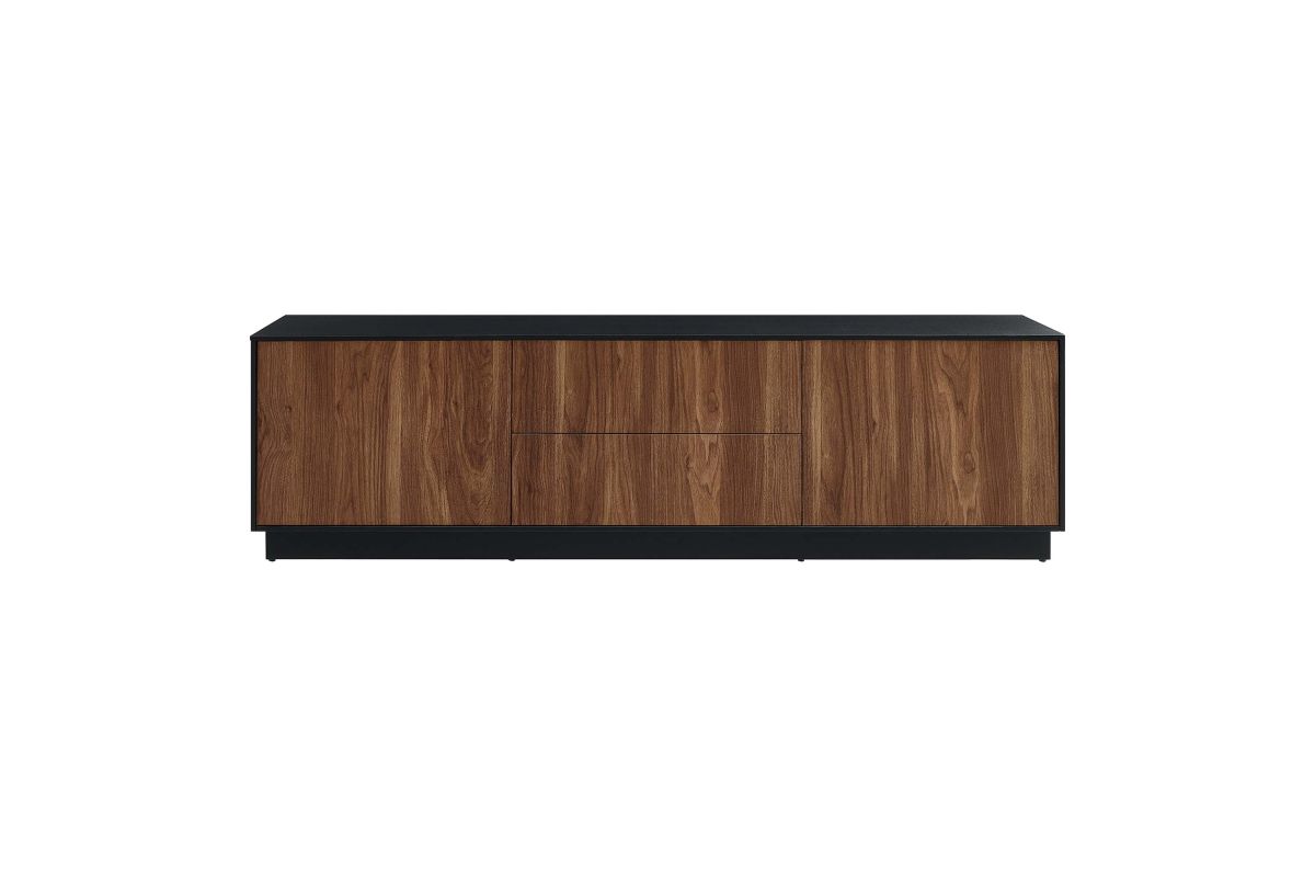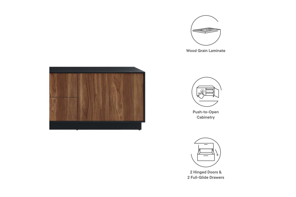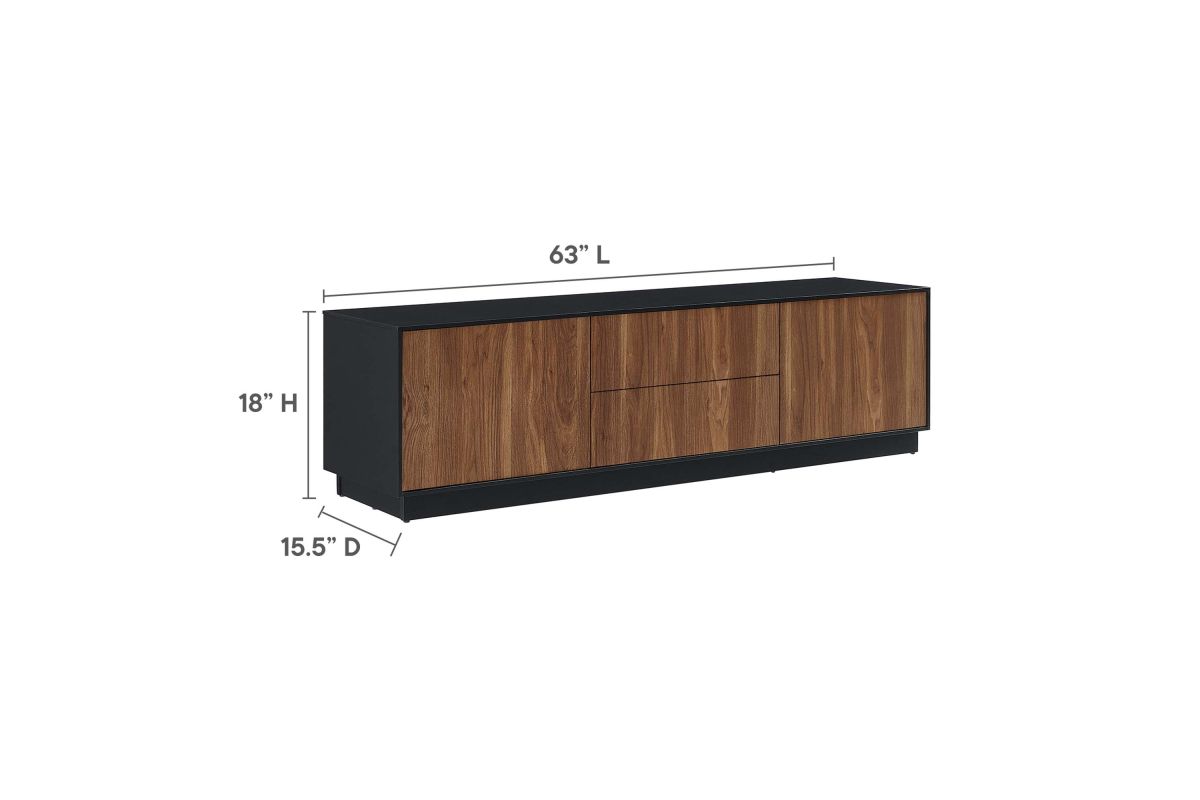 Merge sophistication and utility with the Holden 63" TV Stand. Constructed from MDF and durable particleboard, this TV stand features a wood grain laminate on its cabinets and drawers. Bestowing a rustic flair that complements any contemporary setting, Holden supports flat screen TVs up to 70 inches. Experience modern convenience with push-to-open cabinetry and thoughtfully designed shelving behind two hinged doors. Featuring two full-glide drawers, two cable management holes, and resting on a sleek plinth base, the versatile storage solutions of Holden's design allow it to serve as a spacious living room storage unit for media devices, games, gadgets, and other household items. Assembly Required. Weight Capacity: 200 lbs.