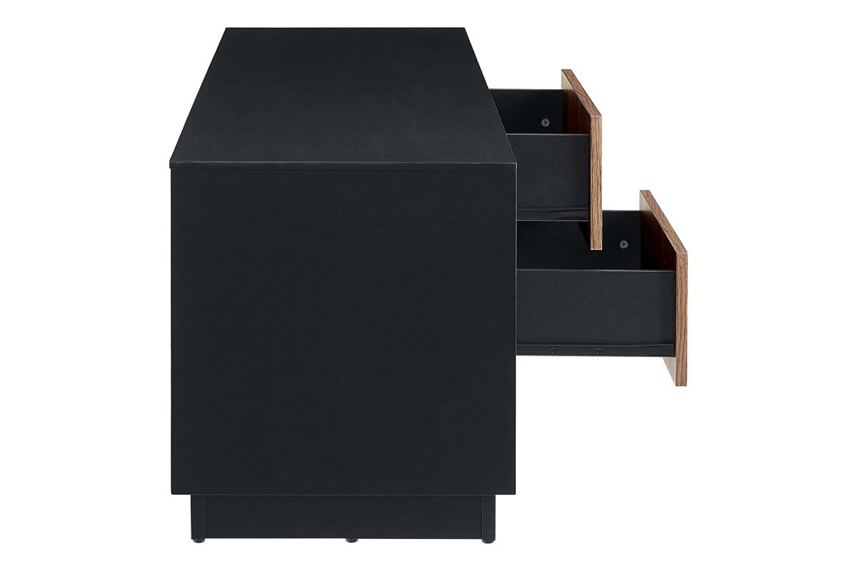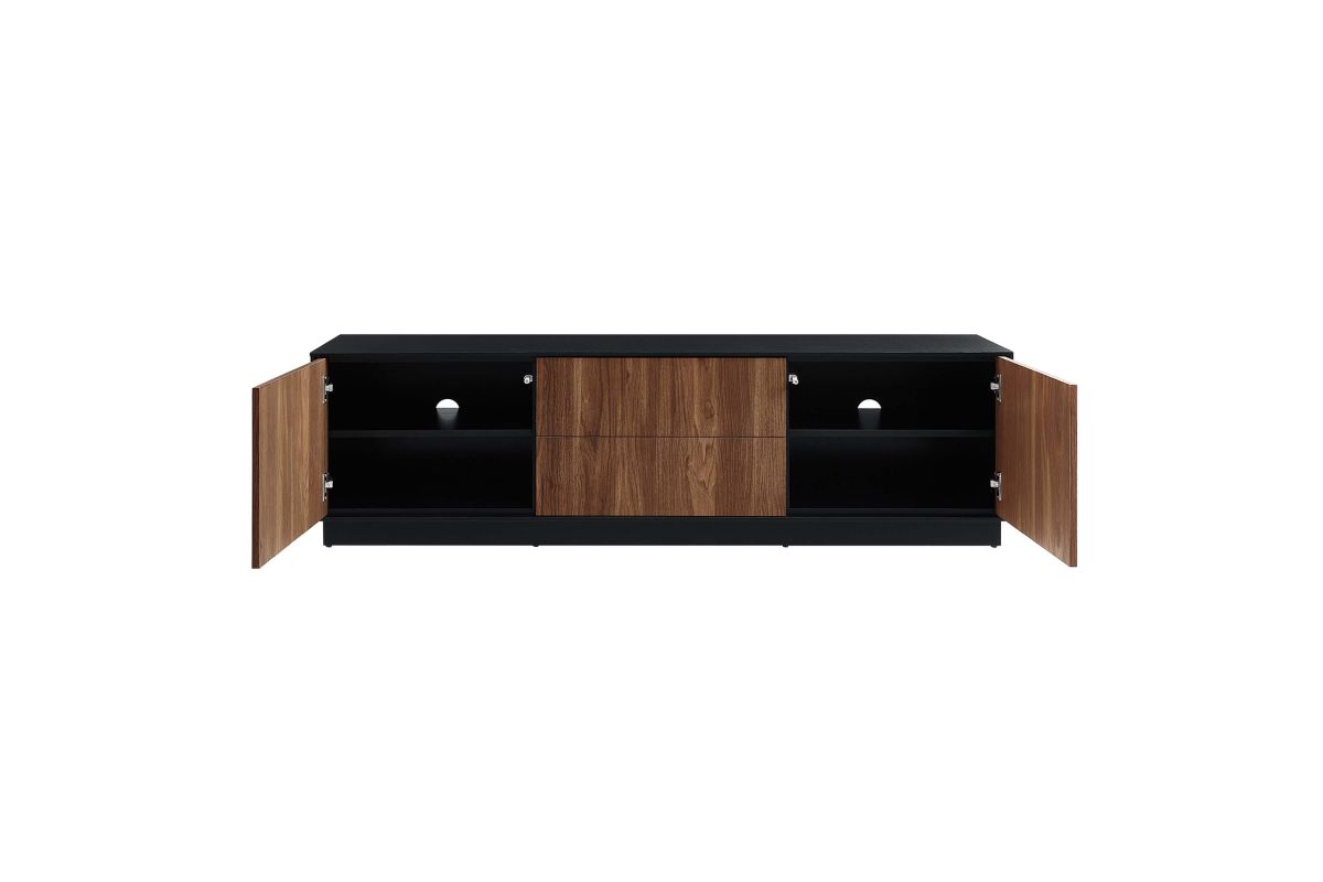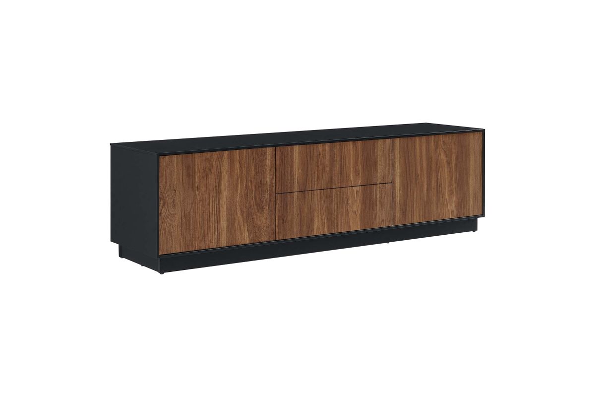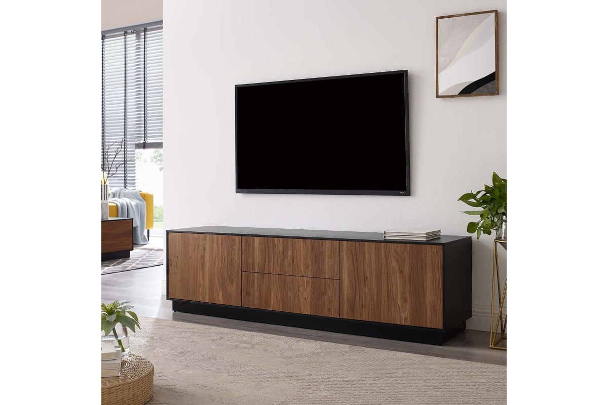 Merge sophistication and utility with the Holden 63" TV Stand. Constructed from MDF and durable particleboard, this TV stand features a wood grain laminate on its cabinets and drawers. Bestowing a rustic flair that complements any contemporary setting, Holden supports flat screen TVs up to 70 inches. Experience modern convenience with push-to-open cabinetry and thoughtfully designed shelving behind two hinged doors. Featuring two full-glide drawers, two cable management holes, and resting on a sleek plinth base, the versatile storage solutions of Holden's design allow it to serve as a spacious living room storage unit for media devices, games, gadgets, and other household items. Assembly Required. Weight Capacity: 200 lbs.