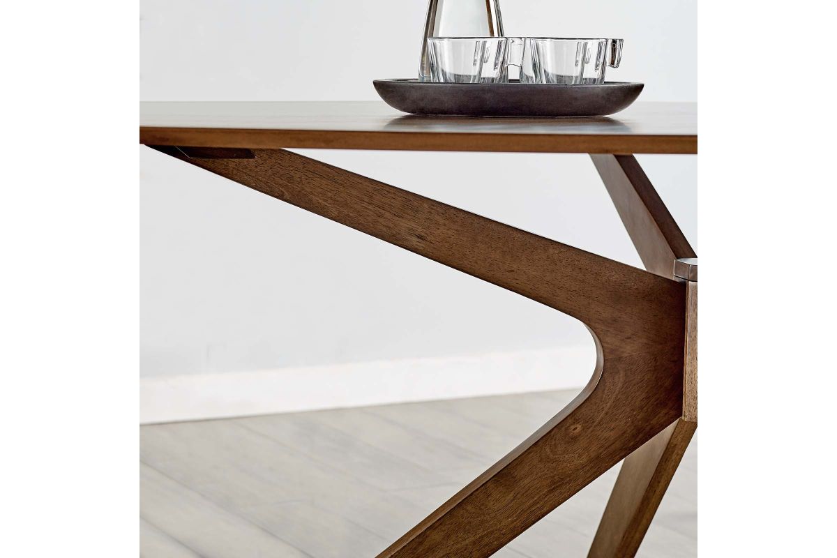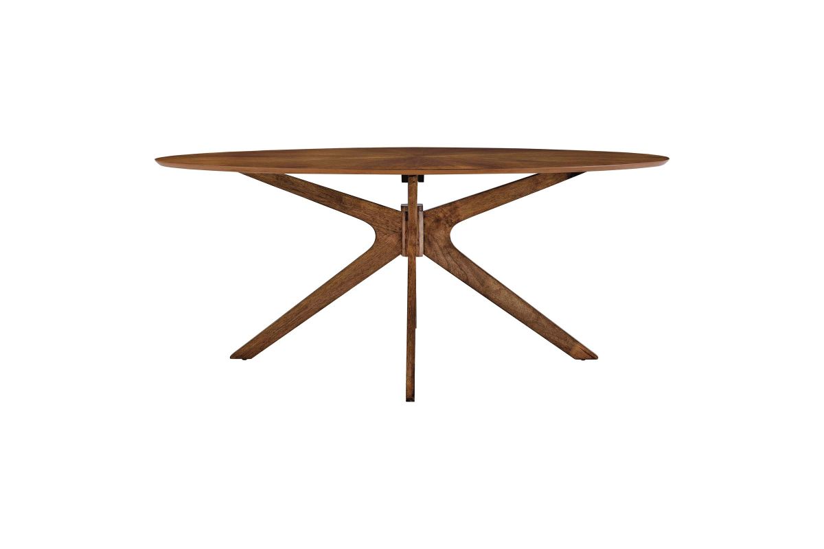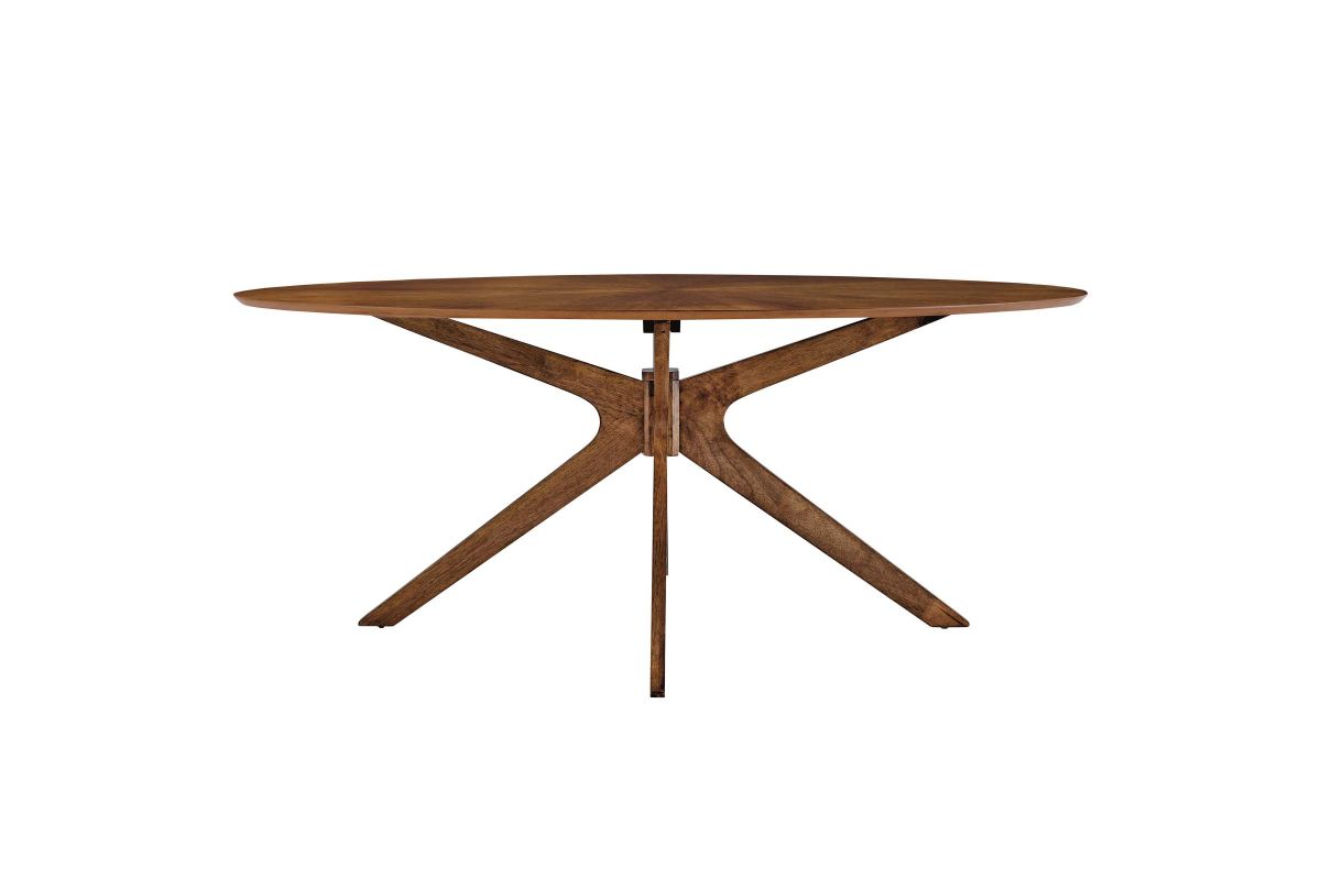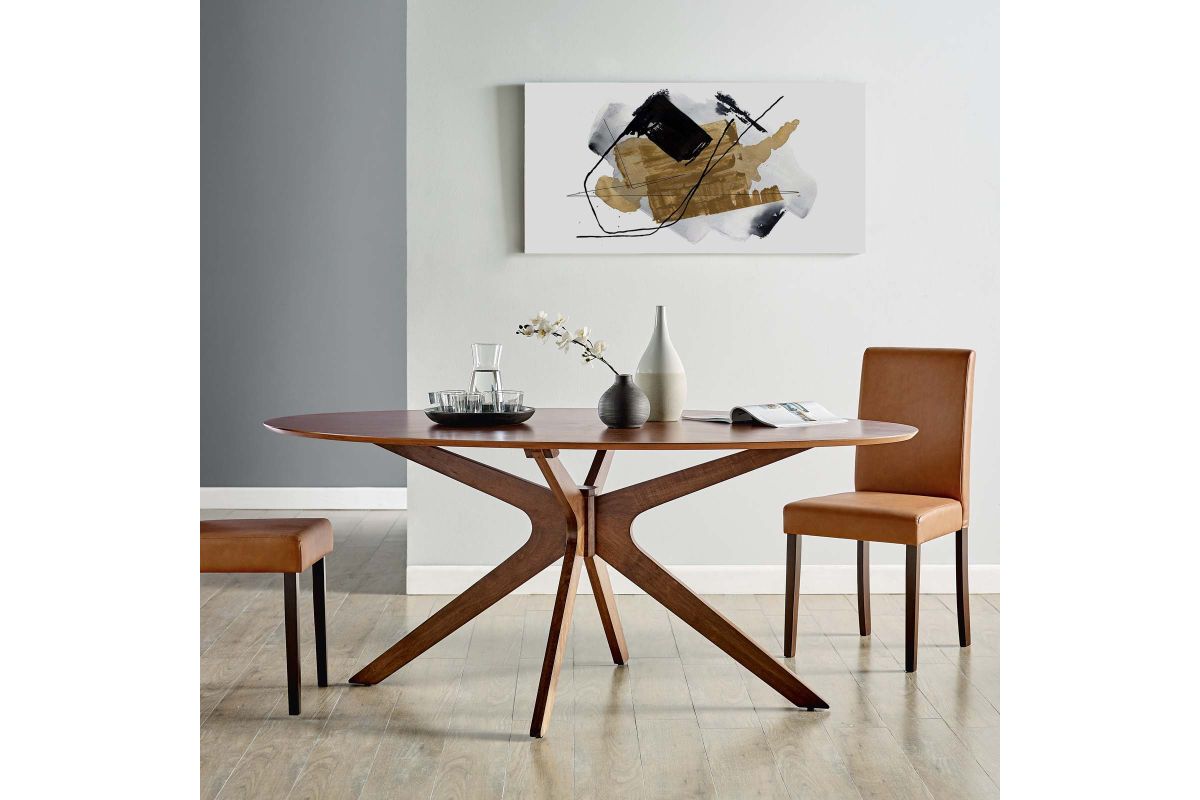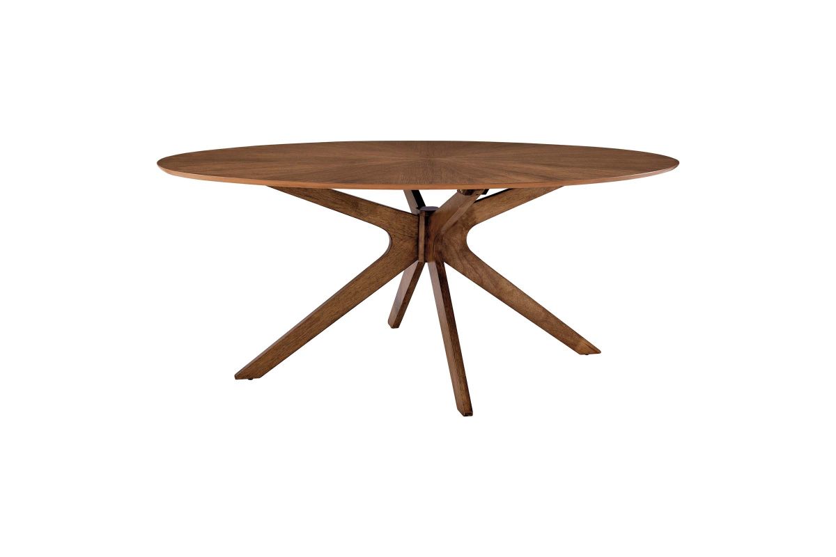 Invite the lighthearted banter and deep conversations that make gatherings memorable as you circle around the Crossroads 71" Oval Wood Dining Table. Sturdily constructed from rubberwood and MDF particleboard, the Crossroads Dining Table has a beautiful wood grain veneer finish. A unique base made of intersecting wooden legs supports the eye-catching oval dining table that will be the focal point of your dining room decor. Crossroads seats up to six people and is ideally suited for the dining room, kitchen, breakfast nook, or other dining area in your modern home or apartment. Weight Capacity: 400 lbs.