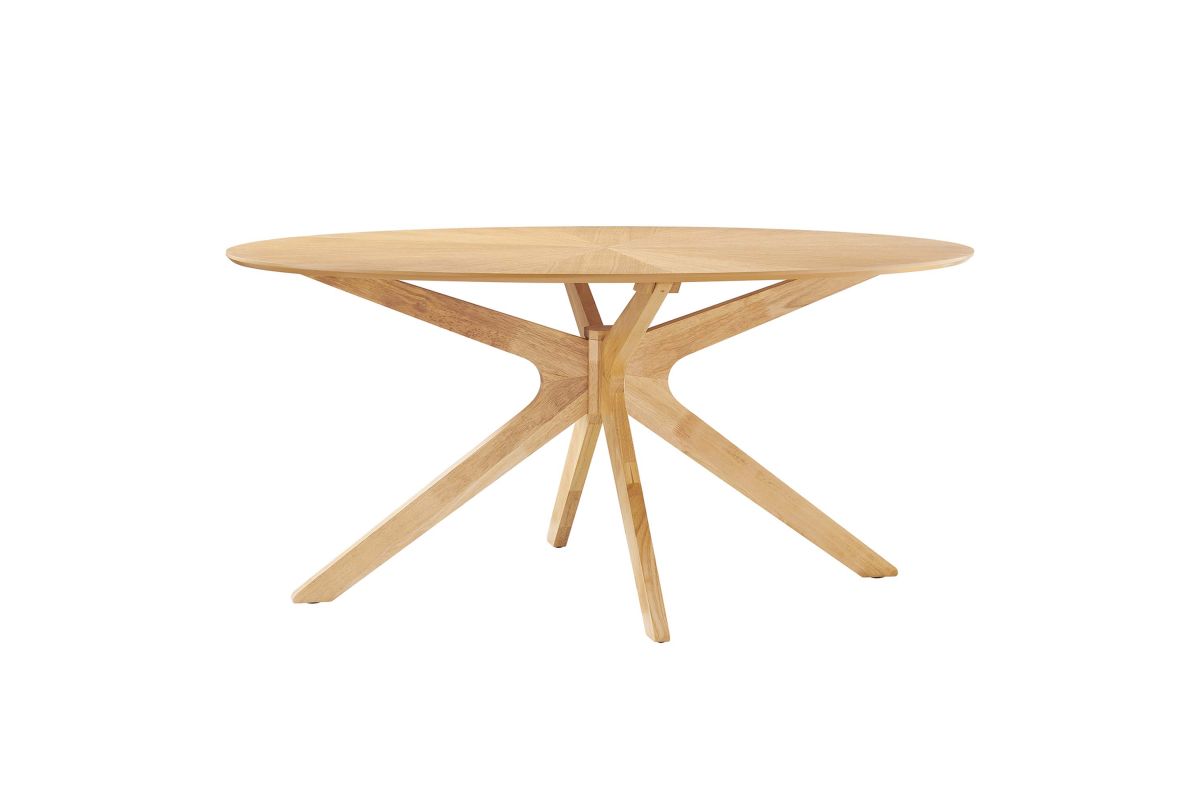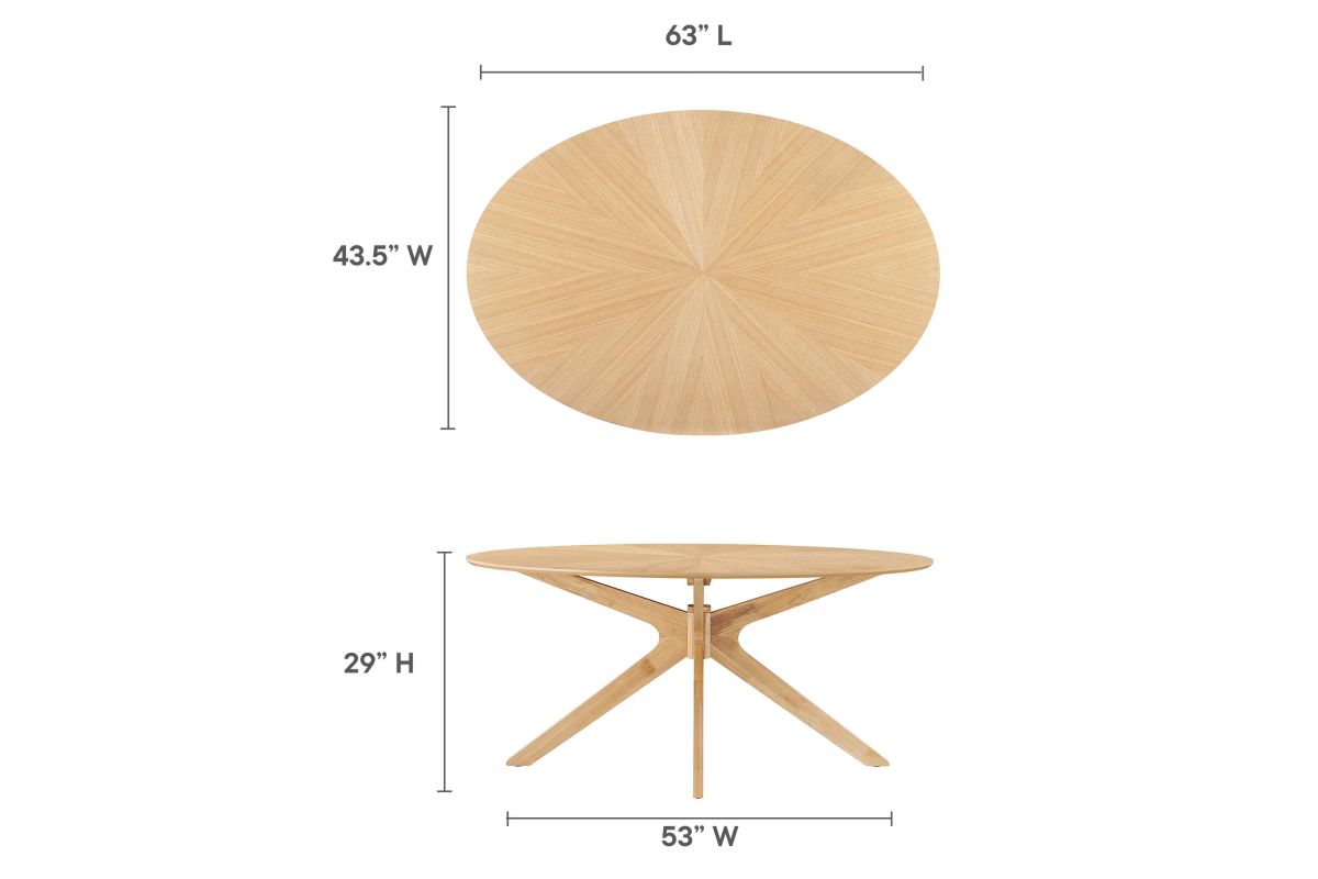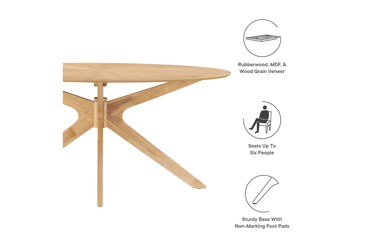 Invite the lighthearted banter and deep conversations that make gatherings memorable as you circle around the Crossroads 63" Oval Wood Dining Table. Sturdily constructed from rubberwood and MDF particleboard, the Crossroads Dining Table has a beautiful wood grain veneer finish. A unique base made of intersecting wooden legs supports the eye-catching oval dining table that will be the focal point of your dining room decor. Crossroads seats up to six people and is ideally suited for the dining room, kitchen, breakfast nook, or other dining area in your modern home or apartment. Weight Capacity: 400 lbs.