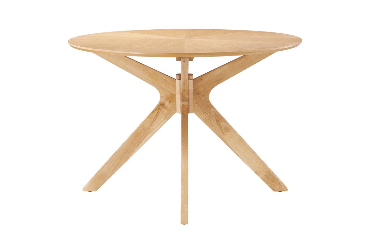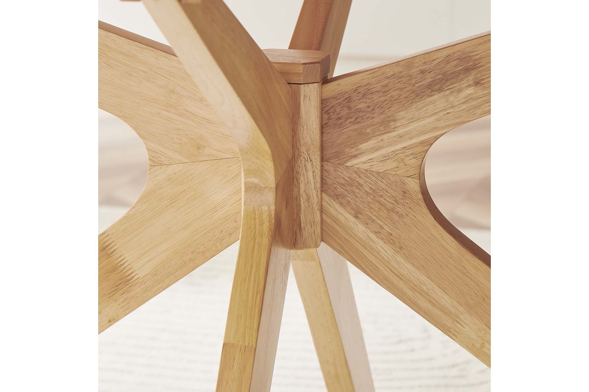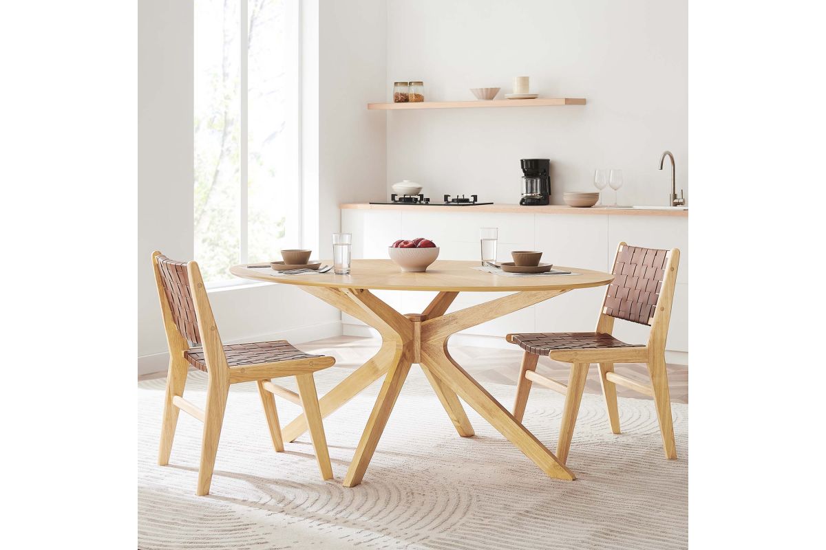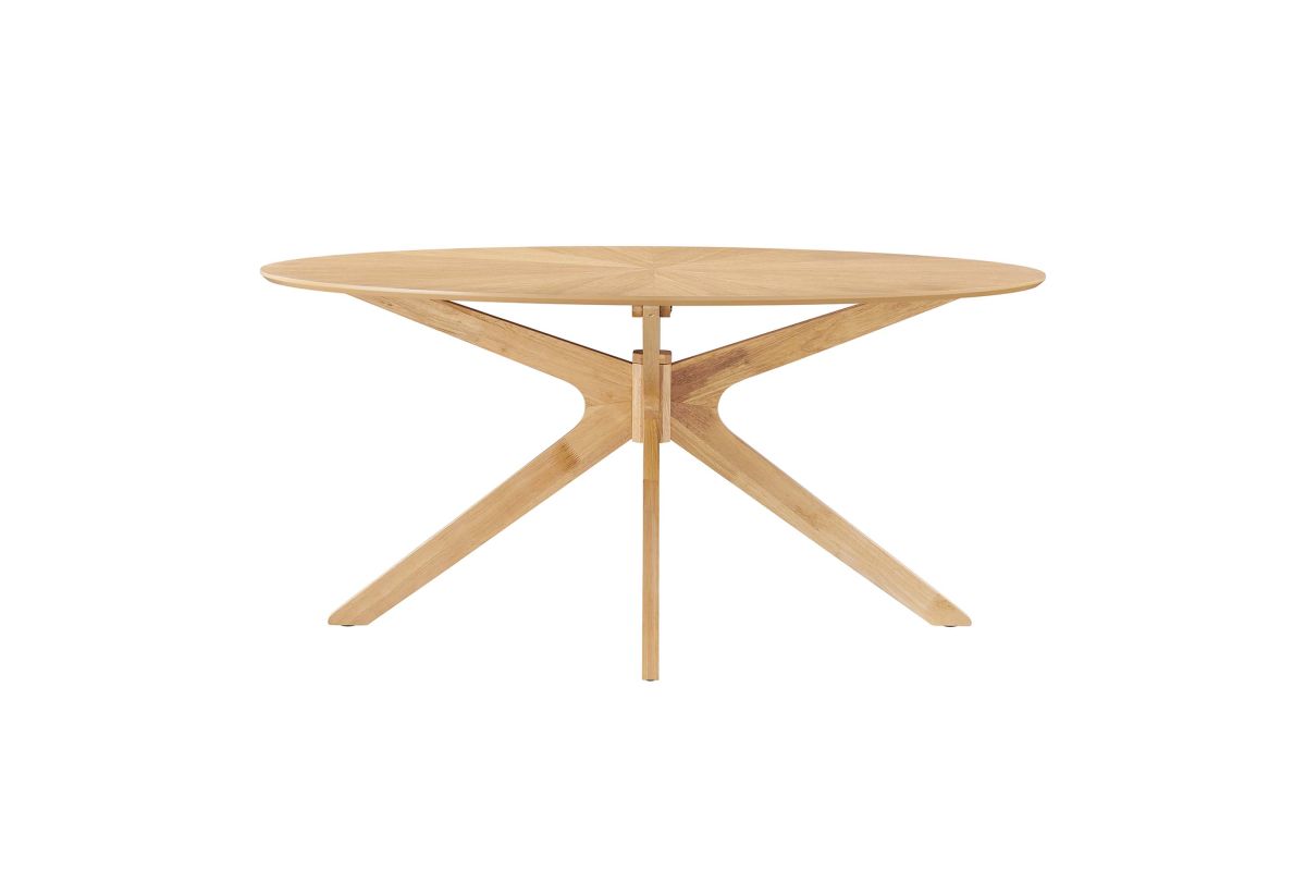Invite the lighthearted banter and deep conversations that make gatherings memorable as you circle around the Crossroads 63" Oval Wood Dining Table. Sturdily constructed from rubberwood and MDF particleboard, the Crossroads Dining Table has a beautiful wood grain veneer finish. A unique base made of intersecting wooden legs supports the eye-catching oval dining table that will be the focal point of your dining room decor. Crossroads seats up to six people and is ideally suited for the dining room, kitchen, breakfast nook, or other dining area in your modern home or apartment. Weight Capacity: 400 lbs.