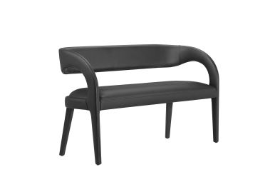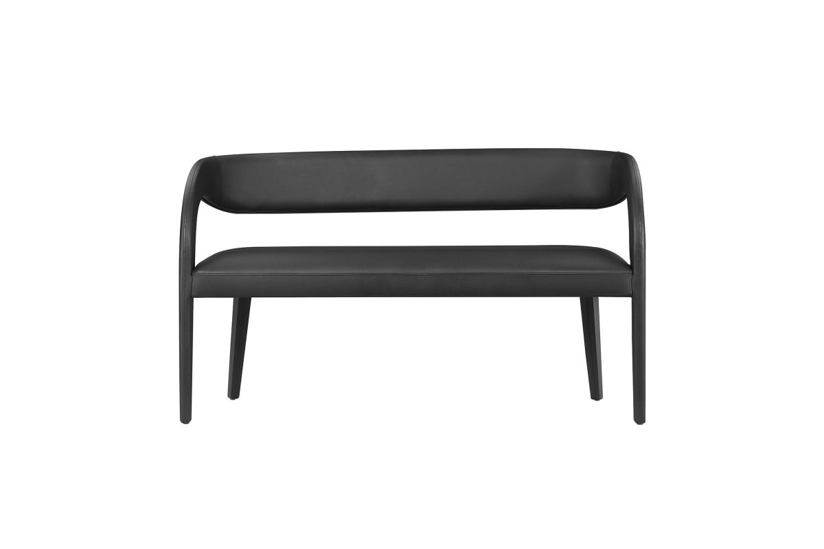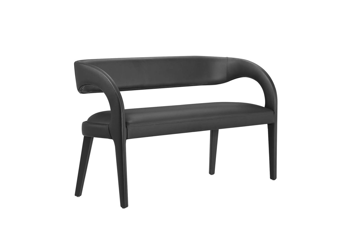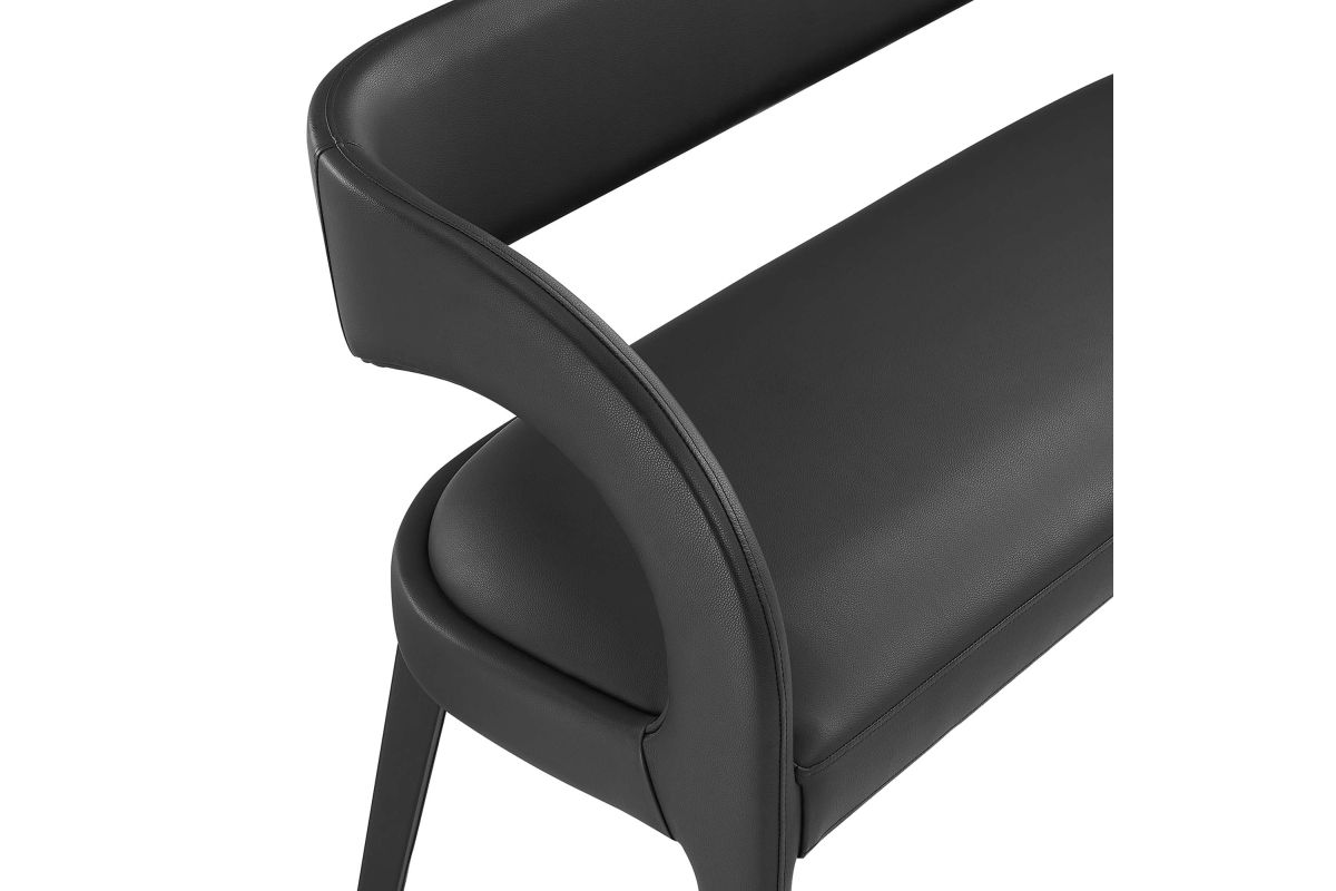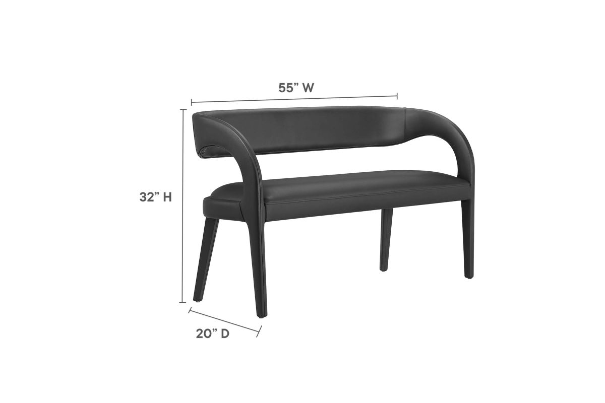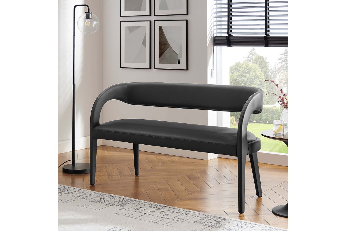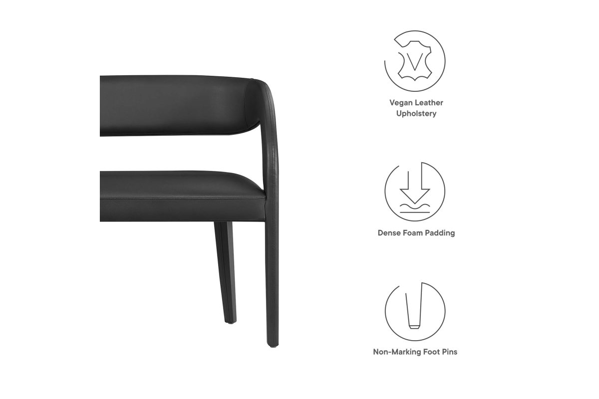 Experience the perfect blend of modern sophistication and luxurious comfort with the Pinnacle Vegan Leather Upholstered Accent Bench. Whether used as a dining bench or accent bench, its distinct silhouette showcases a curved backrest and an open design that effortlessly enhances your dining or living space with luxe style. This modern bench indulges your senses with its dense foam padding, upholstered in a smooth, quality vegan leather. Non-marking plastic foot pins ensure your flooring remains free from scuffs and scratches. With no assembly required, this bench offers a stylish statement instantly. Weight Capacity: 330 lbs.