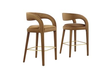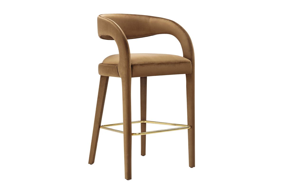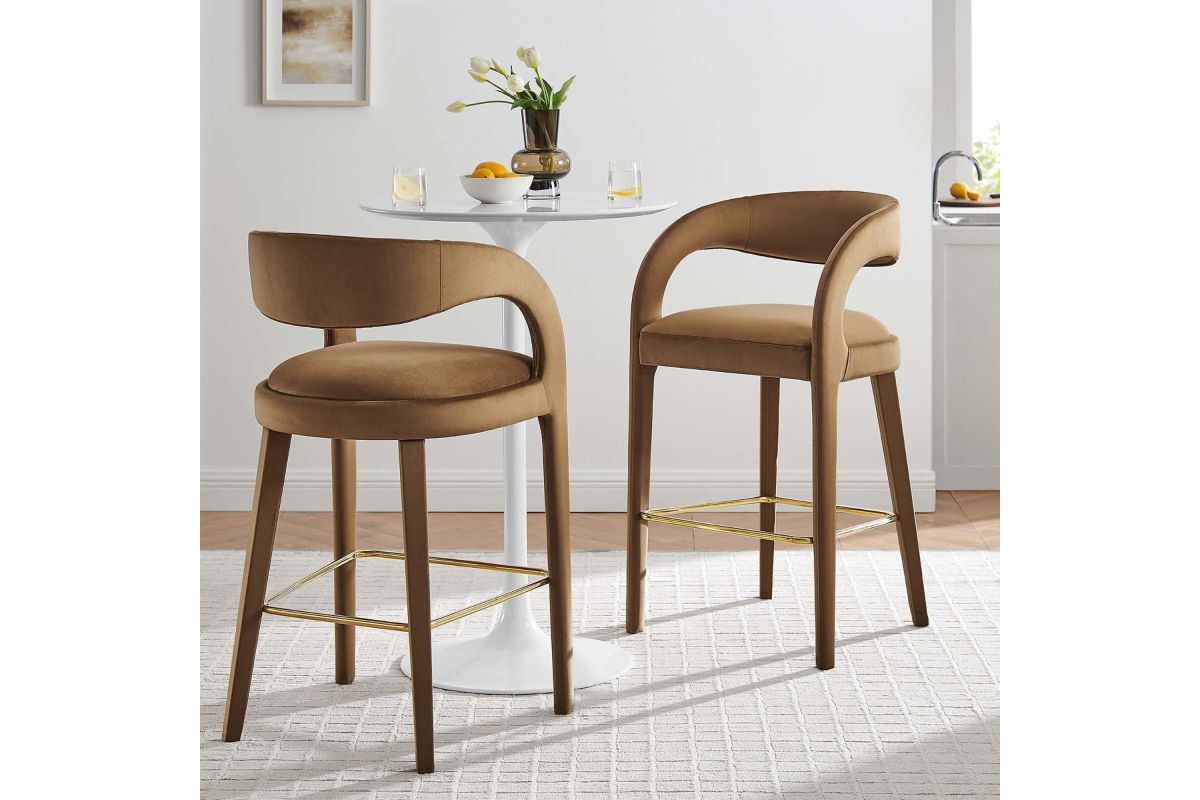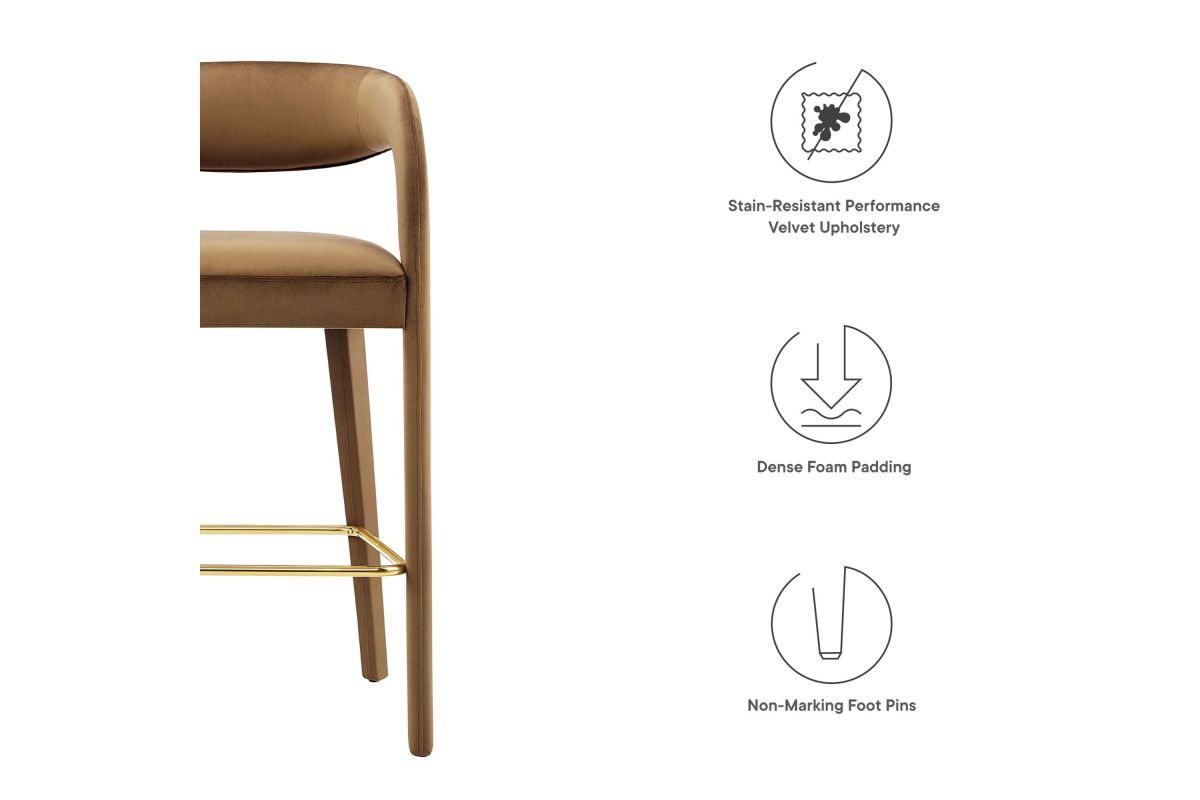 Experience the perfect blend of modern sophistication and luxurious comfort with the Pinnacle Performance Velvet Upholstered Bar Stool Set of Two. The distinct silhouette showcases a curved backrest and an open design that effortlessly enhances your dining space or kitchen area with luxe style. This bar-height stool set indulges your senses with its dense foam padding, upholstered in a tactile, stain-resistant performance velvet fabric. Non-marking plastic foot pins ensure your flooring remains free from scuffs and scratches. With minimal assembly needed, this bar stool set not only offers a stylish statement but also a hassle-free setup. Weight Capacity: 330 lbs.
