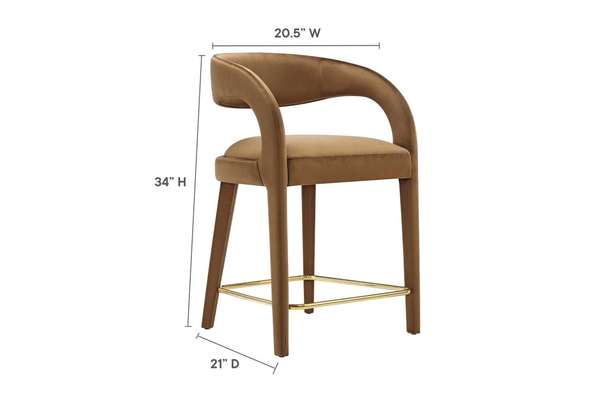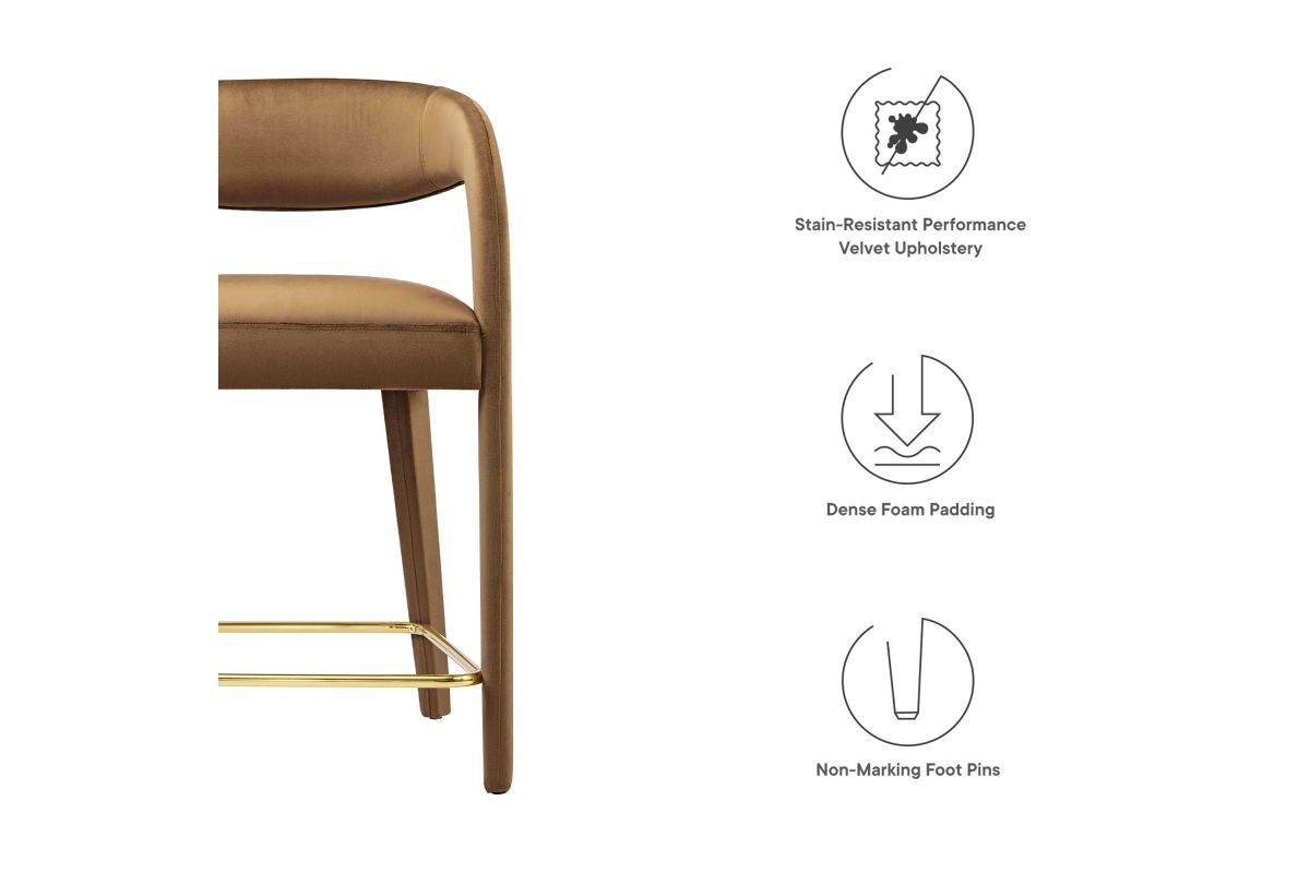 Experience the perfect blend of modern sophistication and luxurious comfort with the Pinnacle Performance Velvet Upholstered Counter Stool Set of Two. The distinct silhouette showcases a curved backrest and an open design that effortlessly enhances your dining space or kitchen area with luxe style. This counter-height stool set indulges your senses with its dense foam padding, upholstered in a tactile, stain-resistant performance velvet fabric. Non-marking plastic foot pins ensure your flooring remains free from scuffs and scratches. With minimal assembly needed, this counter stool set not only offers a stylish statement but also a hassle-free setup. Weight Capacity: 330 lbs.