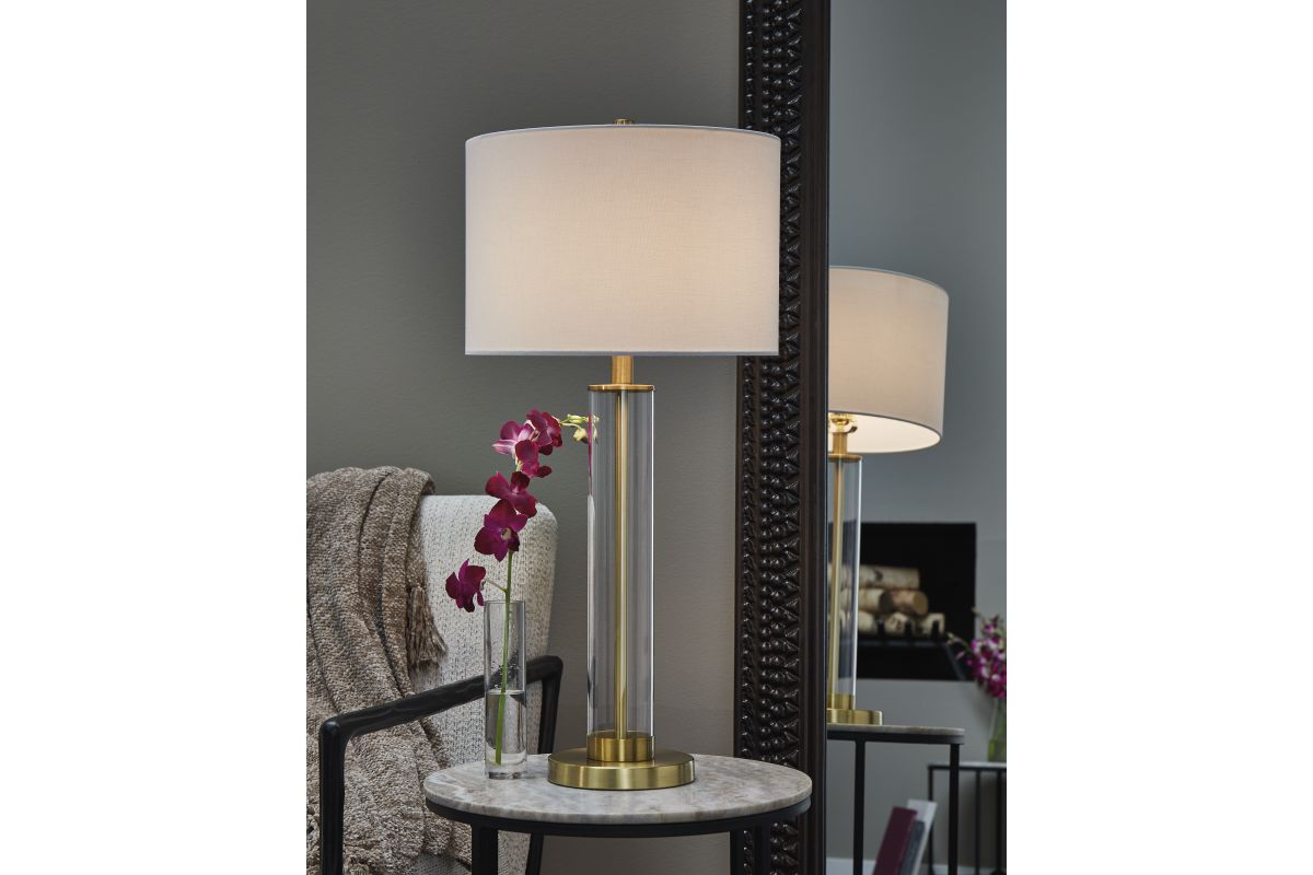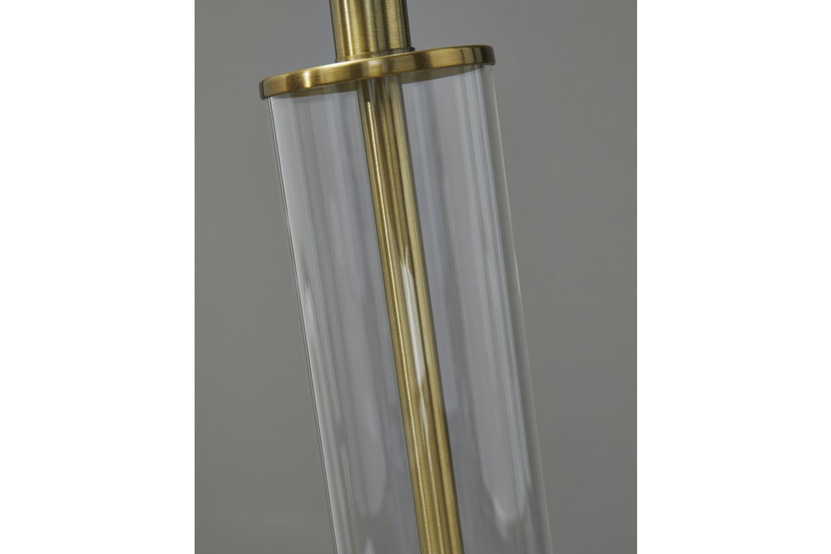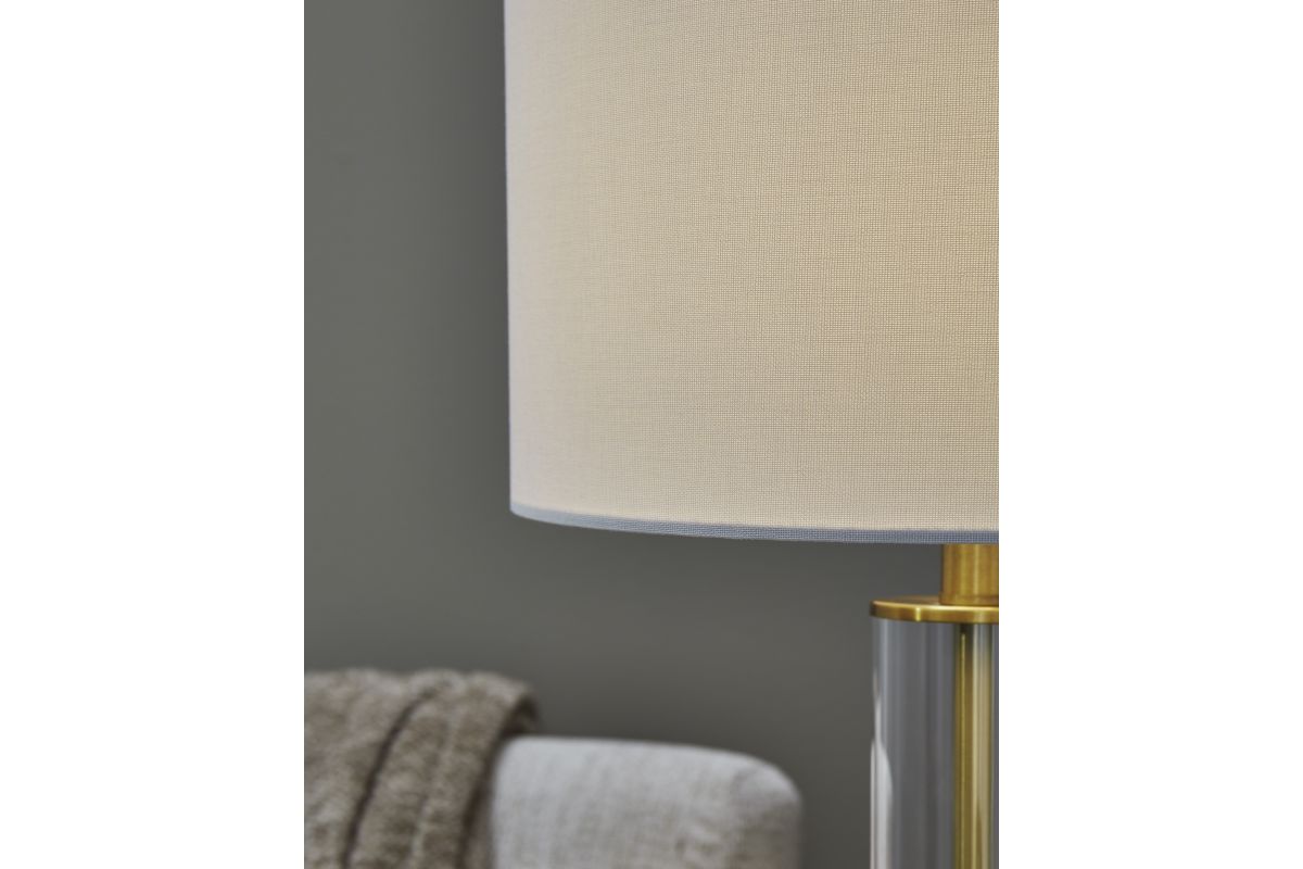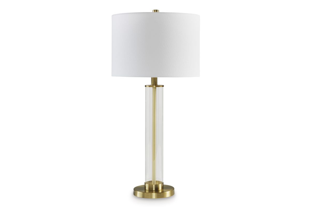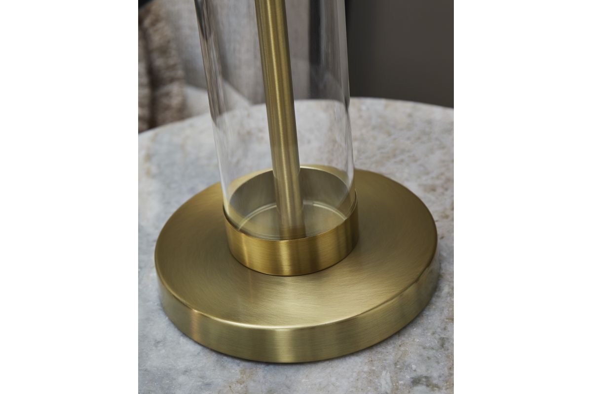 The body of this elegant table lamp has a contemporary flair, with a transparent glass cylinder that reveals a brass-tone rod inside. It's a minimal design made for maximal illumination.
