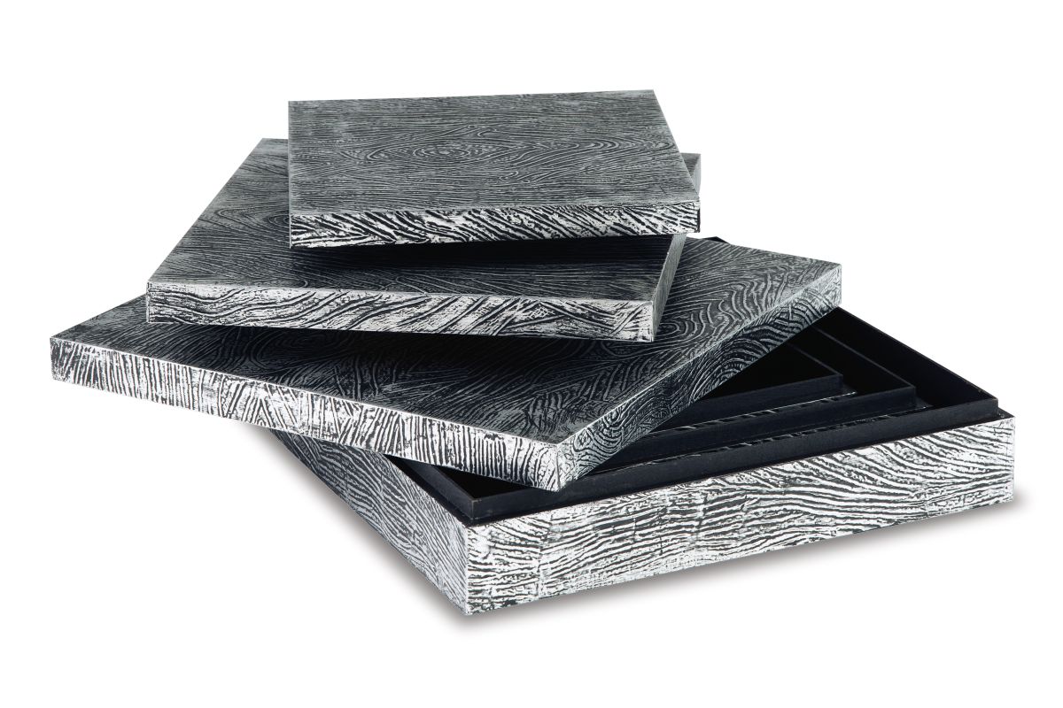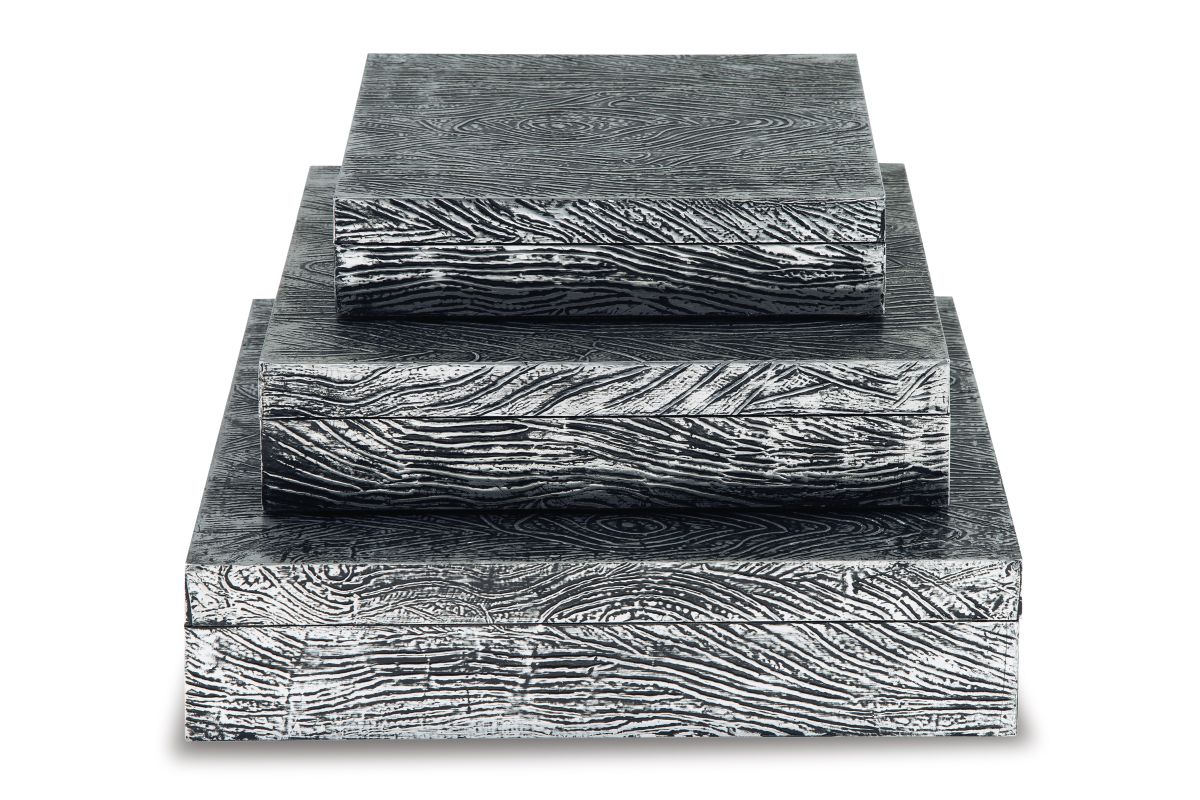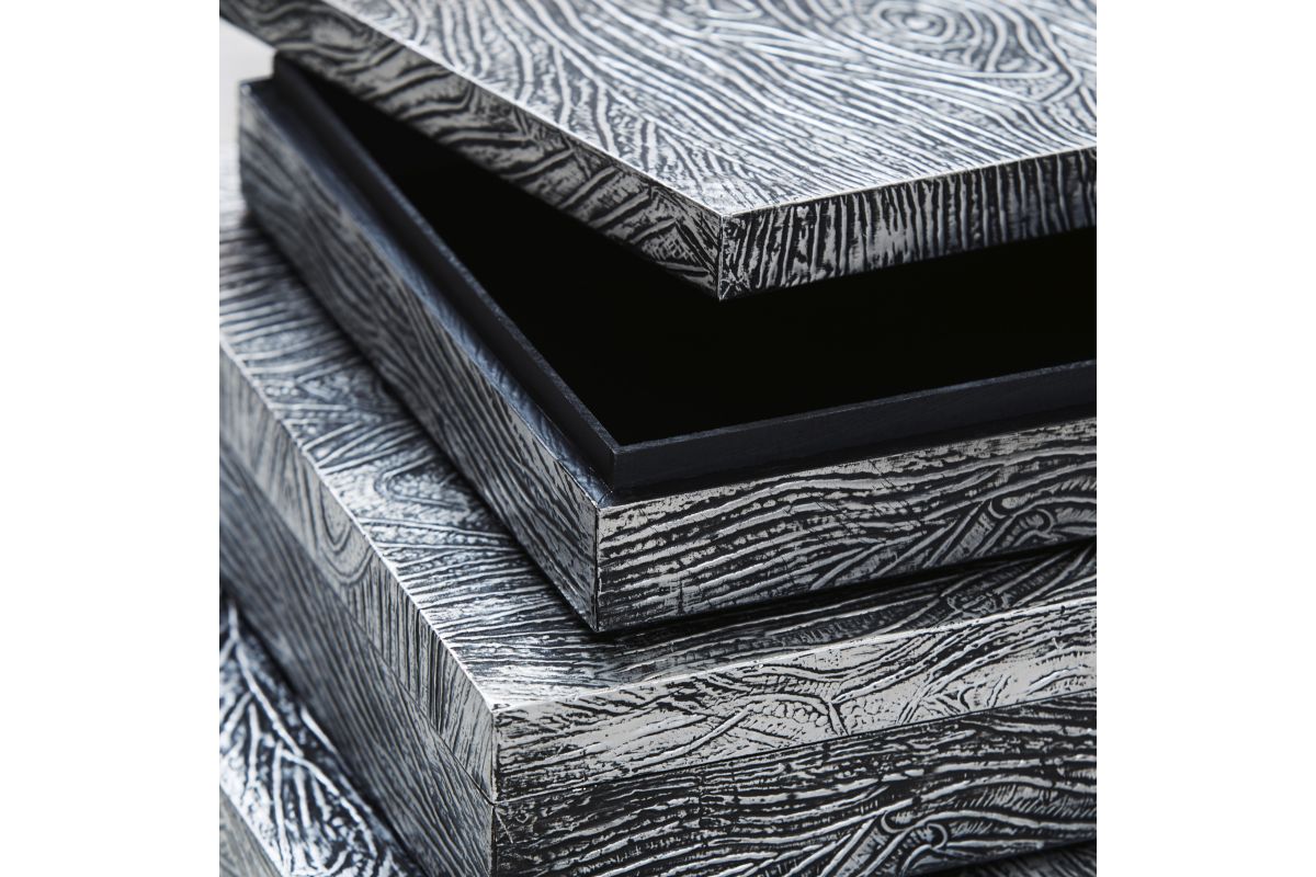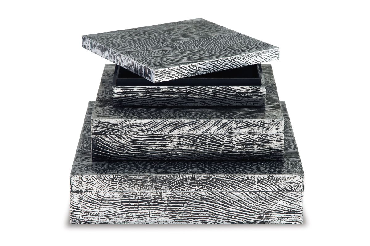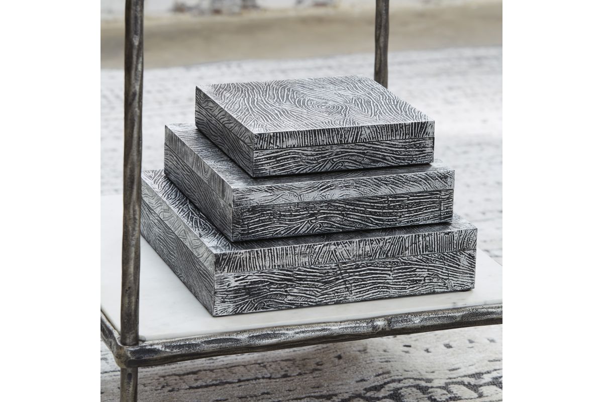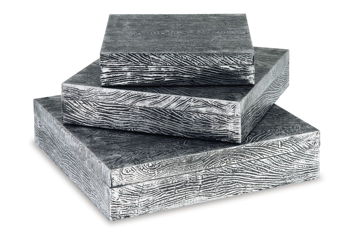 Ideal for a dresser, chest or accent table, this set of three wood and metal boxes is a contemporary choice for the forward-thinking modernist. The antiqued pewter-tone finish is an inspired touch.