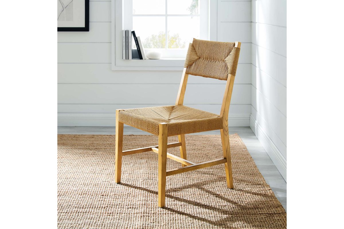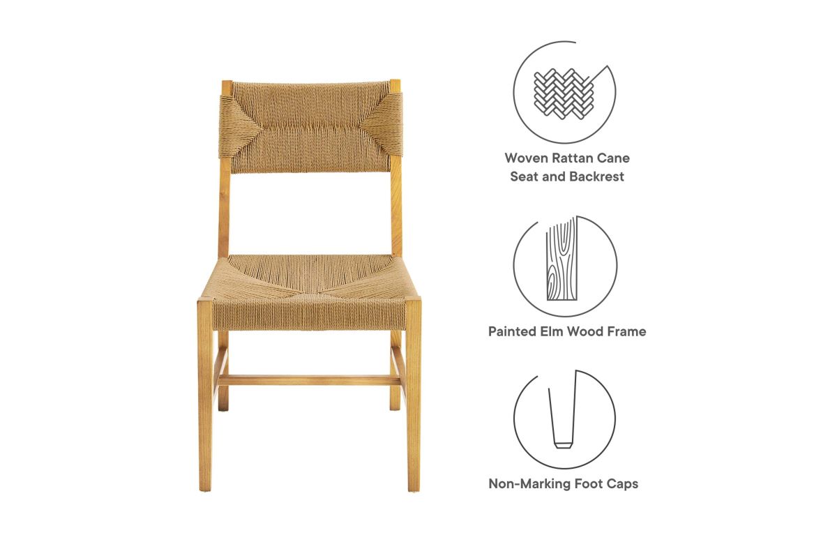 Introduce calm coastal style and modern farmhouse charm to your dining space with the Bodie Dining Side Chair. Featuring a woven paper rope backrest and seat, this dining chair brings alluring texture to a dining table or to the living room as an accent chair. This side chair is crafted with a durable elm wood frame with stretchers connecting the legs for added interest. Includes plastic foot glides to protect flooring. Weight Capacity: 330 lbs.