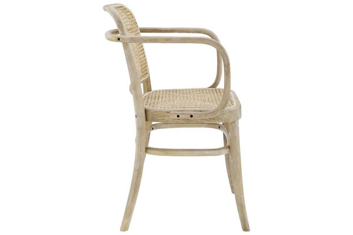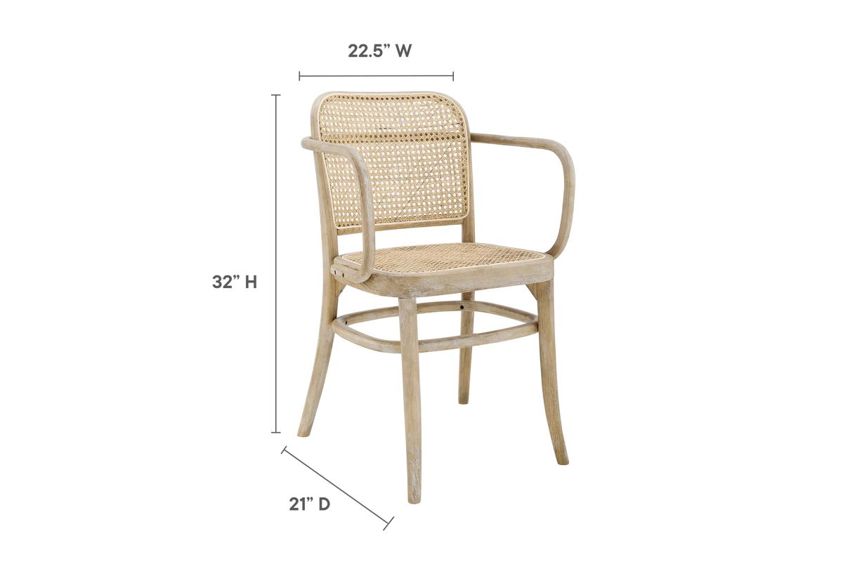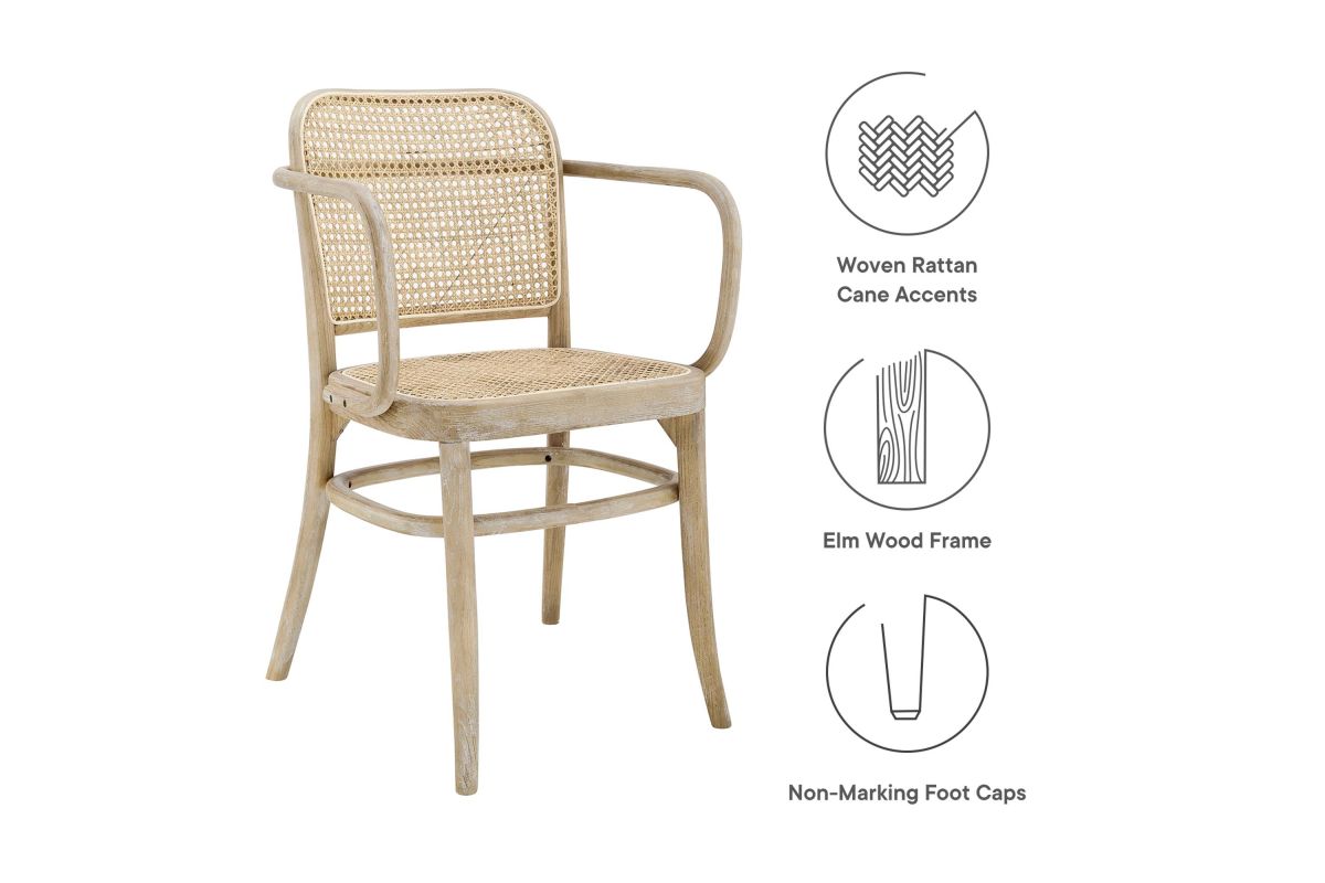 Blending rustic farmhouse charm and coastal serenity in your dining space with the Winona Dining Chair. Featuring a woven rattan cane backrest and seat, this dining chair instills vintage modernity around your dining table or as an accent chair in your living space. This dining armchair is complete with a durable elm wood frame with rounded edges and armrests. Includes non-marking foot caps. Weight Capacity: 330 lbs.