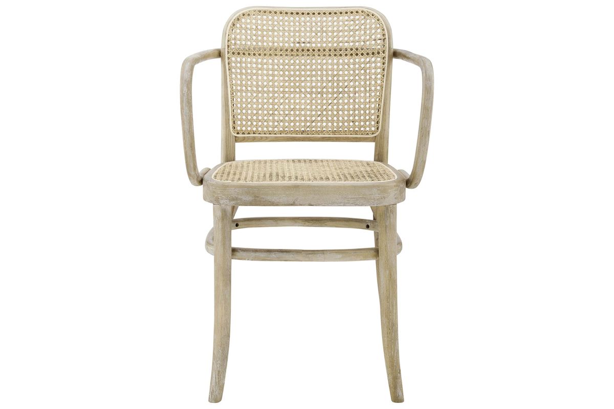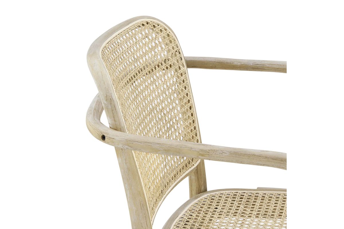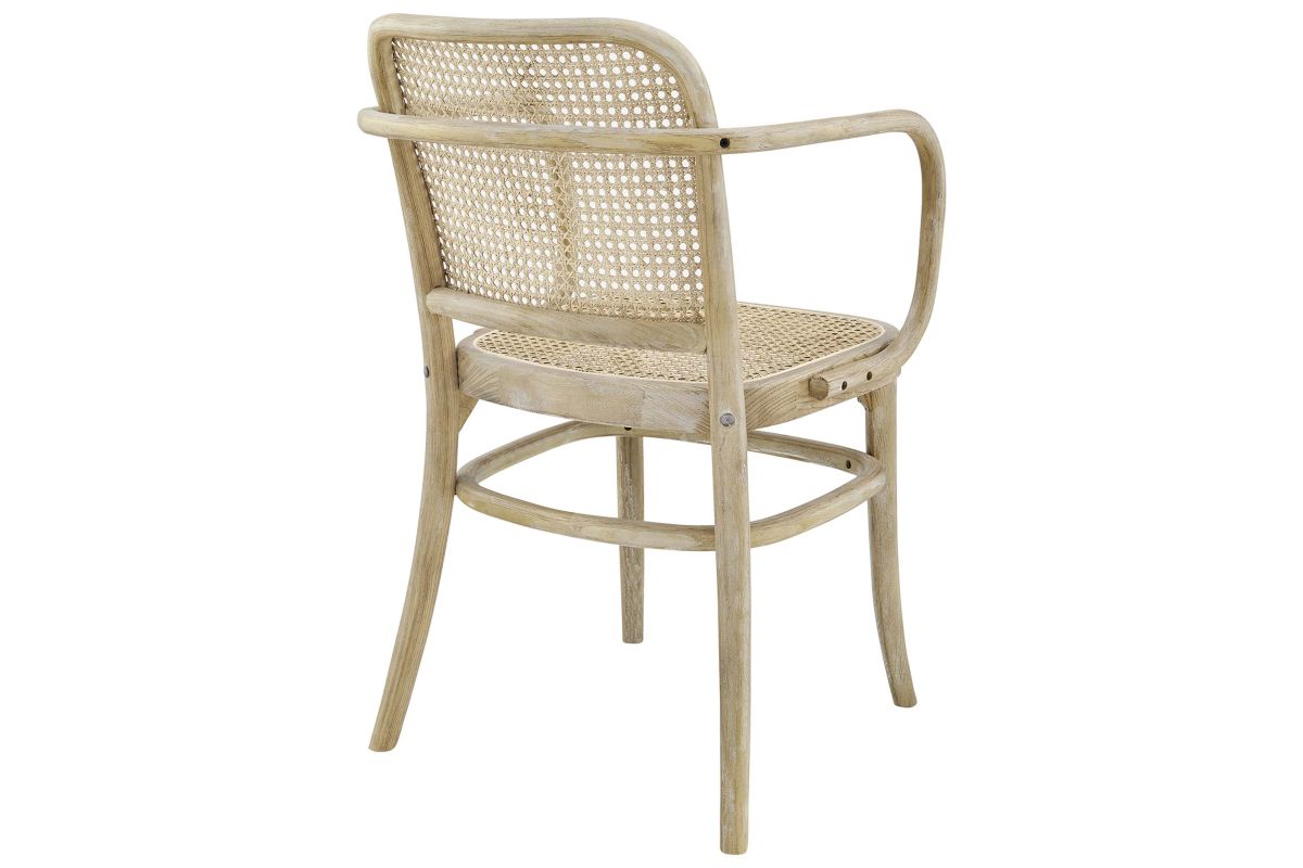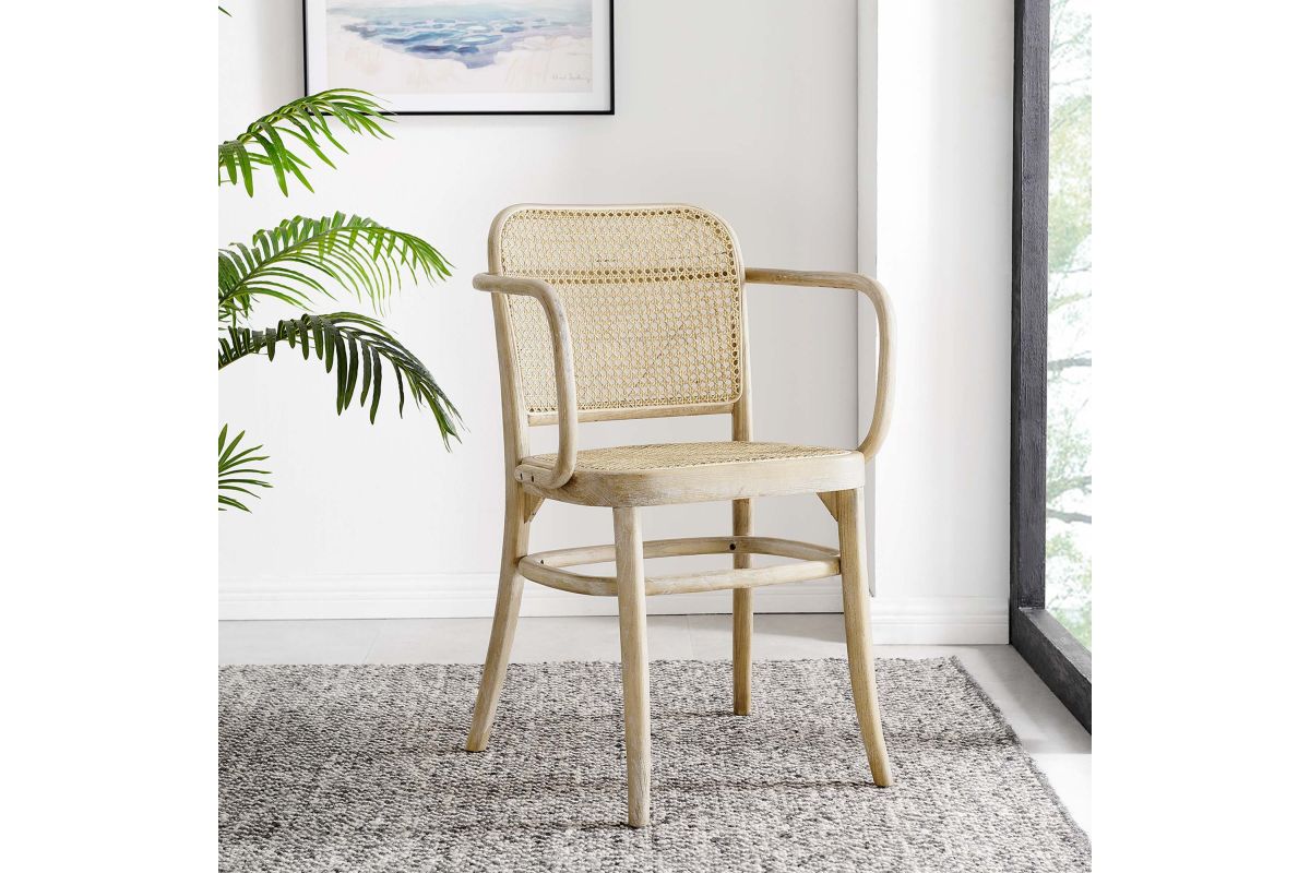 Blending rustic farmhouse charm and coastal serenity in your dining space with the Winona Dining Chair. Featuring a woven rattan cane backrest and seat, this dining chair instills vintage modernity around your dining table or as an accent chair in your living space. This dining armchair is complete with a durable elm wood frame with rounded edges and armrests. Includes non-marking foot caps. Weight Capacity: 330 lbs.