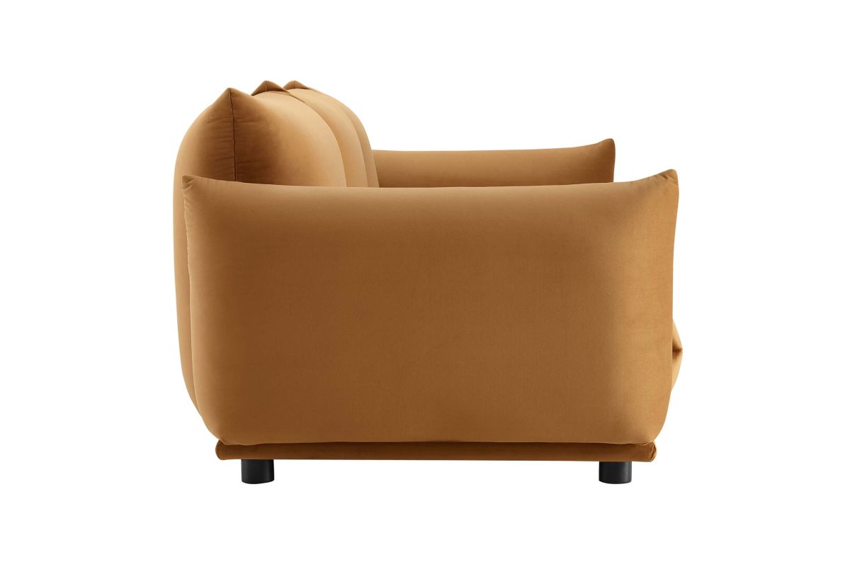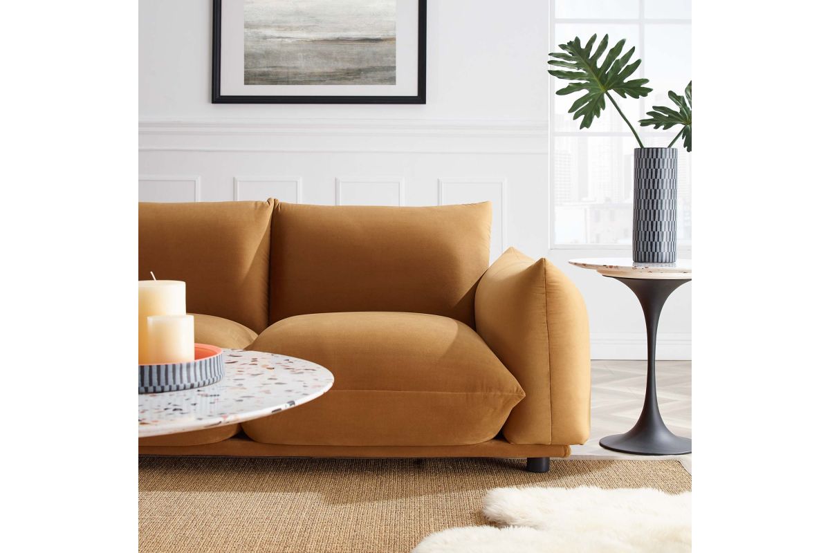 Sink into pillowy plush comfort with the Copious Performance Velvet Sofa. Featuring an overstuffed design, this sofa offers premium comfort with its plump cushions and soft, stain-resistant performance velvet upholstery. This cozy sofa is made for lounging and makes a bold statement in the living room, family room, or other lounge area. Resting atop rubberwood legs with non-marking foot caps, this sofa is crafted with dense foam padding and a solid wood and plywood frame for lasting durability. Weight Capacity: 993 lbs.