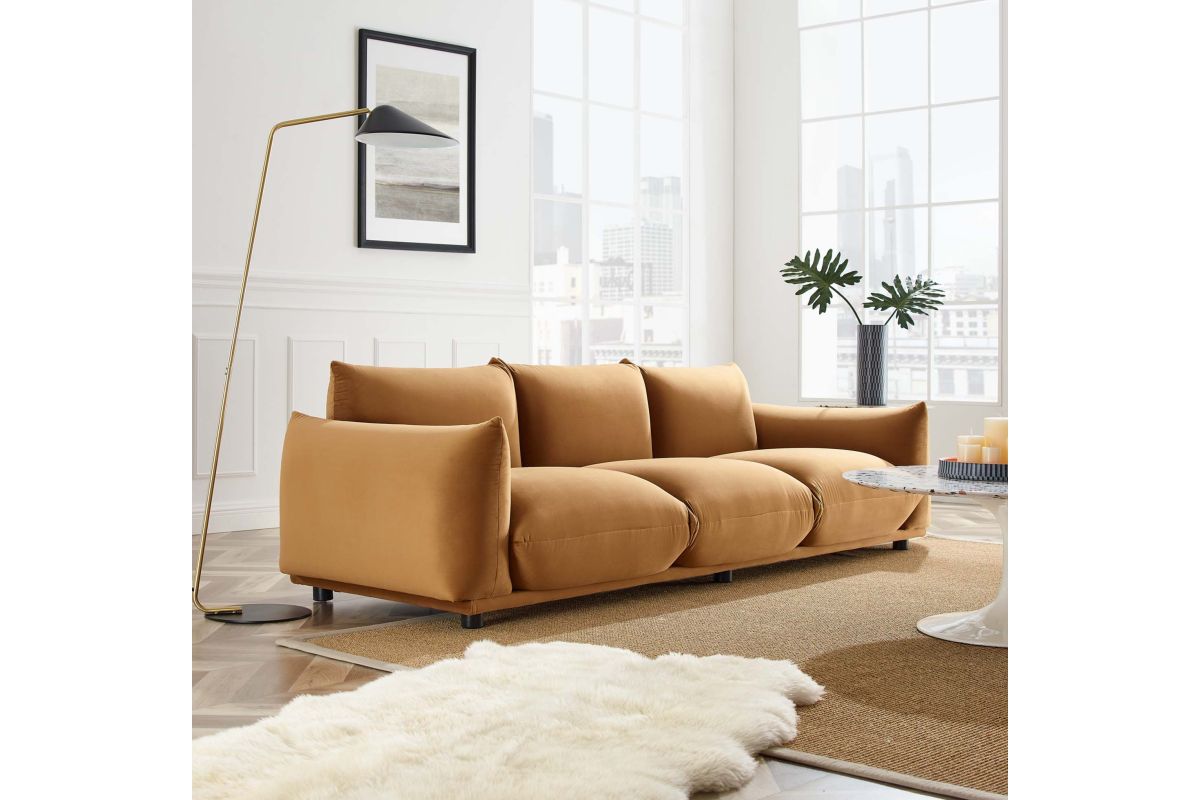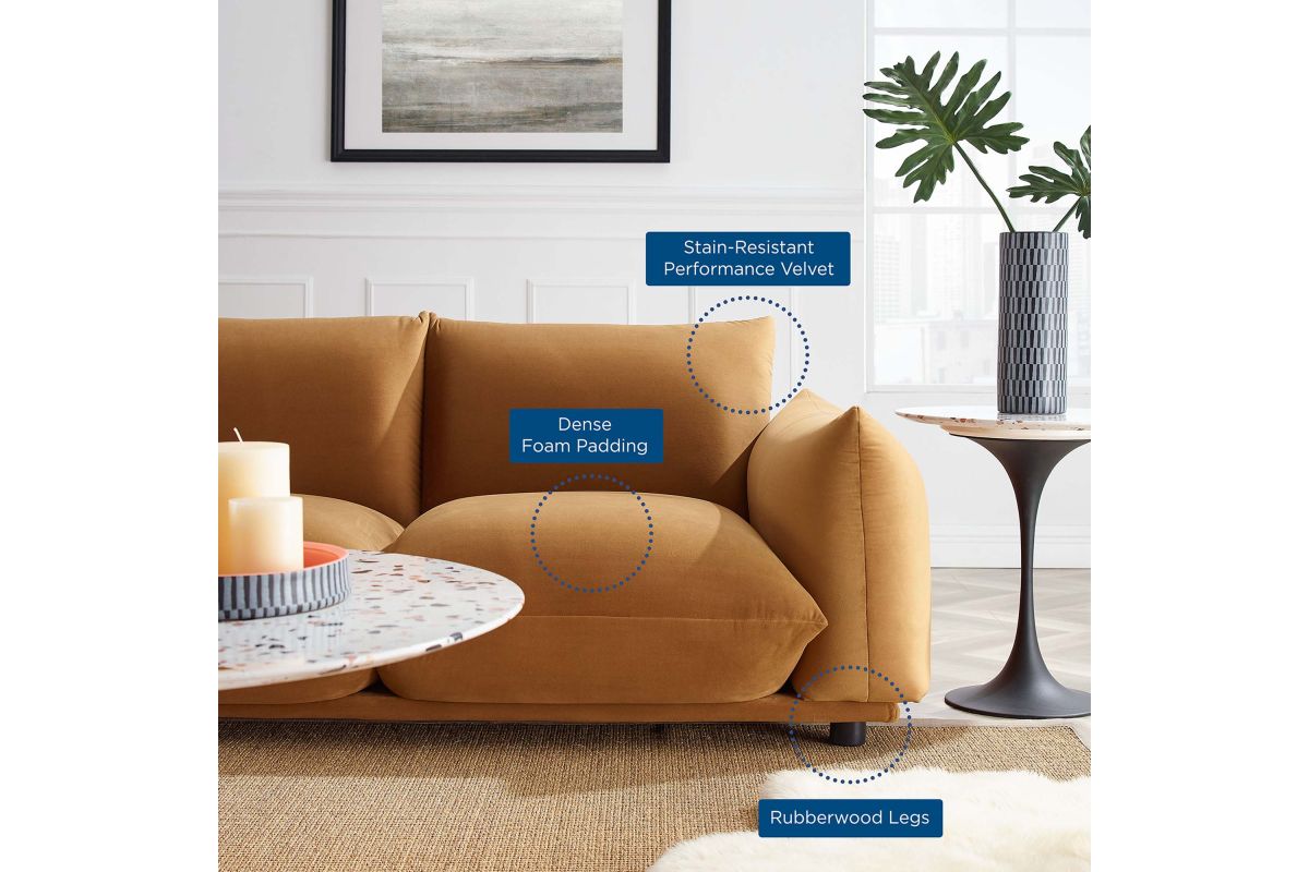 - Modern SofaStain-Resistant Performance VelvetDense Foam PaddingRubberwood LegsNon-Marking Foot CapsAssembly RequiredWeight Capacity: 993 lbs.