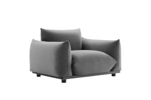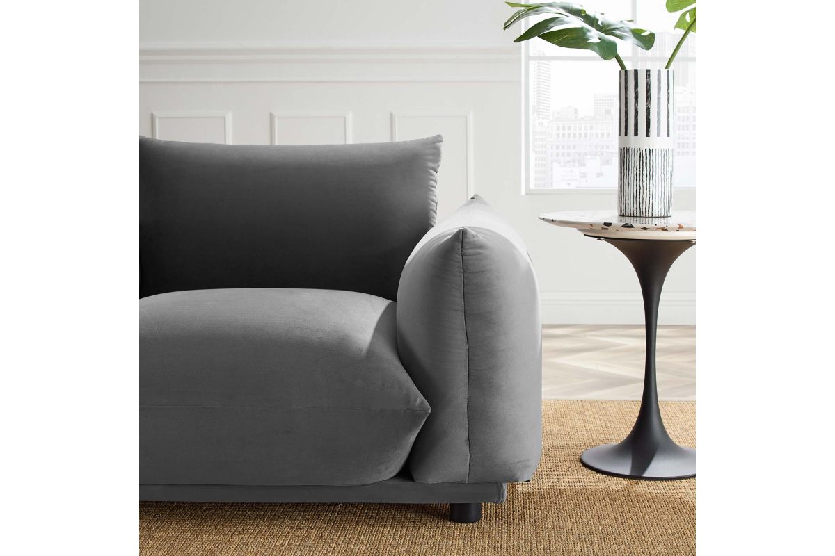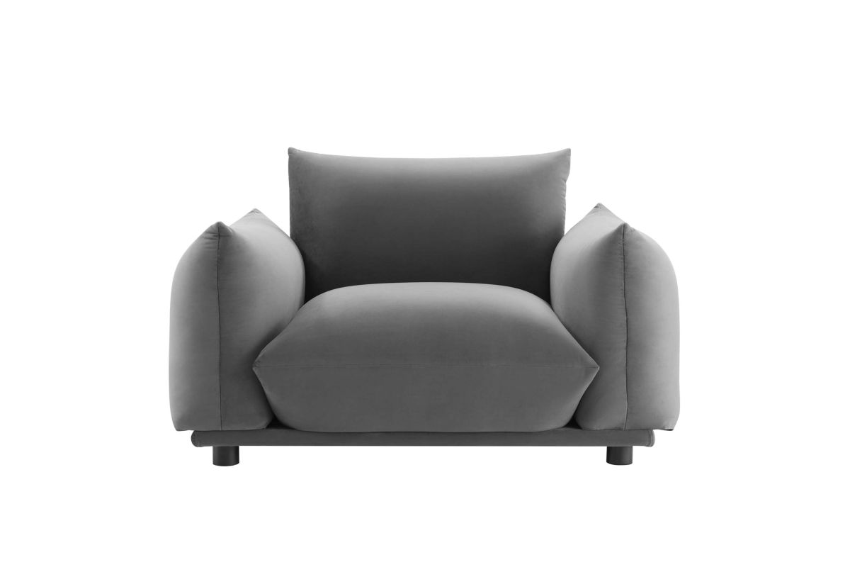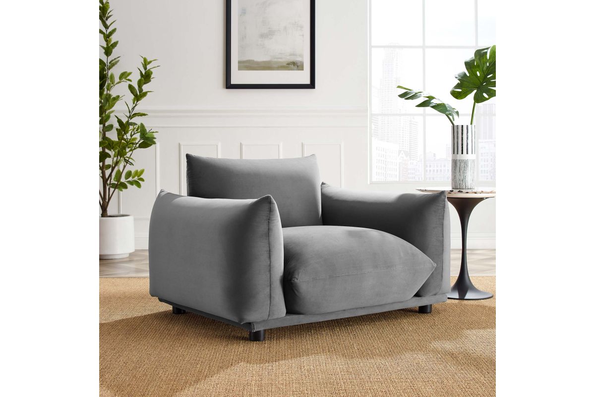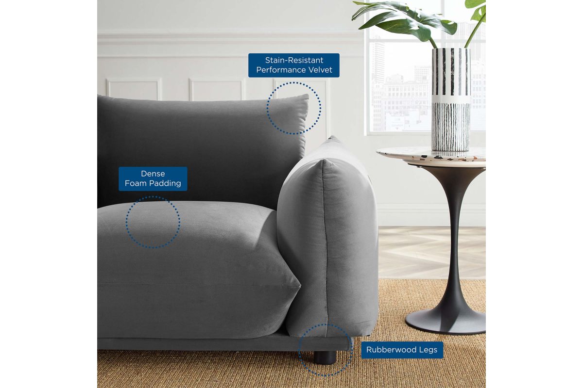Sink into pillowy plush comfort with the Copious Performance Velvet Armchair. Featuring an overstuffed design, this accent chair offers premium comfort with its plump cushions and soft, stain-resistant performance velvet upholstery. This cozy chair is made for lounging and makes a bold statement in the living room, family room, bedroom, entryway, or other lounge area. Resting atop rubberwood legs with non-marking foot caps, this velvet chair is crafted with dense foam padding and a solid wood and plywood frame for lasting durability. Weight Capacity: 330 lbs.