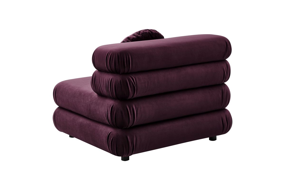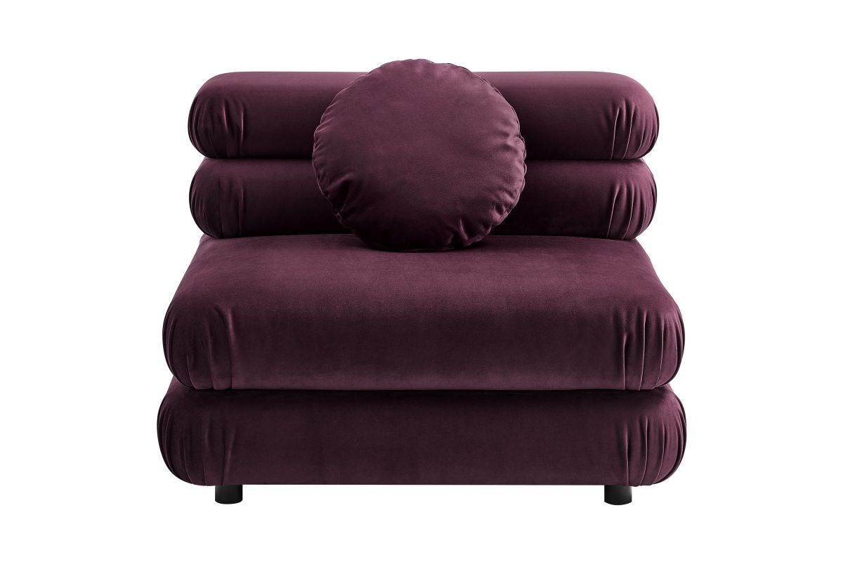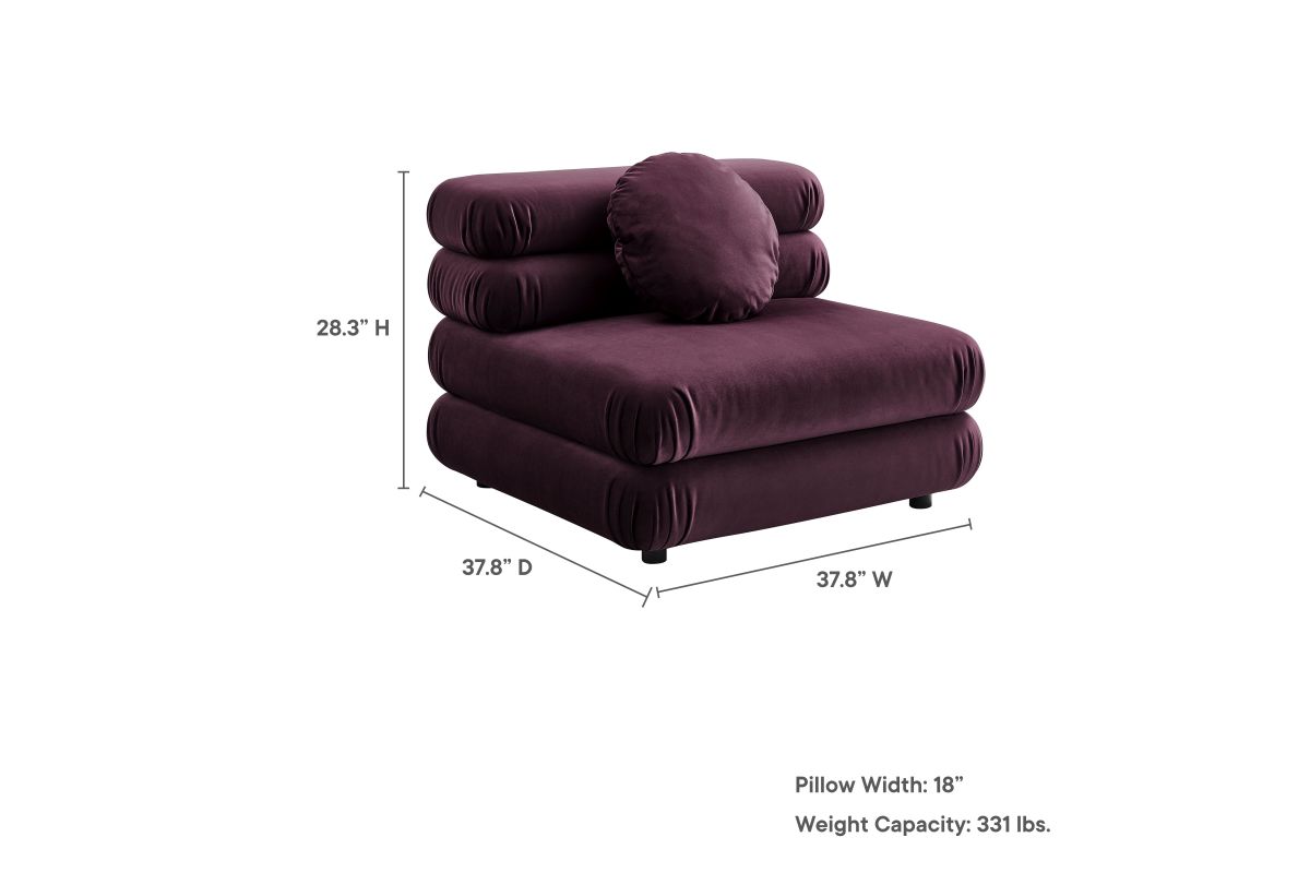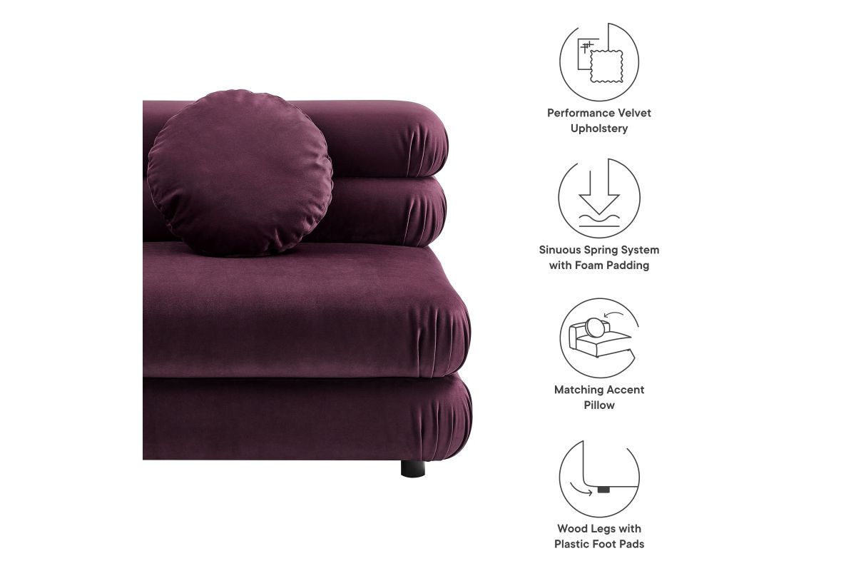Reimagine your living space with the Jubilee Performance Velvet Armless Chair, a striking blend of retro flair and modern comfort. With its sleek, armless design, the Jubilee Accent Lounge Chair provides a spacious seating experience without compromising on style. Designed as part of the Jubilee sectional sofa set, this modular single sofa chair works as a stylish accent chair or attaches to other Jubilee pieces with an alligator clamp couch connector, making it easy to add additional seating down the line. Draped in stain-resistant performance velvet fabric, this comfy living room chair exudes luxury with its dense foam padding and intricate detailing. The thick, gently tufted cushions are arranged in layers, creating a plush, stacked appearance with rounded edges for a cozy feel. The included 18" round pillow not only adds to its classic charm but also enhances the armless sofa chair's comfort and style, making it an inviting spot to relax. With premium zigzag spring pocket coils for robust support and comfort, Jubilee is the perfect oversized living room chair or bedroom chair for hours of lounging. Equipped with plastic foot pads to protect your floors, this single sofa with round pillow is the retro accent chair your modern decor needs. Assembly Required. Weight Capacity: 331 lbs.