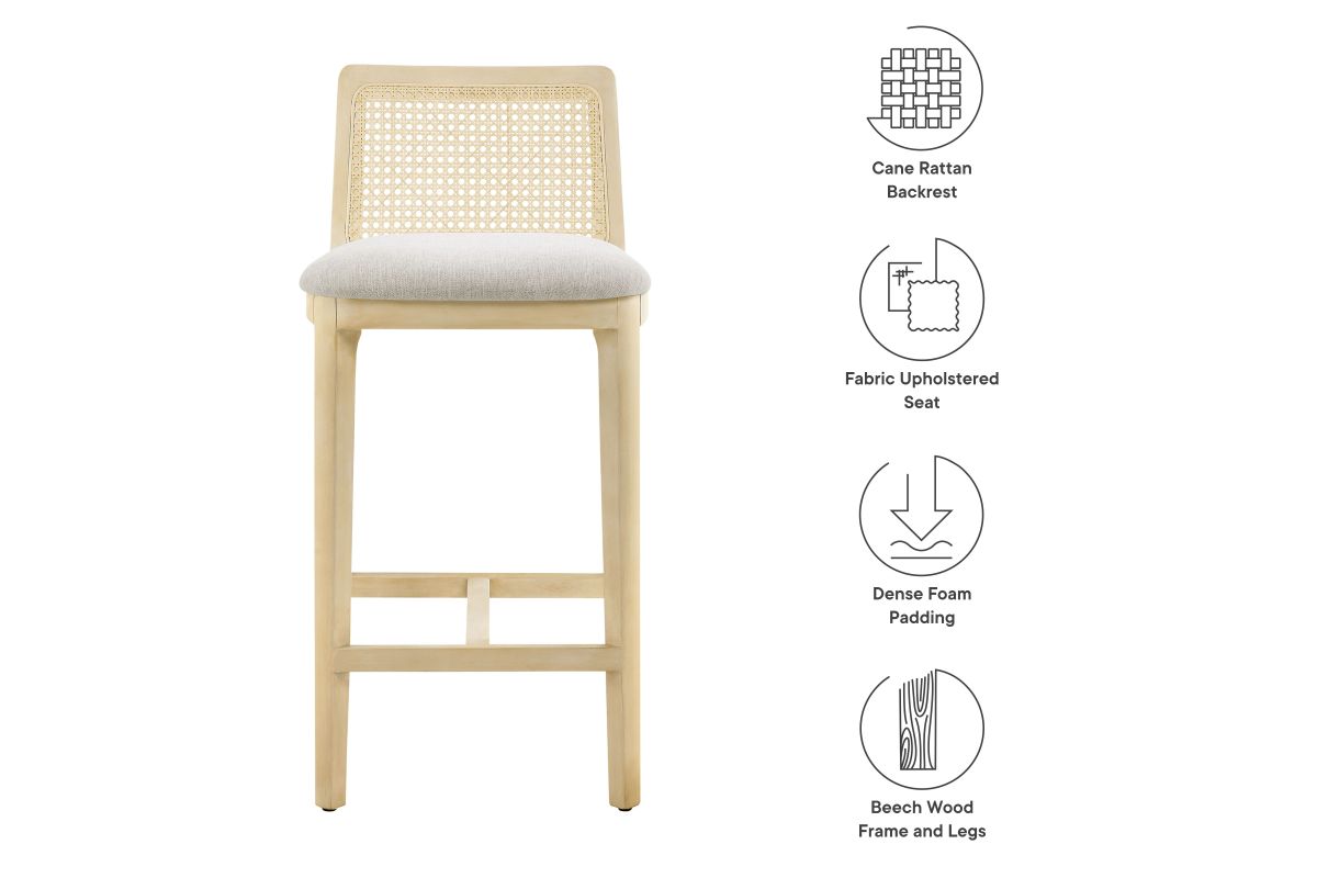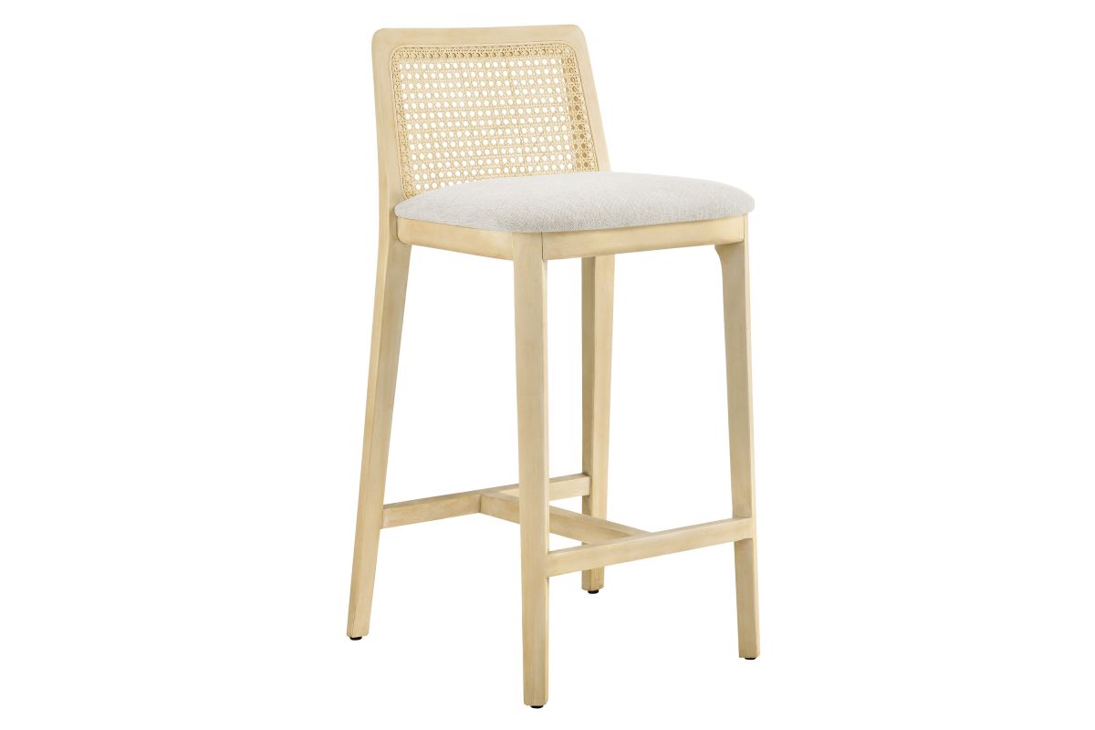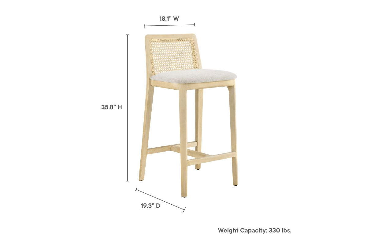 Elevate your kitchen or dining area with the Monarch Counter Stool, a stunning blend of French country elegance and modern farmhouse style. This wood counter stool features a sturdy beech wood frame and a rattan backrest with intricate cane webbing, granting both style and durability. The dense foam padded seat, covered in soft fabric upholstery, provides lasting comfort, making it a comfortable counter height chair perfect for longer gatherings. Designed as a modern stool for kitchen counters, Monarch offers versatile placement around a kitchen island or counter height table. Whether used as a single cane back counter stool or as a kitchen accent stool, it enhances your dining experience with its refined aesthetic and protects floors with its non-marking floor glides. This counter-height chair fits seamlessly into any d�cor, making it perfect for both formal gatherings and casual meals. The Monarch Counter Stool combines traditional craftsmanship with contemporary style, making it a versatile wood counter stool with a cane back for your kitchen or dining room. Weight Capacity: 330 lbs.