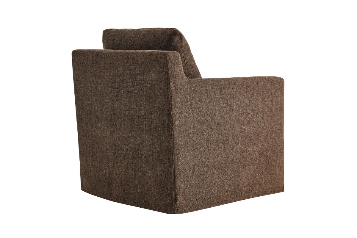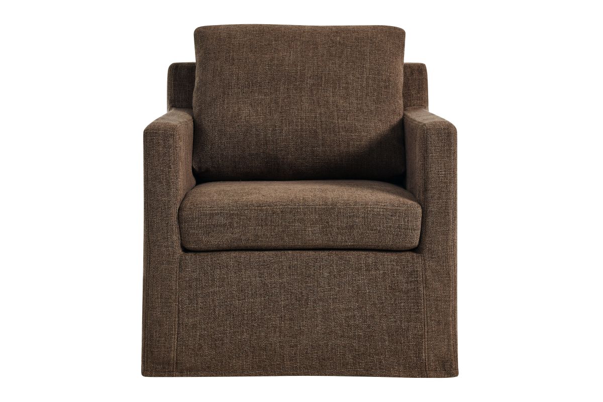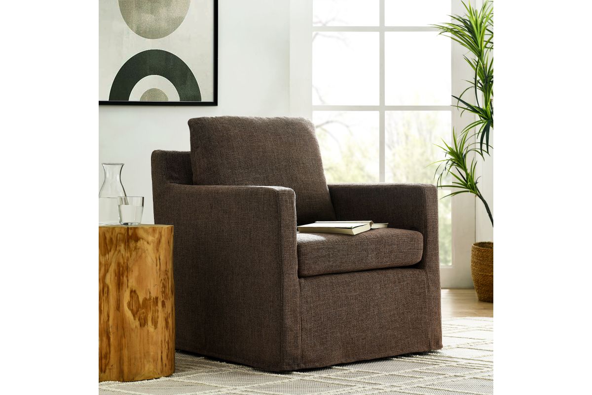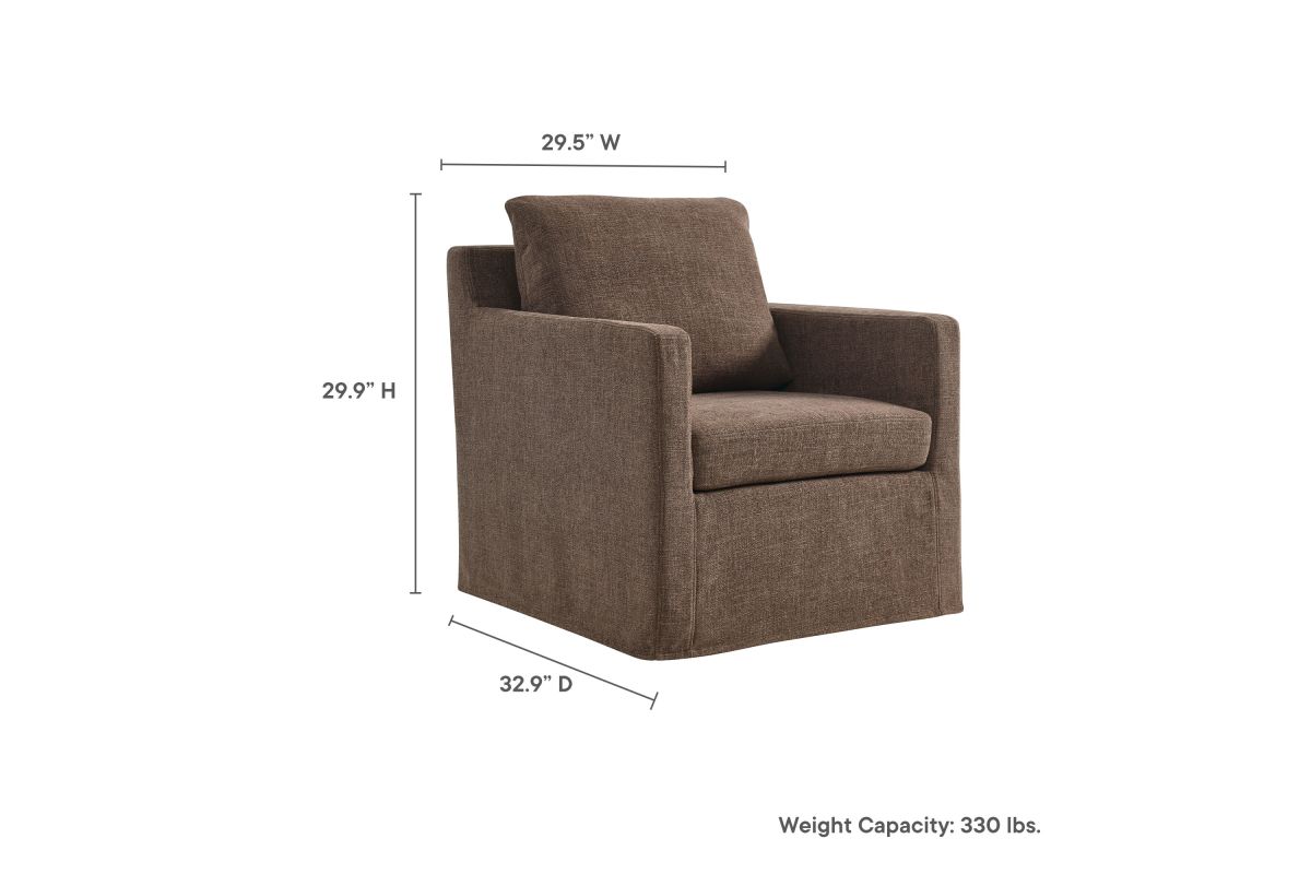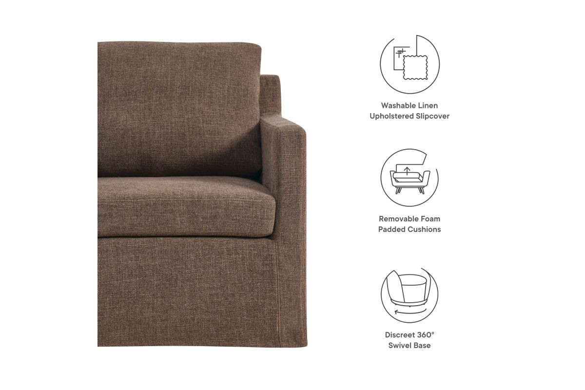 The Serene Slipcovered Swivel Armchair seamlessly combines modern elegance with superior comfort. Upholstered in premium linen, this fabric upholstered accent chair features a removable, washable slipcover, making cleaning and maintenance a breeze. The swivel chair�s crisp lines and tailored profile enhance any decor style, fitting well in both home and office environments. Enjoy a smooth 360-degree swivel with this modern linen fabric chair, supported by a robust yet discreet iron base with non-marking floor glides to protect your floors. Dense foam padding and removable cushions provide luxurious comfort and support. Perfect as a stylish accent piece, this linen fabric armchair is a versatile and functional addition to any space in your home. Whether used as an accent chair for bedroom or swivel chair for living room, it showcases a chic and modern look with its linen upholstery and generous cushioning. Assembly required. Weight Capacity: 330 lbs.