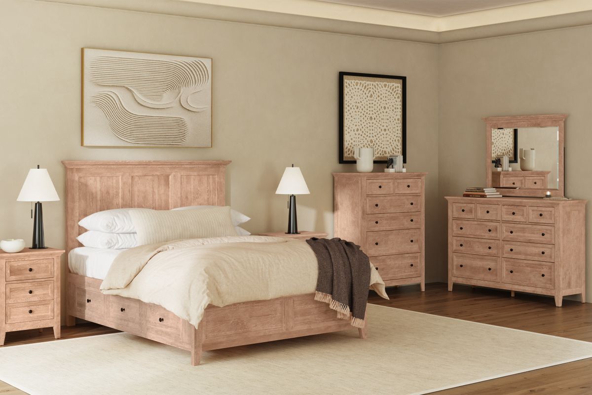 The San Mateo Collection is a solid wood bedroom suite available in a classic Natural finish. Choose between a storage or standard bed to give plenty of room for organization. All the drawers in this collection have full extension drawer glides for easy open and close. The dresser and chest feature Cedar bottom panels that line the bottom drawers. The San Mateo is a gorgeous bedroom set that will last in function and style.