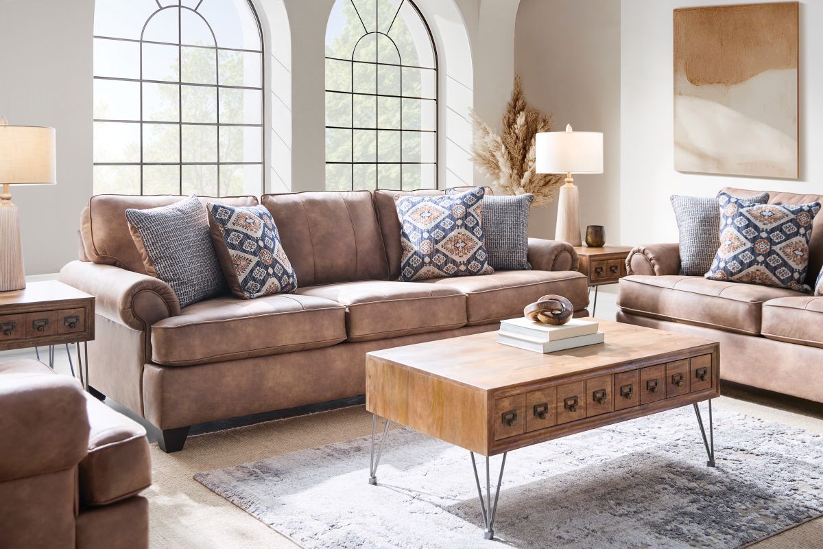 The Austin Collection offers a perfect balance of comfort, style, and timeless appeal. This collection, which includes a sofa, loveseat, chair, and ottoman, is designed to create a warm and inviting atmosphere in your home. Its casual rustic style features classic rolled arms and tapered block feet, blending traditional elegance with modern durability. Upholstered in a rich camel fabric with a soft, luxurious hand, this collection not only looks great but feels even better. Each piece is crafted with quality construction to ensure lasting comfort and support, making it perfect for everyday living. The generous, deep seating and plush cushions provide ample space for relaxing or entertaining, while the cohesive design brings a touch of rustic sophistication to your space. Transform your living room into a cozy retreat with the Austin collection—crafted for those who value both style and comfort.