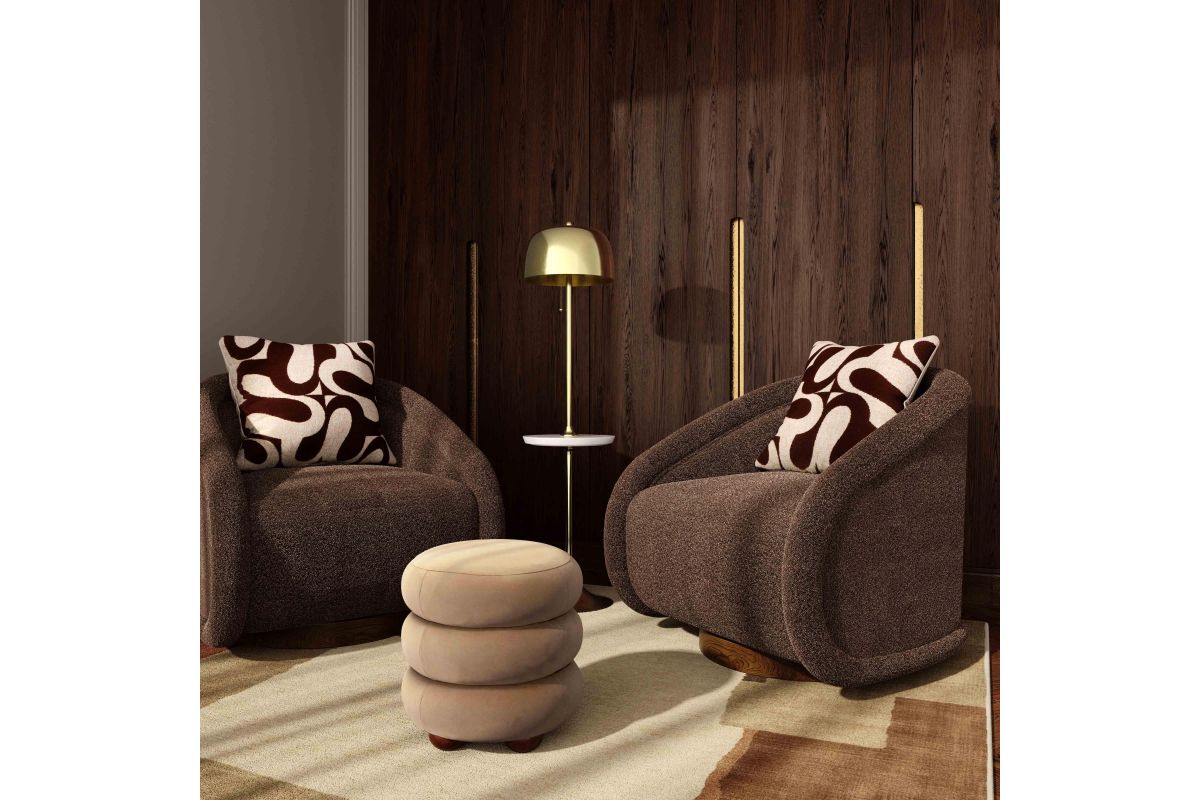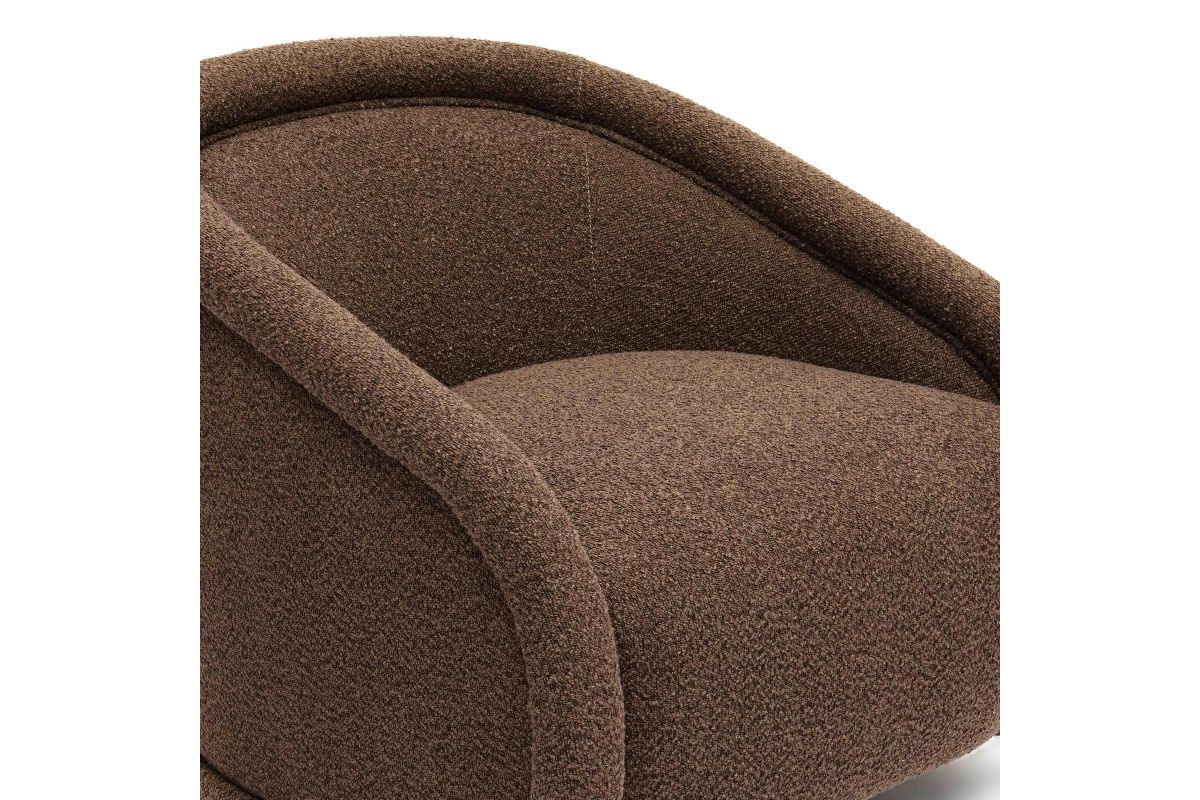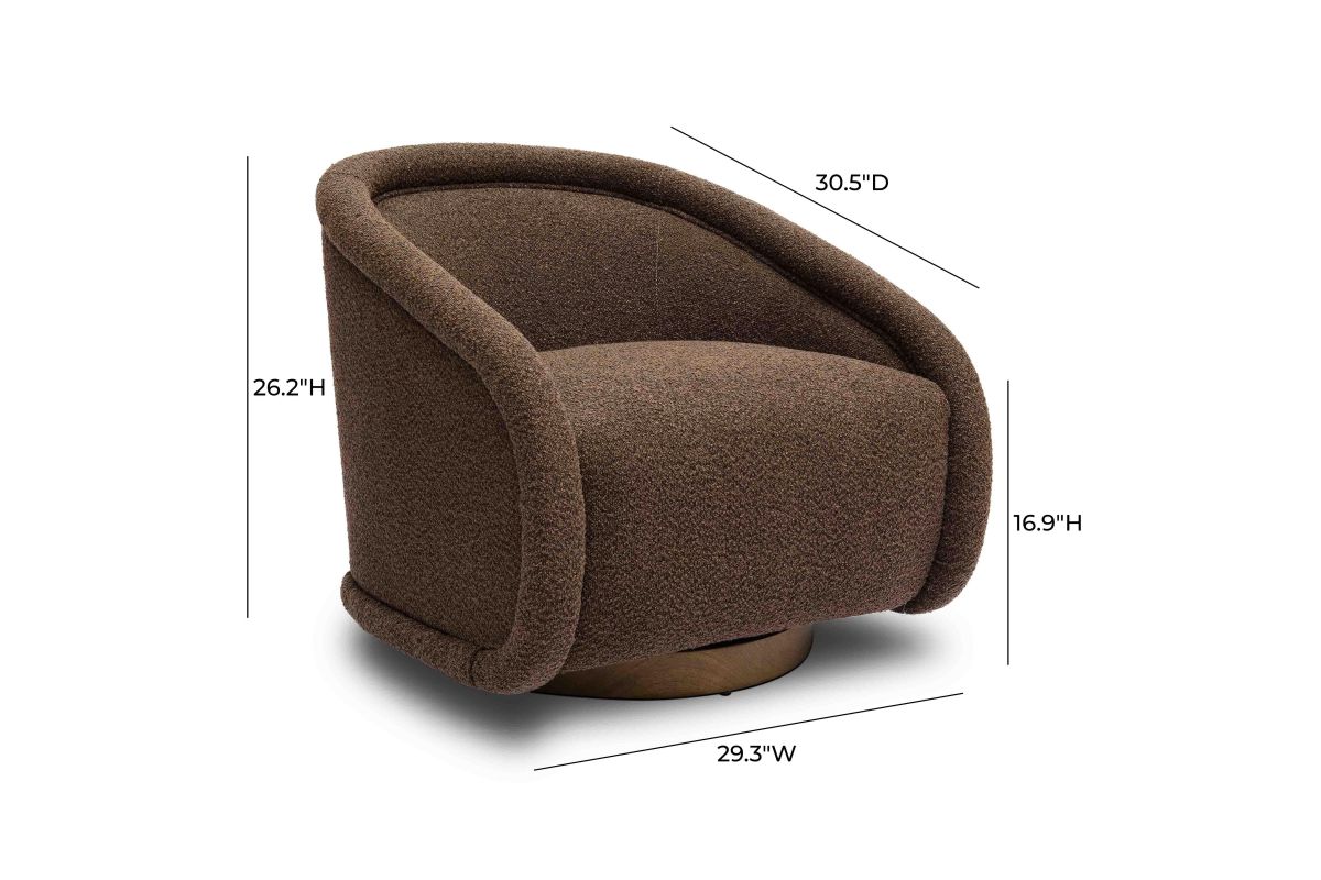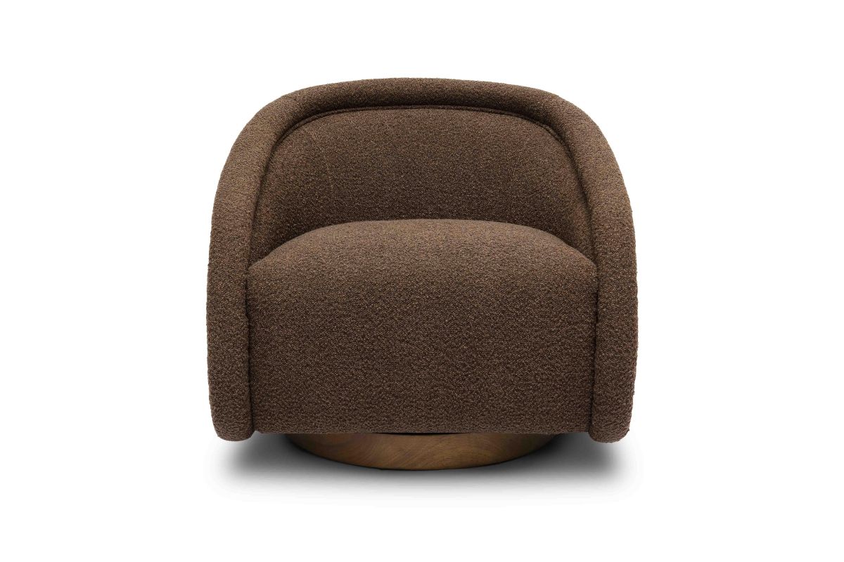 Introducing the Rory Boucle Swivel Chair, available in rich chocolate brown or sophisticated grey. Designed with a solid wood base and a swivel function, its wrapped shelter arm and wide, deep seat offer unparalleled comfort and the perfect space to accessorize with your own pillow. The sensuous sloping back ensures this chair remains a stunning focal point, no matter where it's placed in the room.