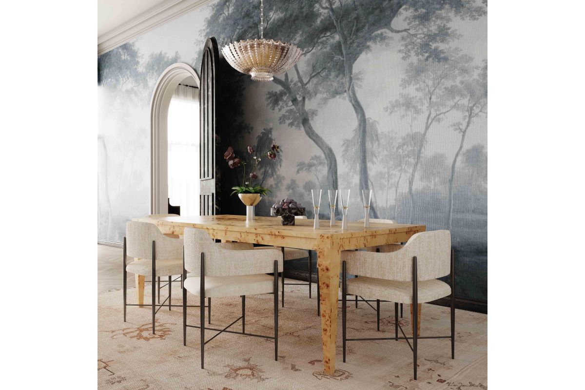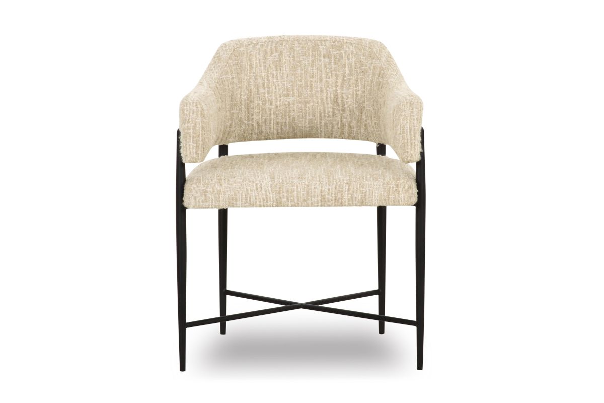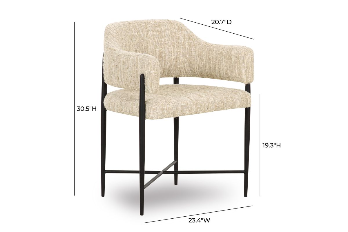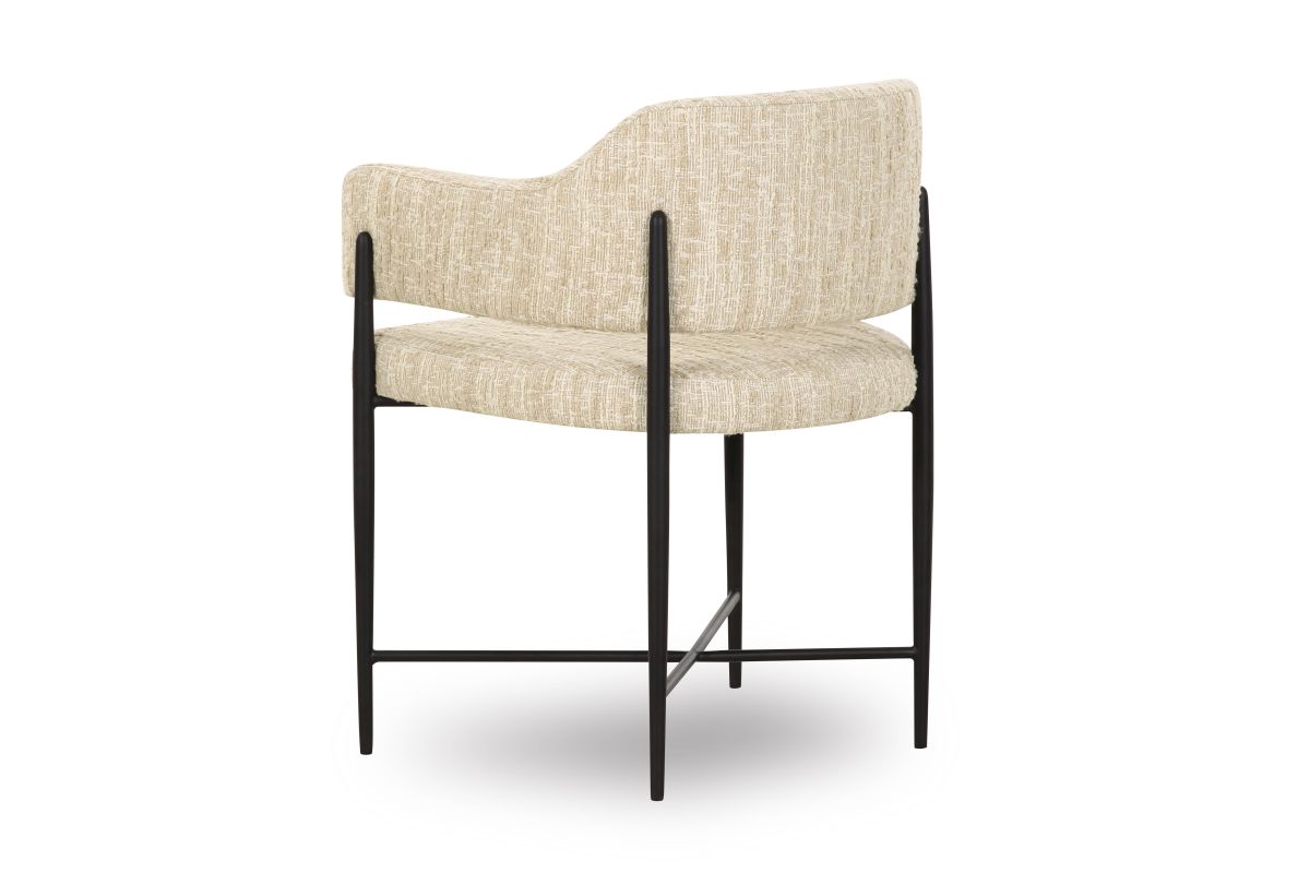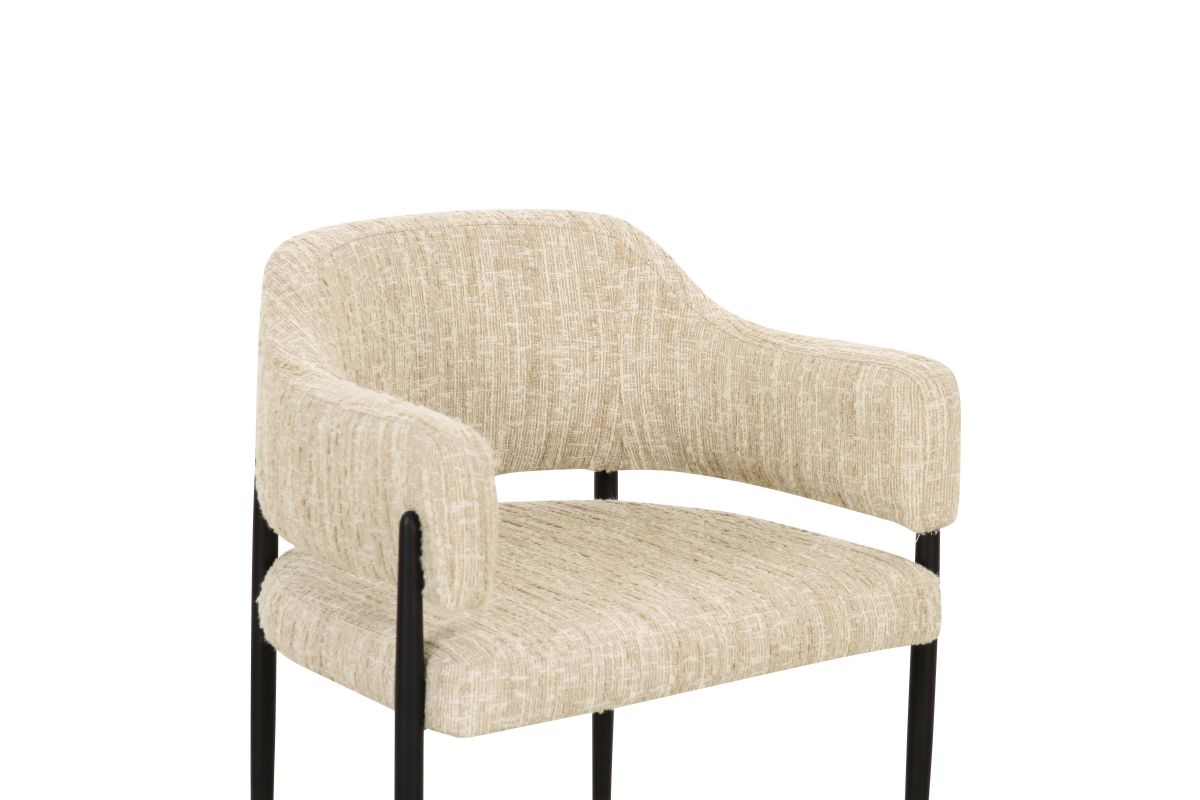 Transform your dining space with the stunning Sezanne Dining Chair, offered in Cream Textured Boucle and Cream or Tan Vegan Leather. Featuring a black iron-finished metal frame, this art deco-inspired chair combines artsy flair with modern usability, offering excellent comfort and a polished look that complements any trendy dining room. The highly textured, liquid-repellent fabric and easy-to-clean vegan leather make it as practical as it is stylish.