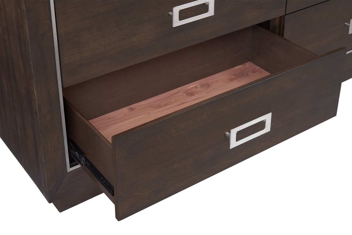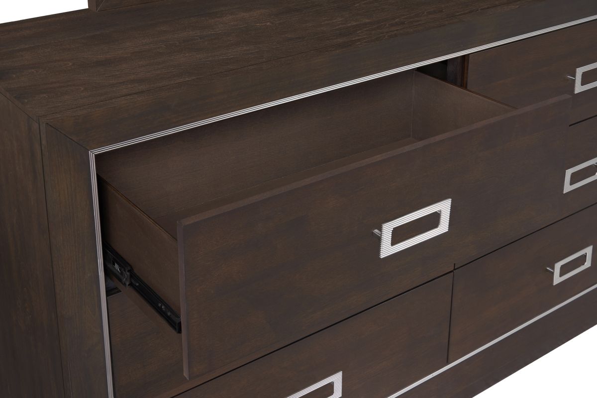 Alexis dresser and mirror set features a sleek, contemporary design with a bold, modern appeal. The dresser is constructed with a dark Tabacco finish, accented by a contrasting lighter metal trim around its edges, giving it a refined, framed look. It includes six spacious drawers with rectangular, metal pull handles in a polished, metallic finish, enhancing its modern style while providing easy access to storage.