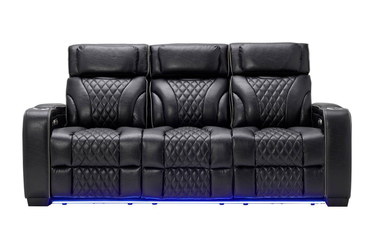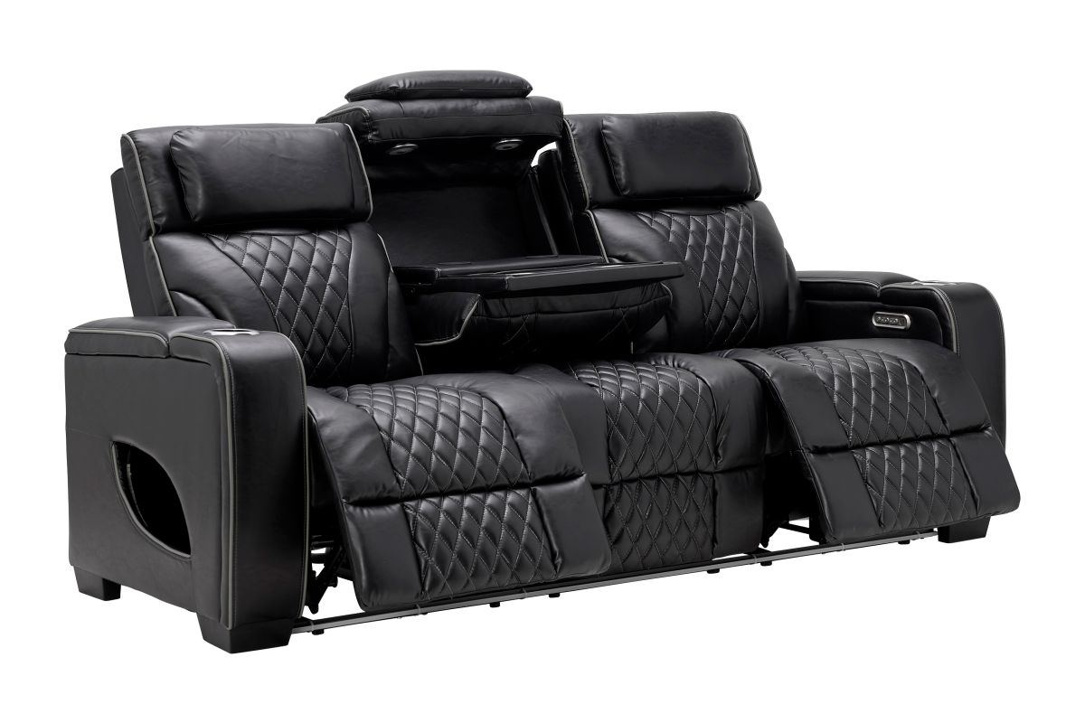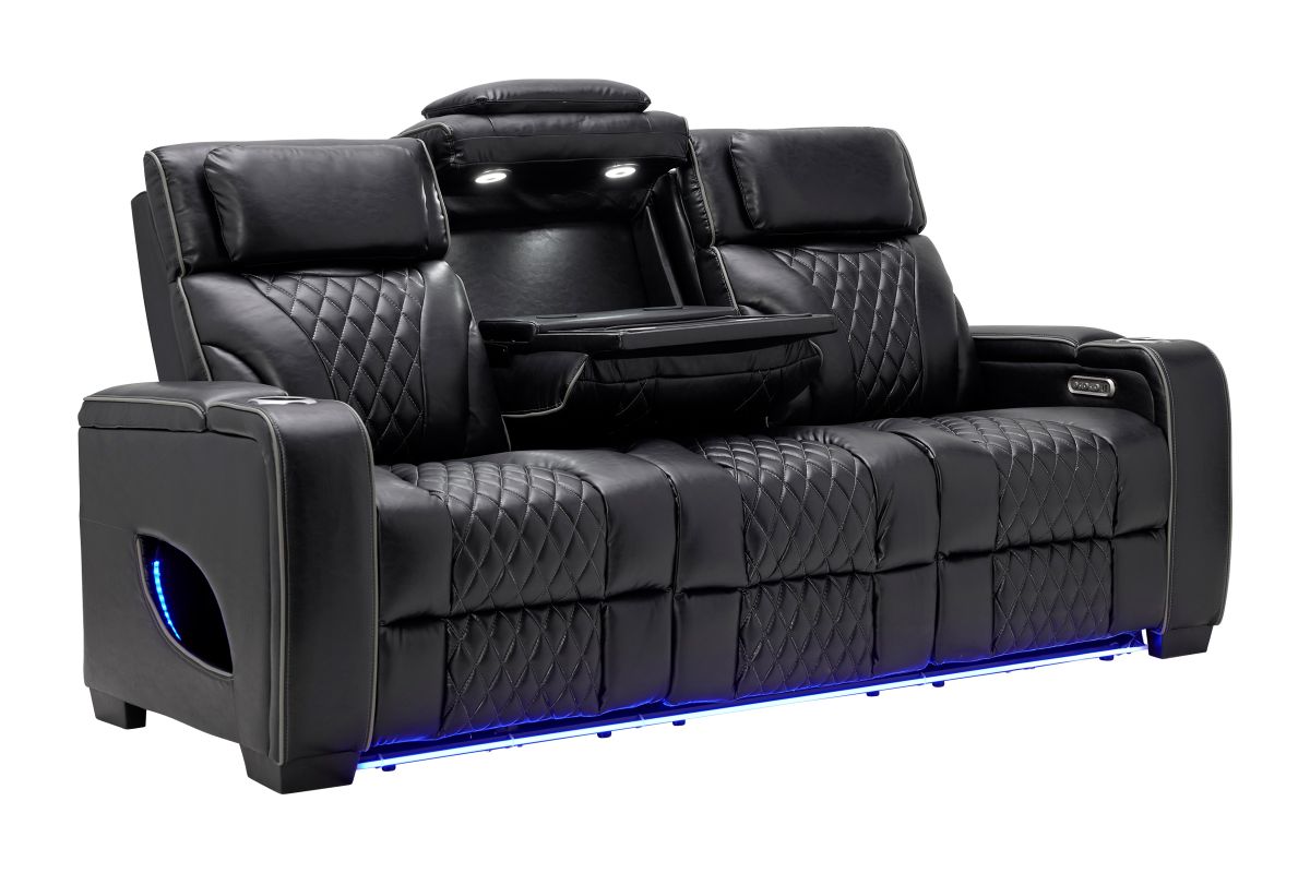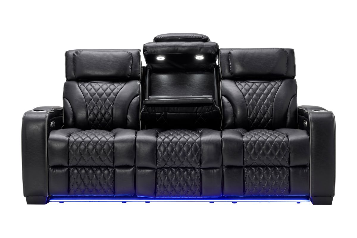Unwind in bold style with the Zodiac Dual Power Reclining Sofa, built for next-level comfort and entertainment. The center back cushion flips down to reveal a drop-down table with cupholders and charging ports—perfect for snacks, drinks, and keeping devices powered up. Ambient LED lighting along the front and side panels creates a high-end theater glow, while diamond-quilted stitching adds a touch of luxury to the plush black upholstery. Designed for style, built for relaxation—this collection transforms your living room into a luxurious entertainment zone.