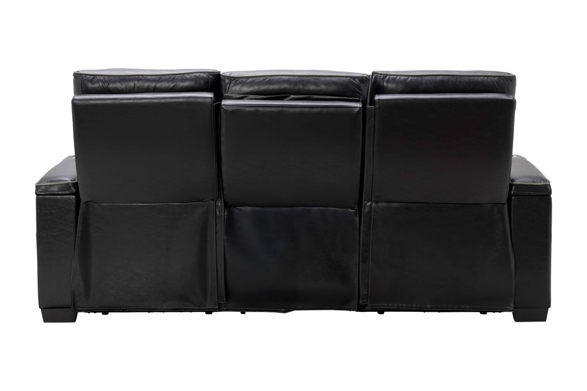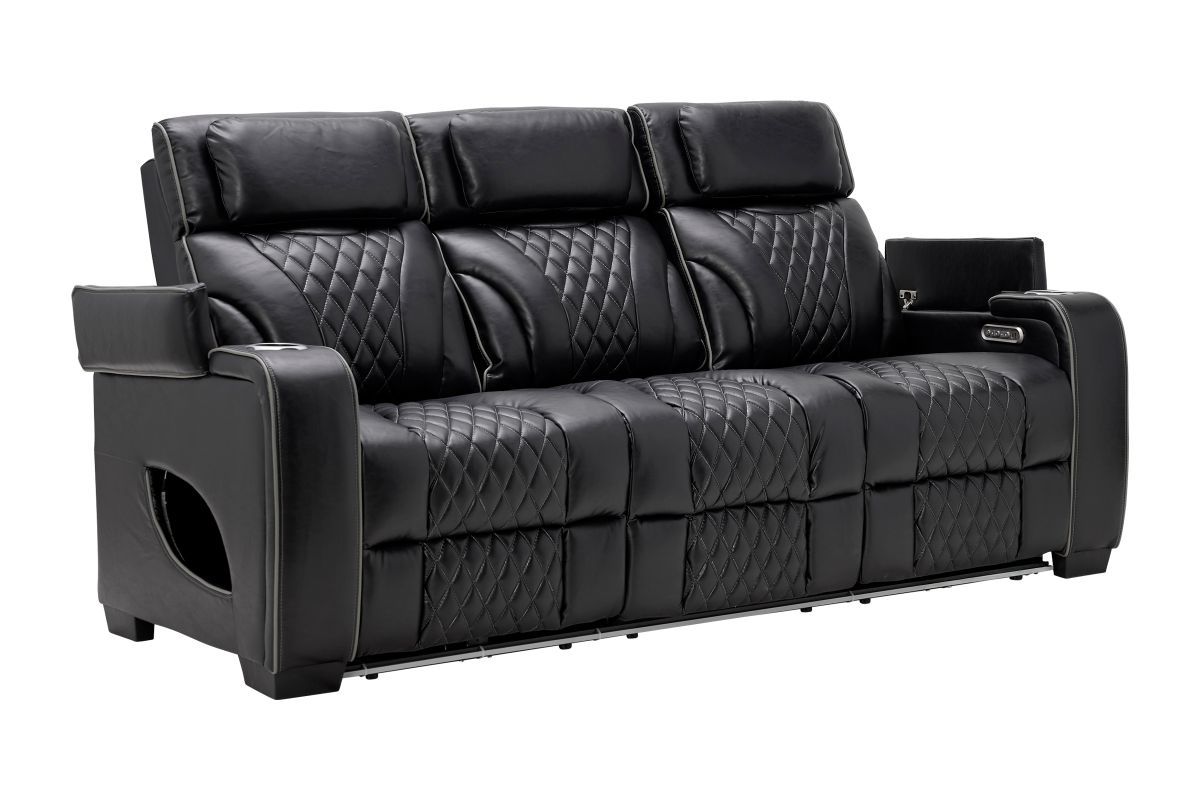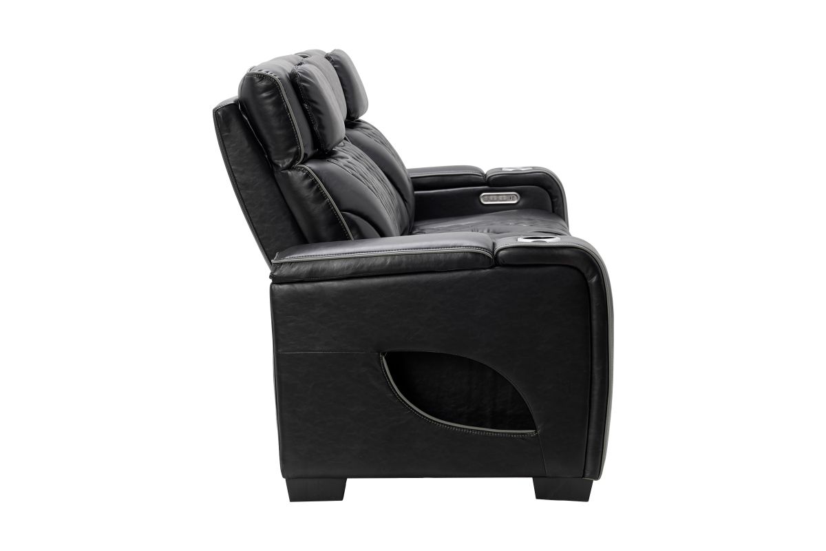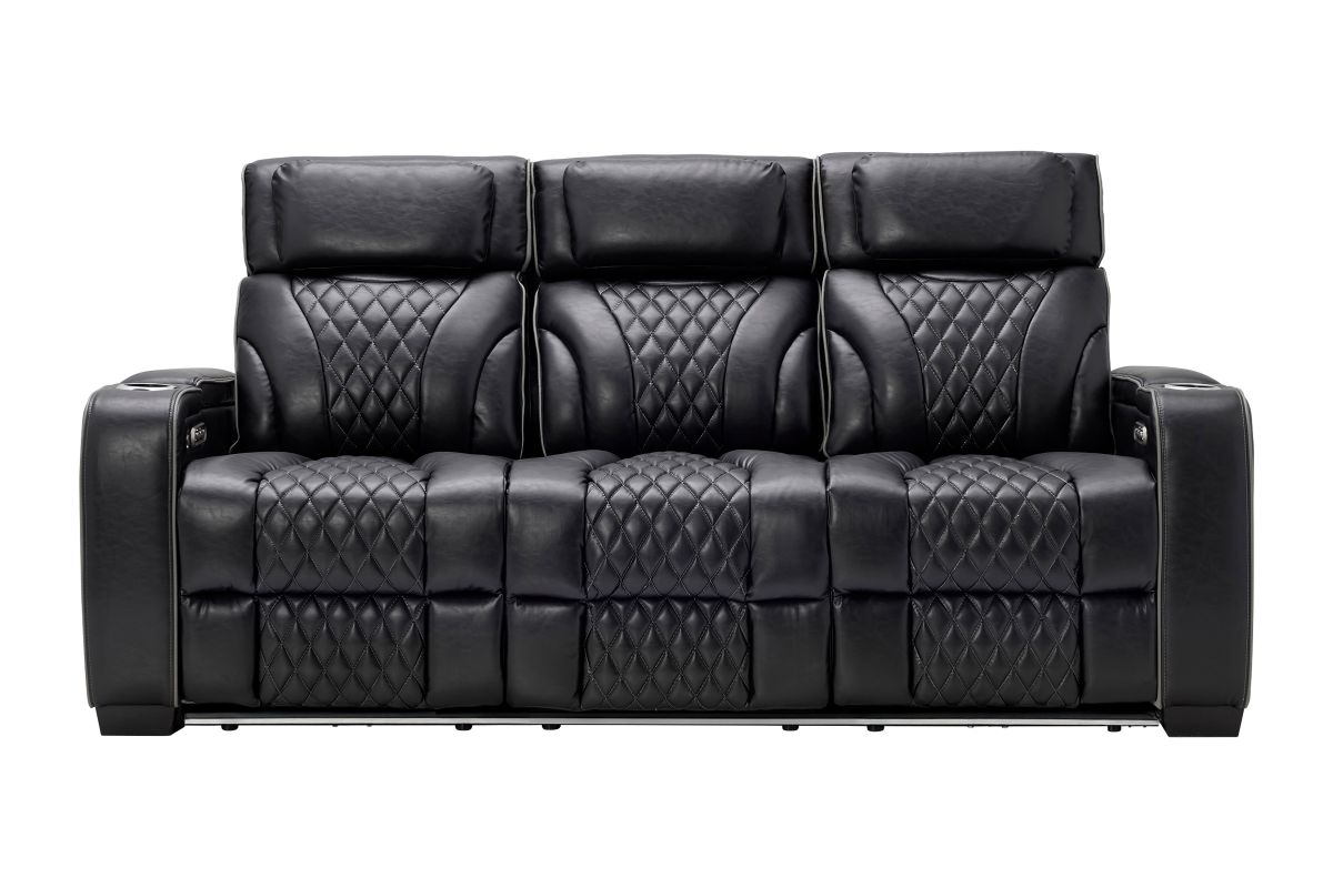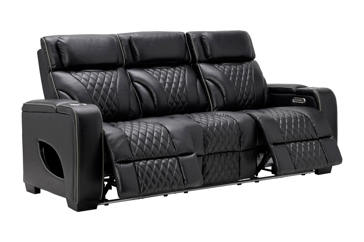 Unwind in bold style with the Zodiac Dual Power Reclining Sofa, built for next-level comfort and entertainment. The center back cushion flips down to reveal a drop-down table with cupholders and charging ports—perfect for snacks, drinks, and keeping devices powered up. Ambient LED lighting along the front and side panels creates a high-end theater glow, while diamond-quilted stitching adds a touch of luxury to the plush black upholstery. Designed for style, built for relaxation—this collection transforms your living room into a luxurious entertainment zone.