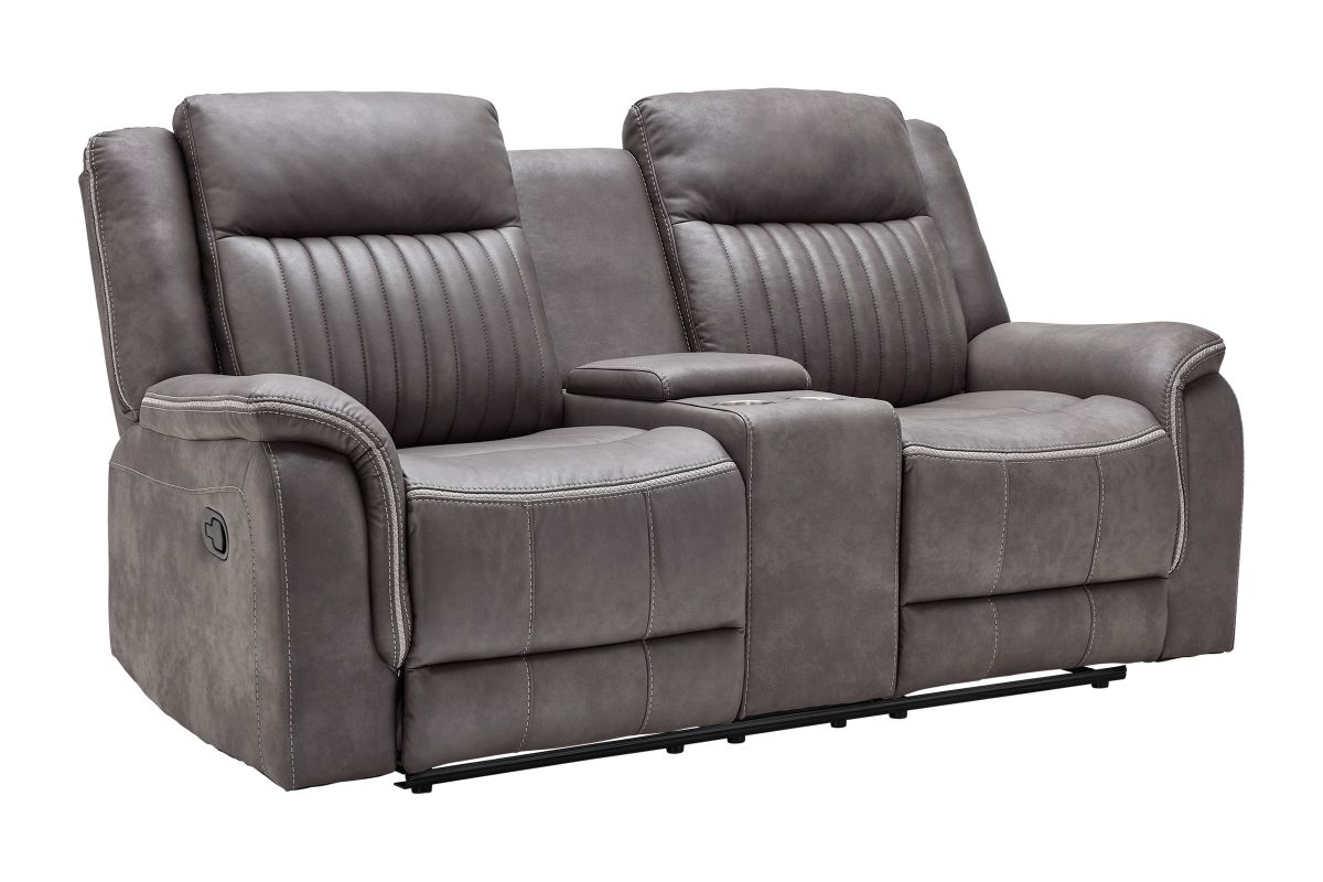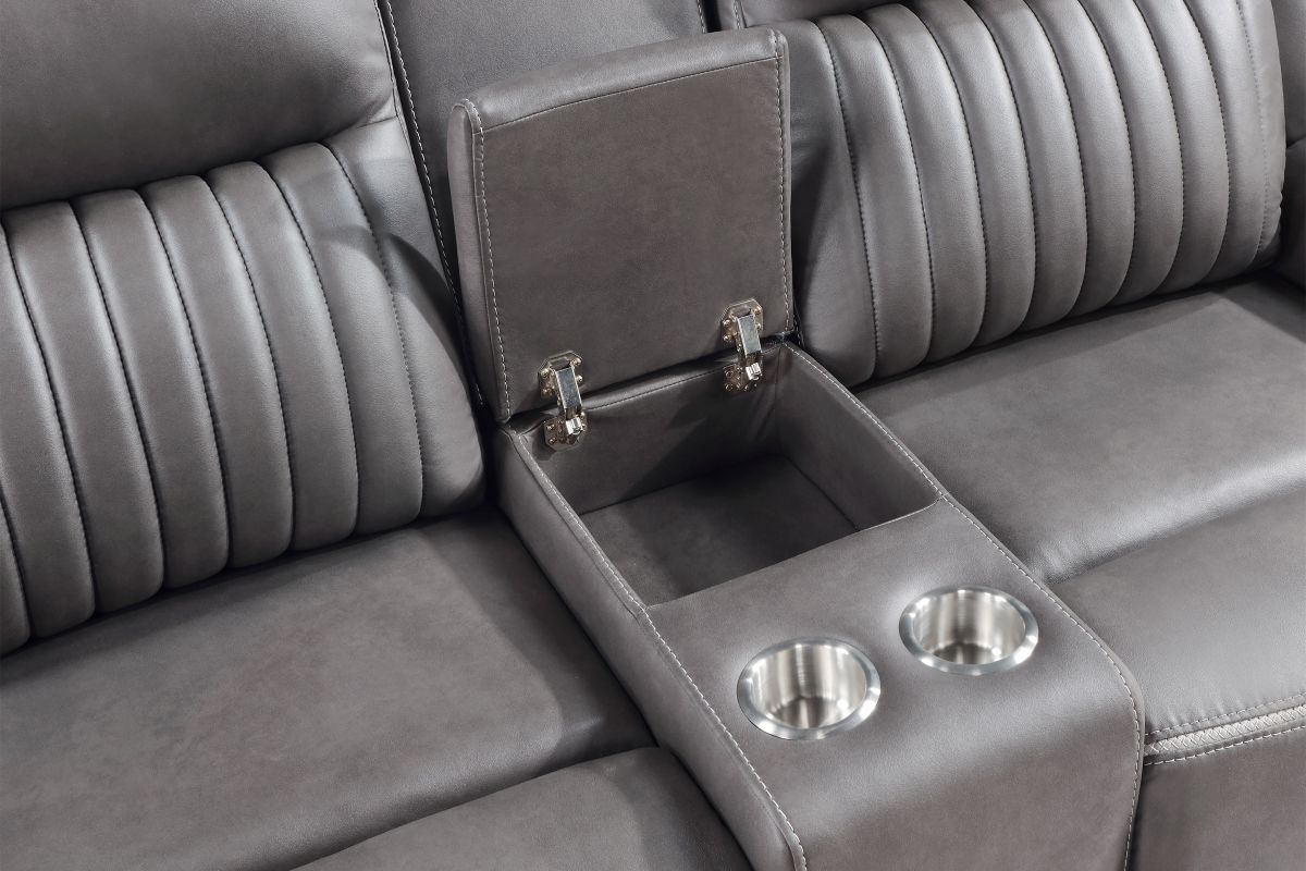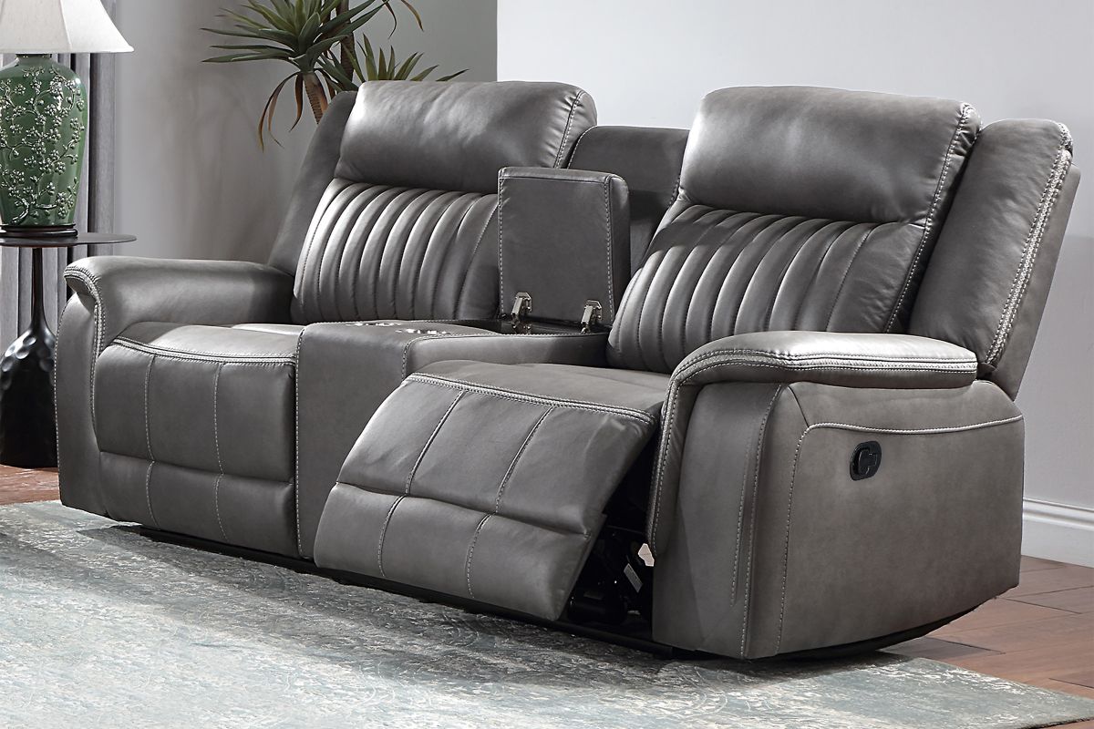 Upgrade your relaxation experience with the Tyson living room collection, designed for both style and ultimate comfort. Upholstered in sleek gray faux leather, this set includes a reclining sofa, console loveseat, and recliner, offering plush seating with a contemporary edge. Featuring effortless reclining at the pull of the lever, this set provides customized comfort with high-density cushions and supportive backrests for all-day relaxation. The loveseat includes a convenient storage console with built-in cup holders, keeping essentials within reach. Whether you're hosting guests or unwinding after a long day, the Tyson reclining set brings modern luxury and everyday functionality to your home.