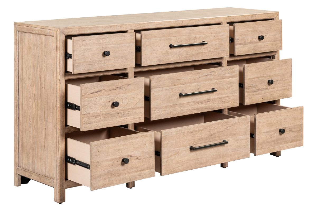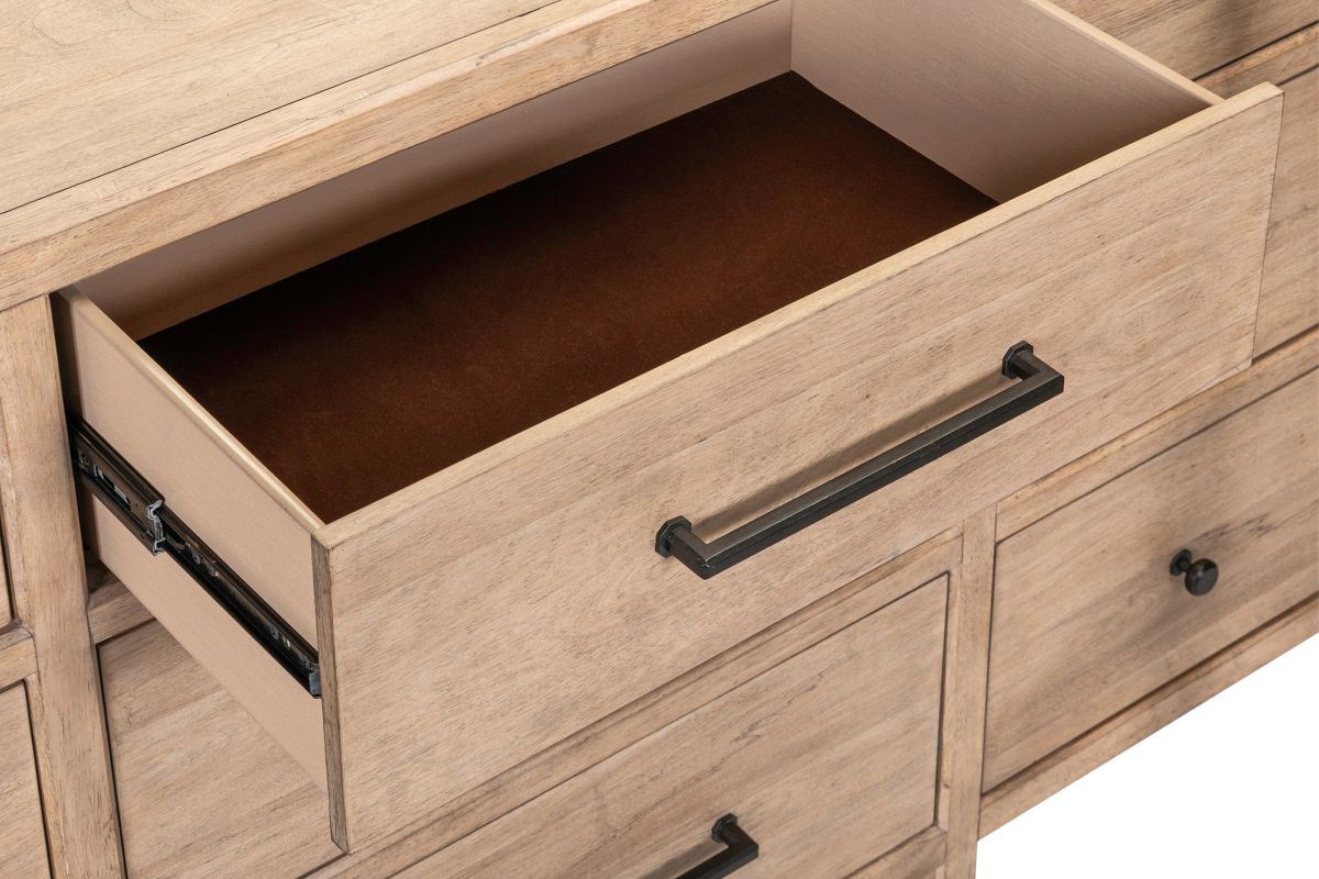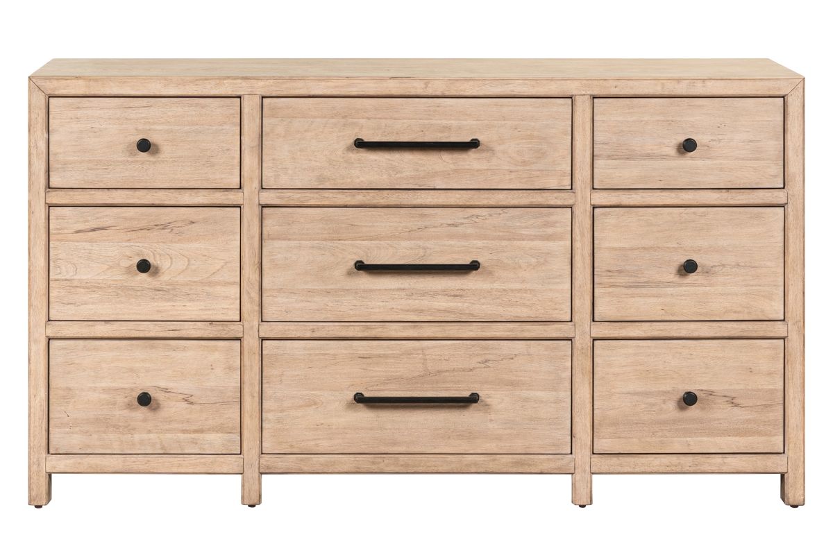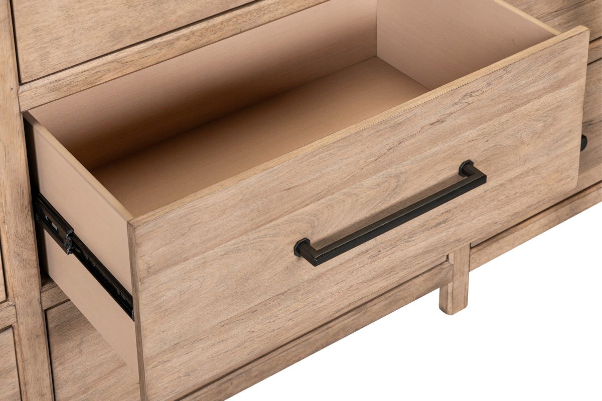 The Monroe Dresser Features faceted dark iron knobs and bar pull hardware, adding a striking contrast to the wood's natural finish. Built with high-quality craftsmanship, incorporating French and English dovetail construction for durable and sturdy drawers.