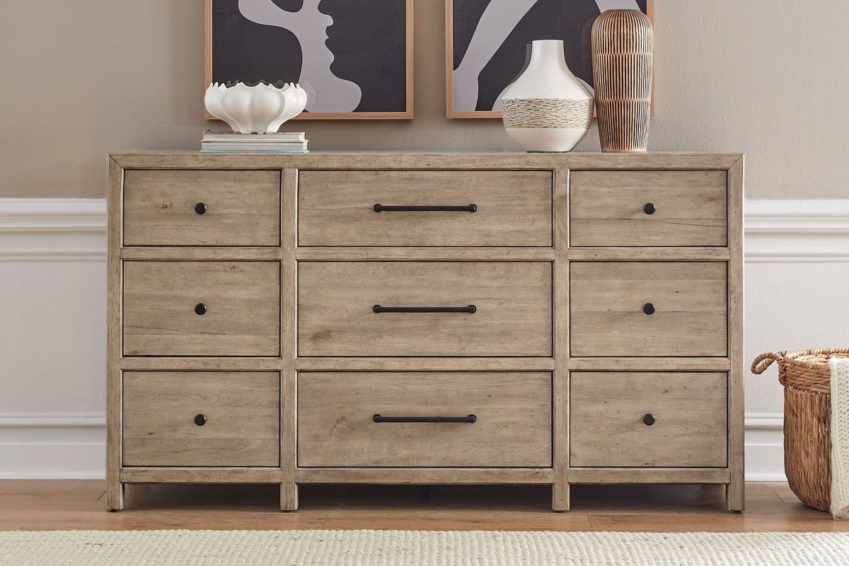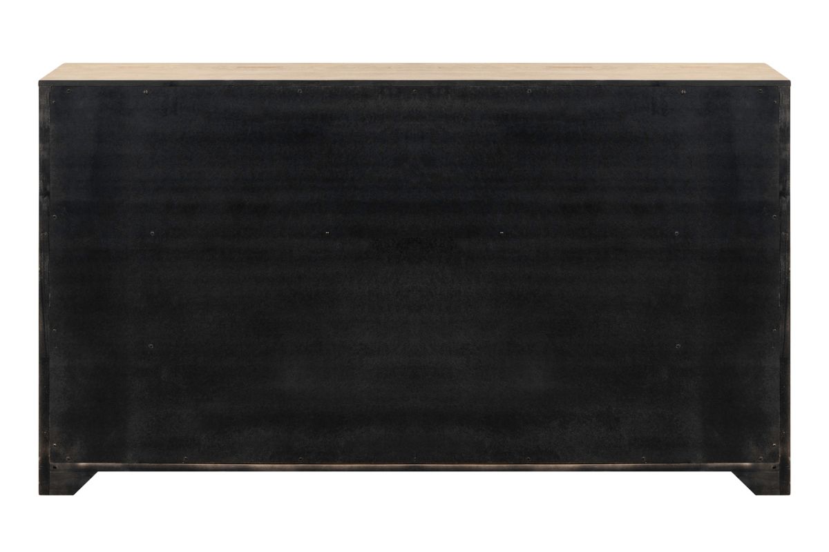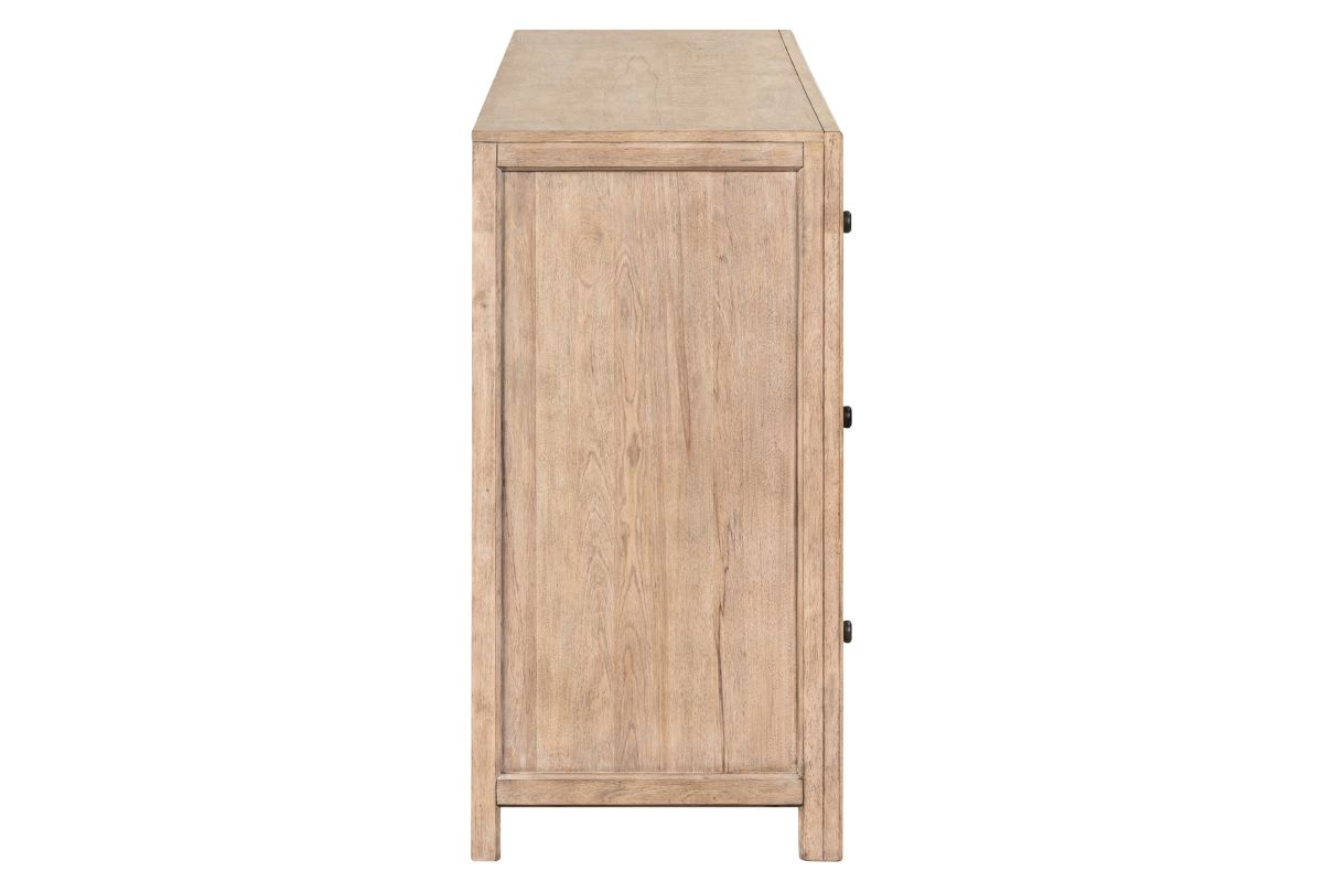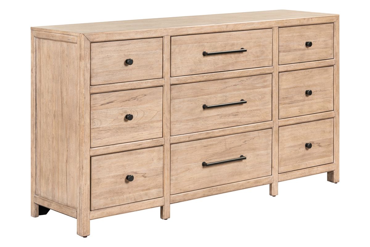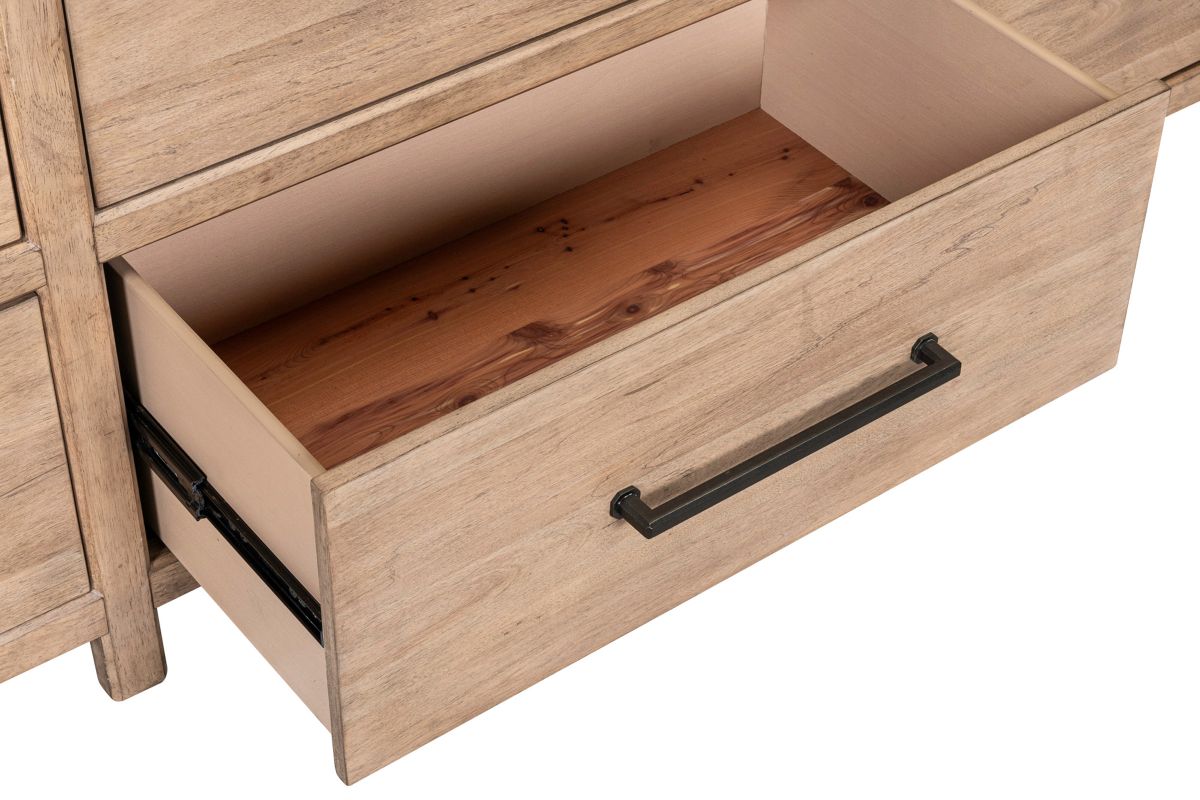 The Monroe Dresser Features faceted dark iron knobs and bar pull hardware, adding a striking contrast to the wood's natural finish. Built with high-quality craftsmanship, incorporating French and English dovetail construction for durable and sturdy drawers.