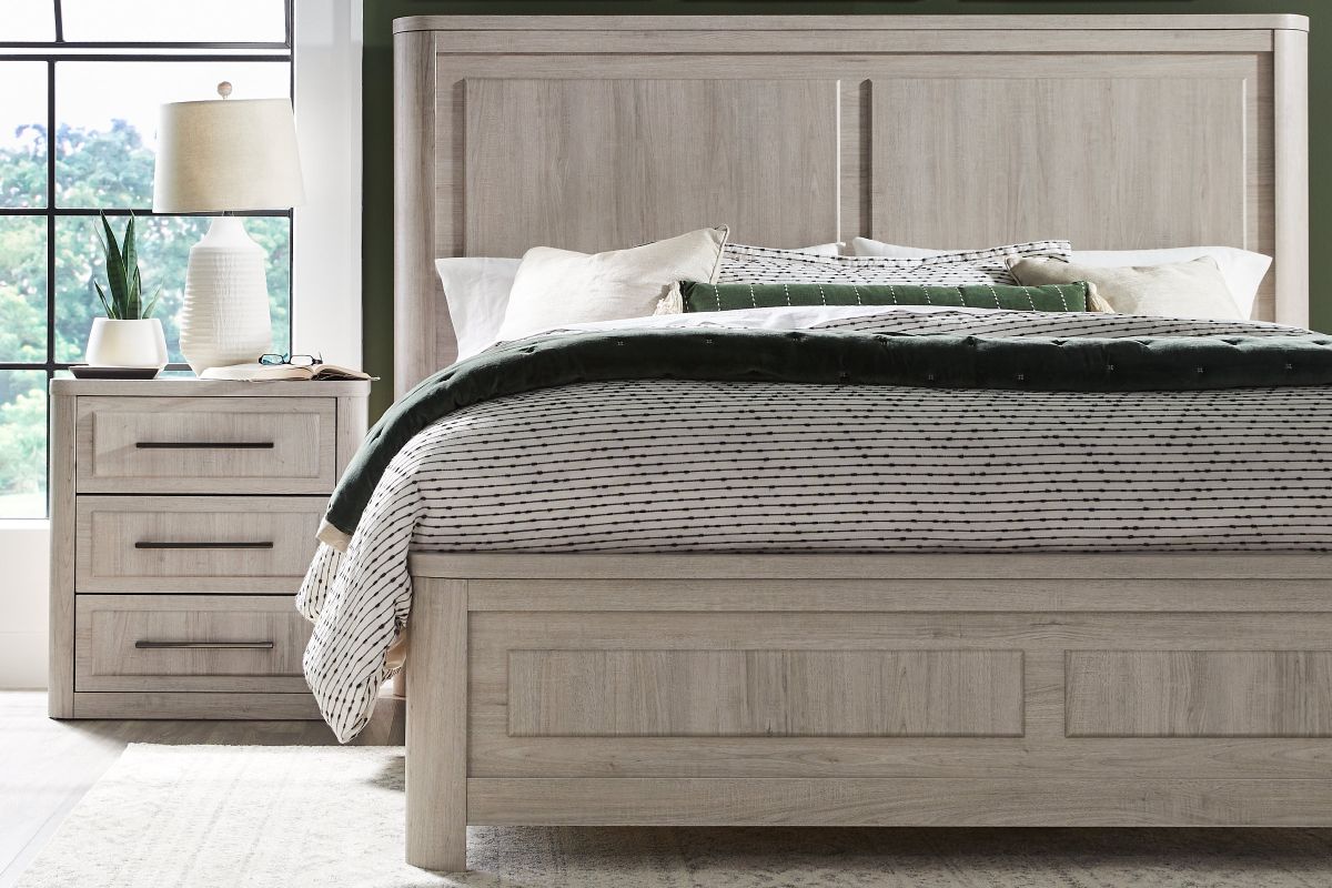 The Easton Queen Bed showcases a clean, modern aesthetic with natural tones and durable materials.