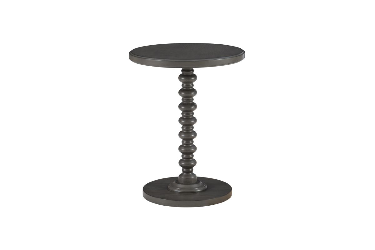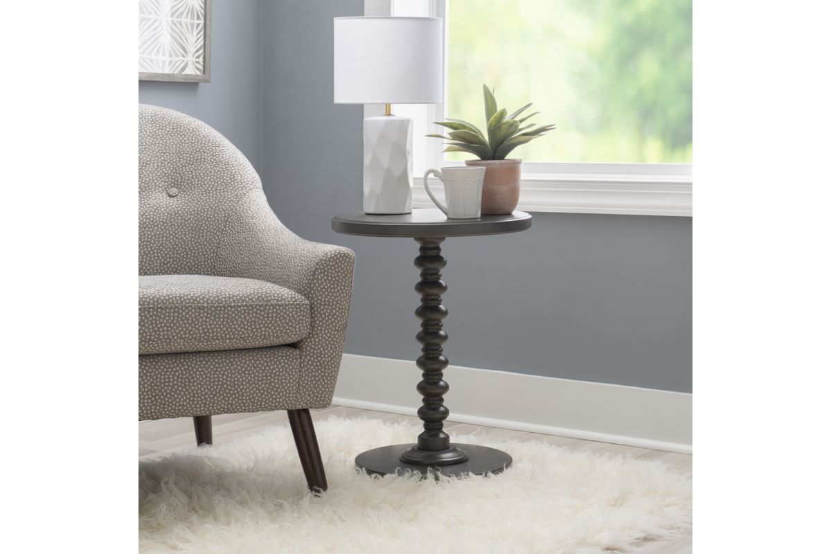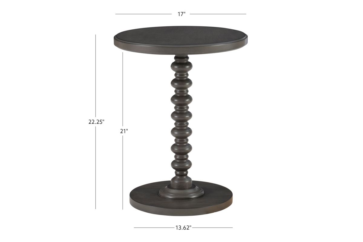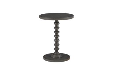 A gorgeous accent table in a rich dark grey color that will help liven up your space by adding a bit of elegance. Made from solid wood, it features a sturdy pedestal base with a turned spindle that is complemented by the clean lines of the round tabletop. This accent table looks just right next to your favorite living room armchair, or even serving as a cute table in the entryway. There's plenty of room on its 17 inch diameter surface for a framed family photo, a scented candle and your favorite magazines.