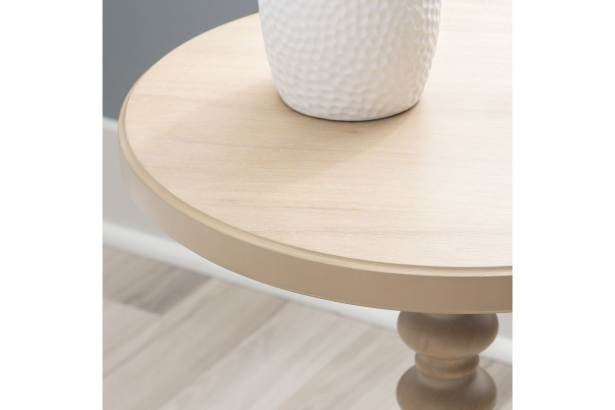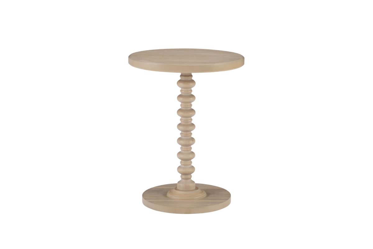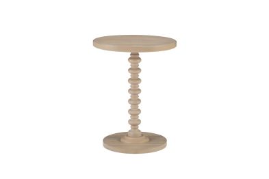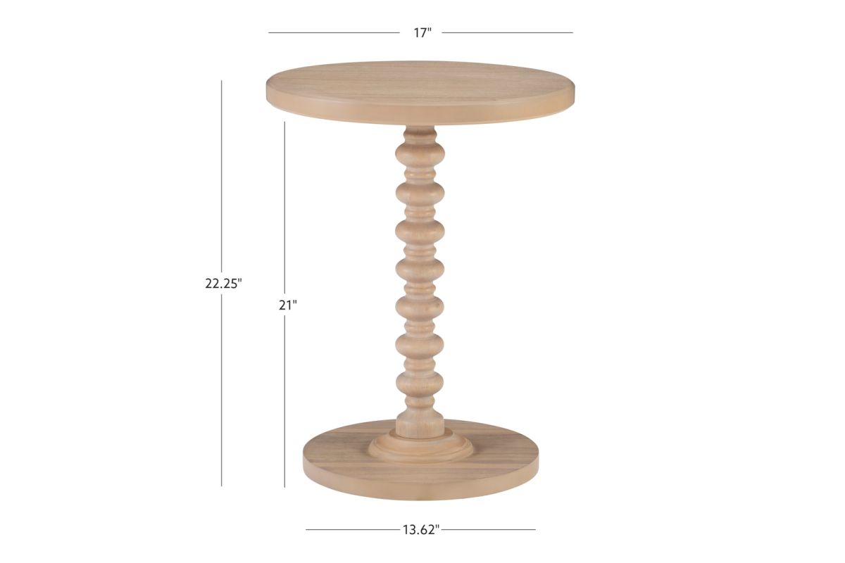 A gorgeous accent table in a natural wood finish that will help liven up your space by adding a fun bit of flair. Made from solid wood, it features a sturdy pedestal base with a turned spindle that is complemented by the clean lines of the round tabletop. This accent table looks just right next to your favorite living room armchair, or even serving as a cute table in the entryway. There's plenty of room on its 17 inch diameter surface for a framed family photo, a scented candle and your favorite magazines.