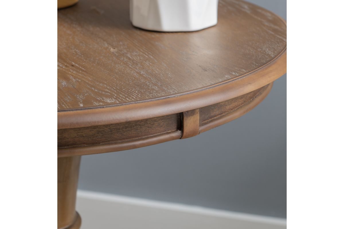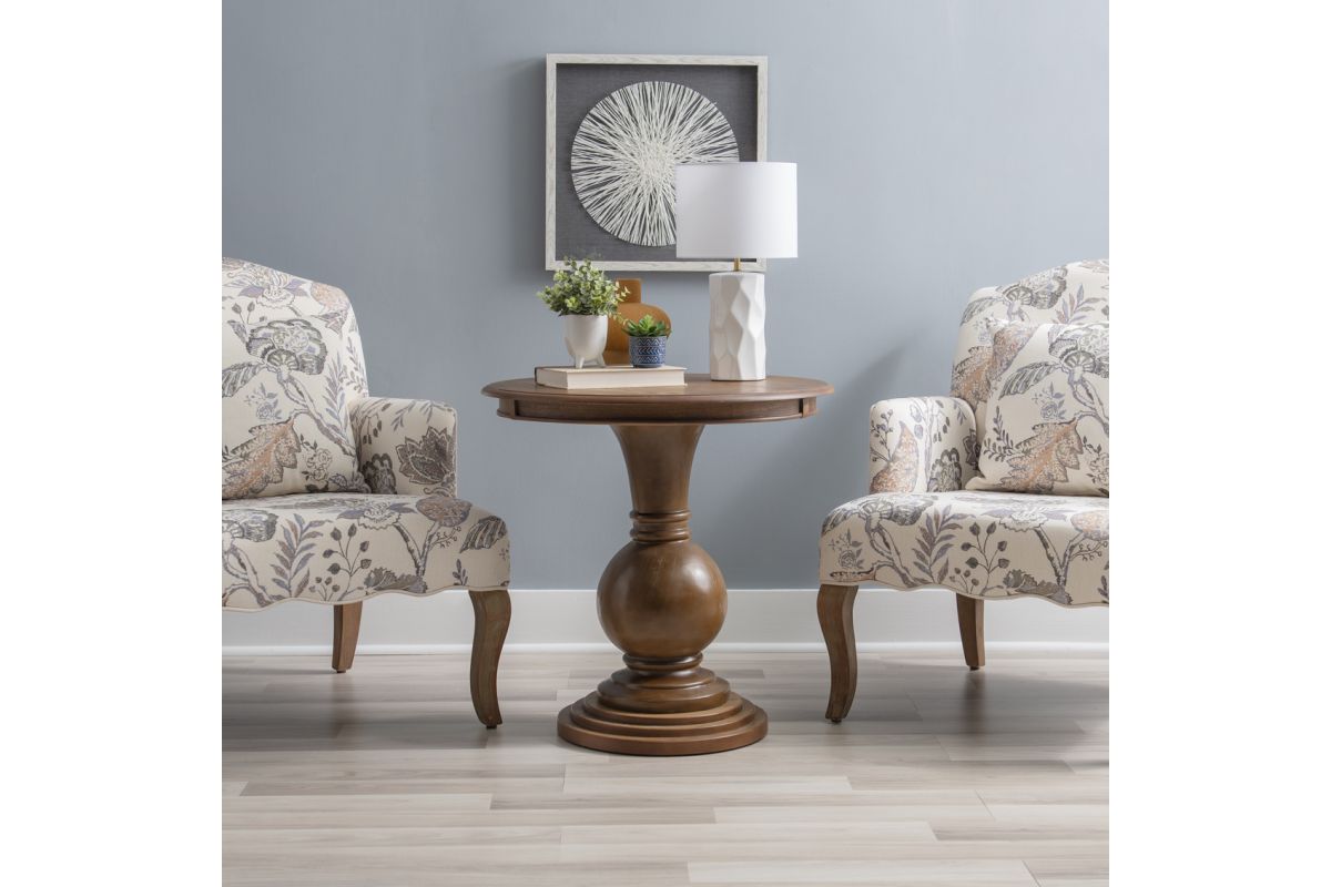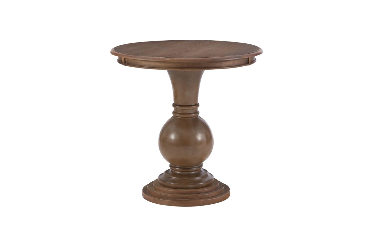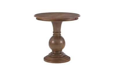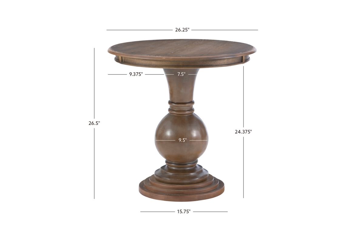 This circular accent table features a stepped base and turned pedestal that come together to create a timeless and sophisticated piece. Measuring at 26� l x 26� d x 26� h, it is ideal for placement next to a couch or set of chairs in your living room, as an extra surface in your bathroom or as additional table space wherever you like to entertain. The natural finish lends itself to a rustic charm, highlighting slight imperfections and blemishes in the wood. Simple assembly is required upon arrival.
